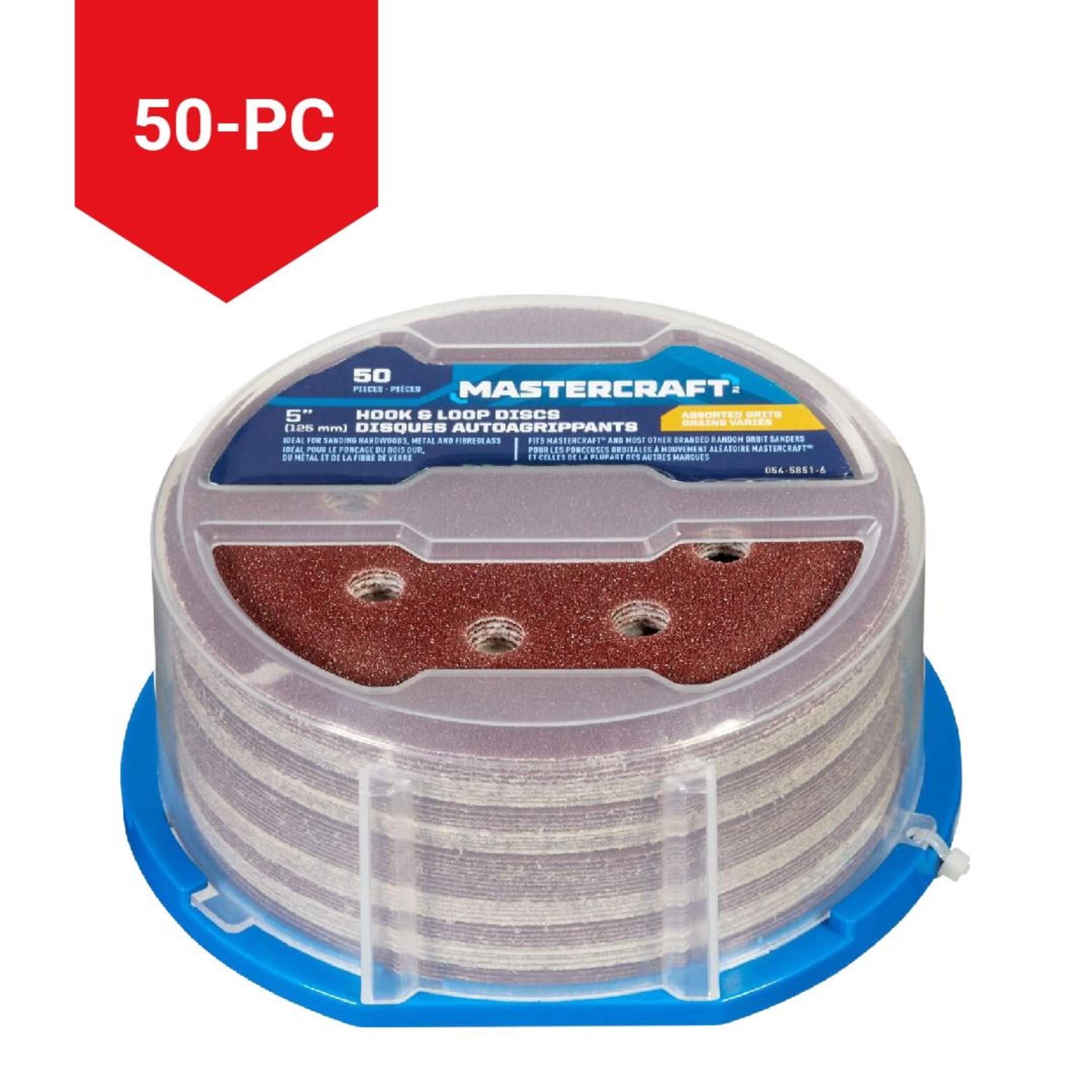 The Mastercraft 5-in hook-and-loop discs orbital sandpaper set features a powerful aluminum oxide grit to make sanding tasks easier. This orbital sandpaper set features discs with a convenient near-universal design that makes them compatible with the majority of Mastercraft and other branded orbit sanders. The set includes sandpaper sheets with a variety of grits and a convenient travel case to keep the discs secure and organized.