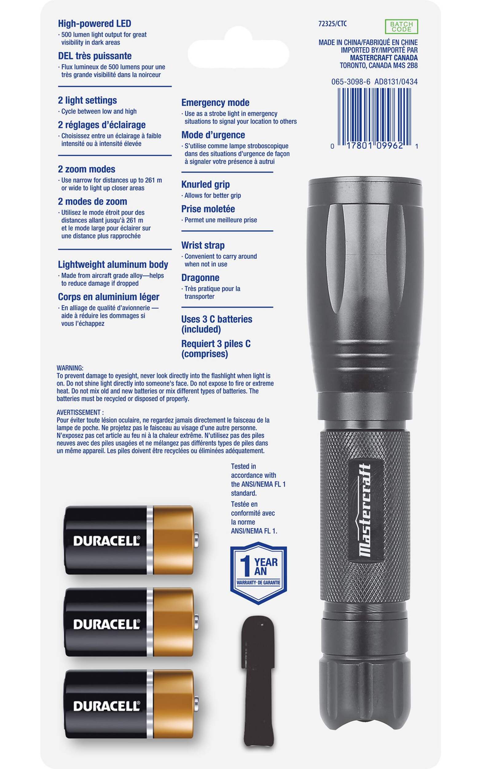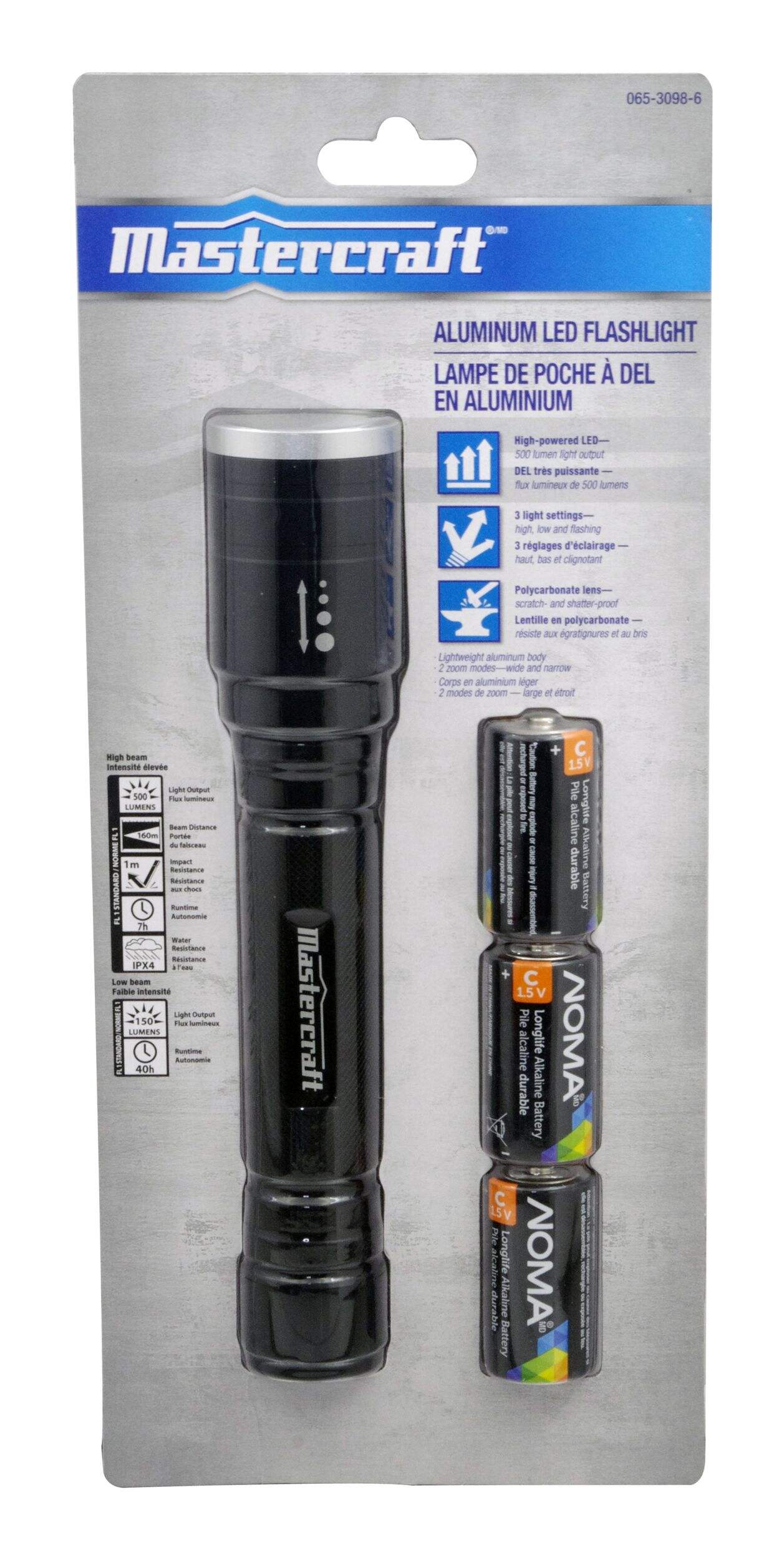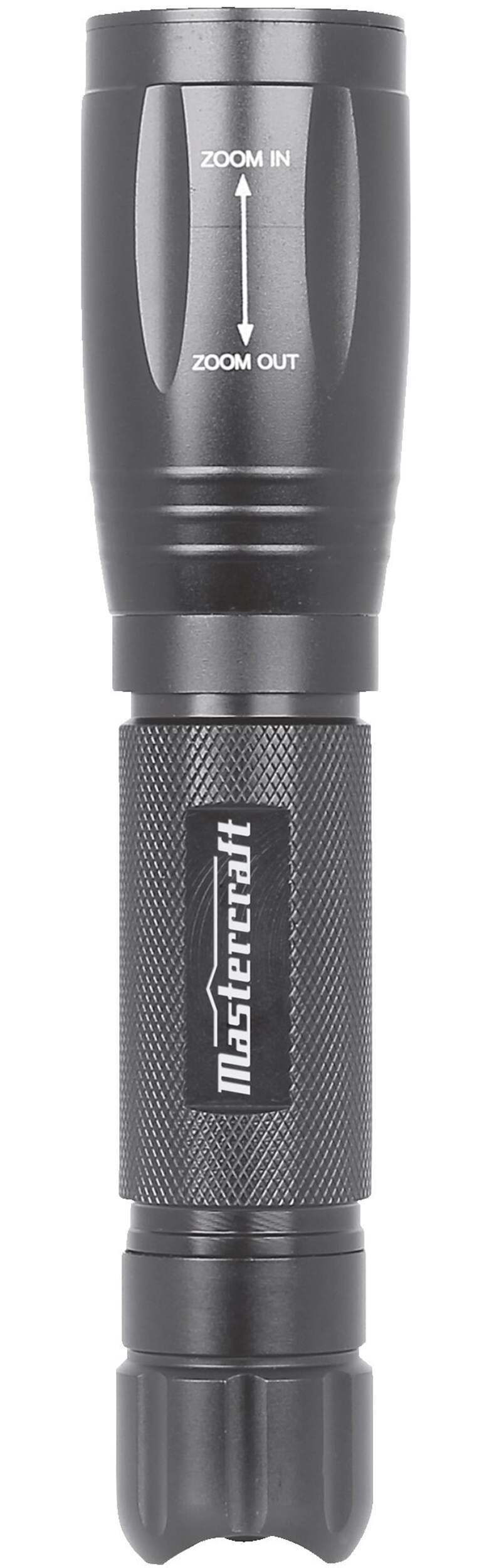 Lighten up dark areas with the Mastercraft 500 Lumen LED Flashlight. This aluminum LED flashlight is high powered and has a variety of settings to meet your needs. It can also be used as a strobe light in emergency situations to signal your location to others. The lightweight aluminum body is durable and comes with a knurled grip for a better hold as well as a wrist wrap for ease in carrying it around when not in use. Plus, it is water-resistant and impact-resistant to 1 metre.