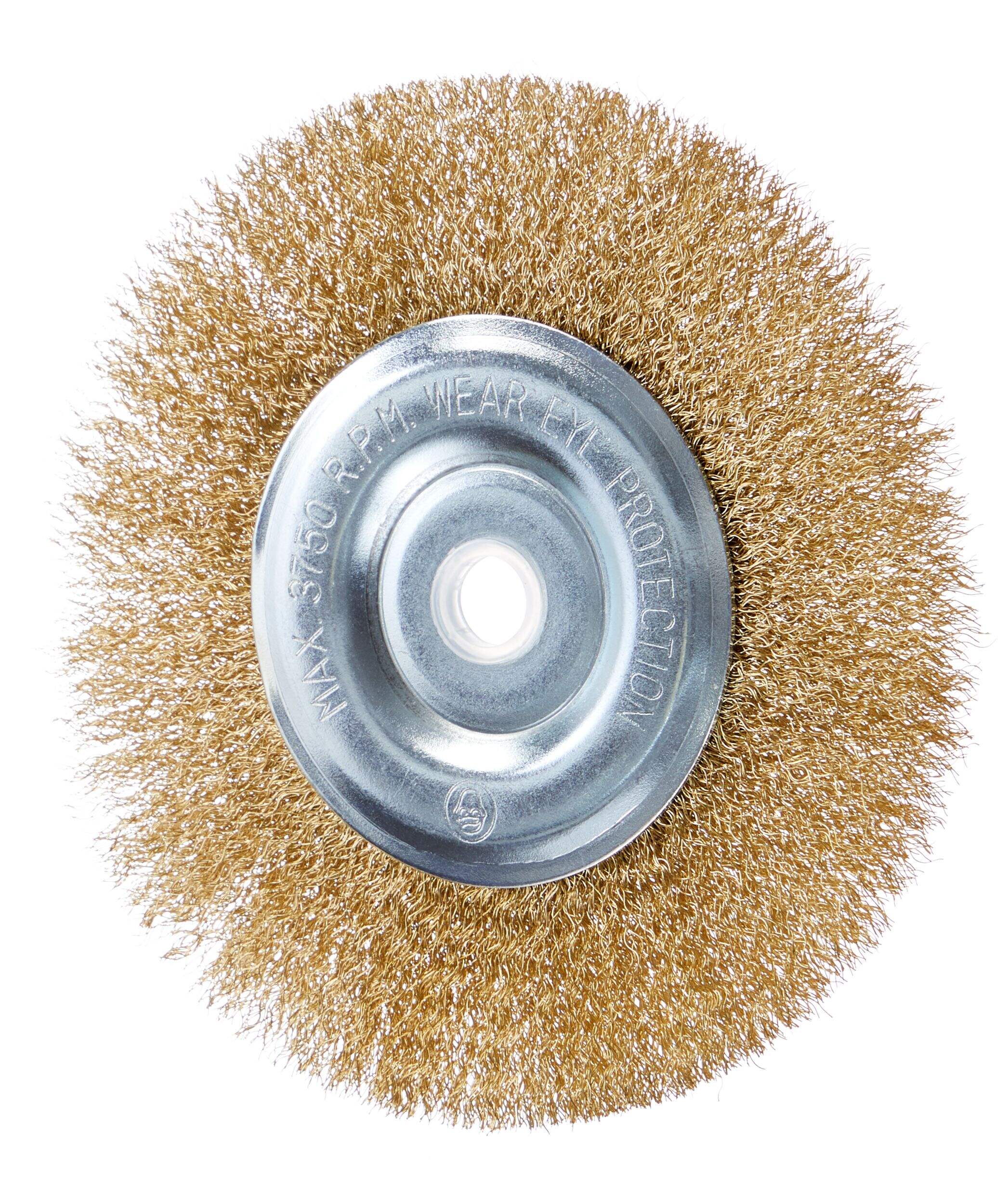 The Mastercraft 6-in Crimped Metal Fine Wire Wheel Brush will breathe new life into rusty, worn metal surfaces. The crimped wire bristles made from a brass-coated steel blend are designed to quickly remove rust, scale, dirt, and minor surface imperfections from metal, wood, and plastic. The 5/8-inch arbor fits most bench grinders, while the 6-inch diameter head allows you to cover a good-sized surface area in one pass. Whether you're refurbishing old tools in the garage workshop or restoring rusty railings on the patio, this wire wheel brush unleashes the power of controlled abrasion to revitalize surfaces that have seen better days. Simply attach it to your bench grinder, switch it on, and watch as years of wear and tear are whisked away, revealing the smooth, clean surface beneath.
