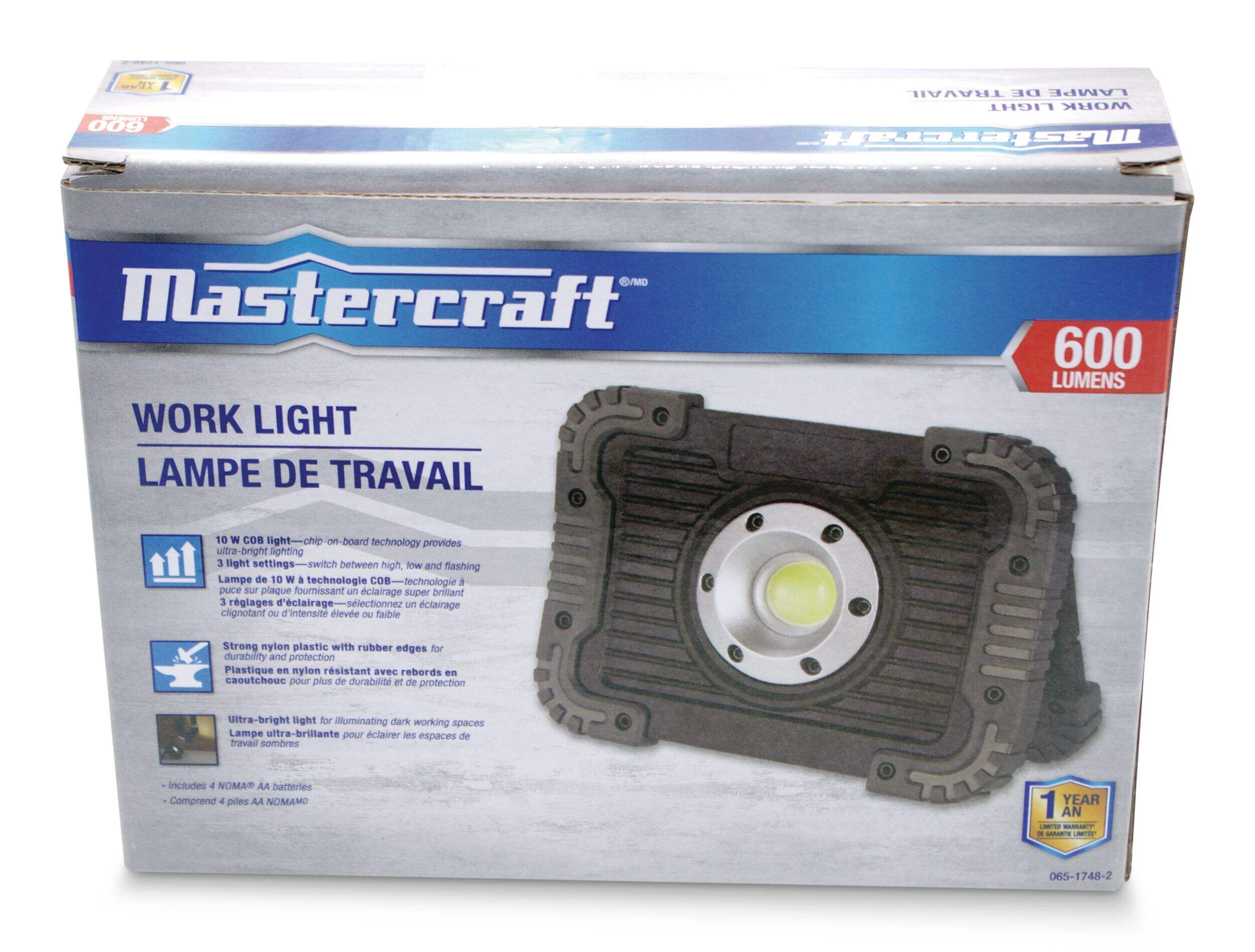 The Mastercraft 600 Lumen Utility Light features chip-on-board technology that provides ultra-bright lighting. The flashlight comes with three settings, high, low and flashing, allowing you to switch at your convenience. Its strong nylon/plastic body has rubber edges for durability and protection. This ultra-bright light is ideal for illuminating dark working spaces. Batteries are included to power up your utility light right out of the box.