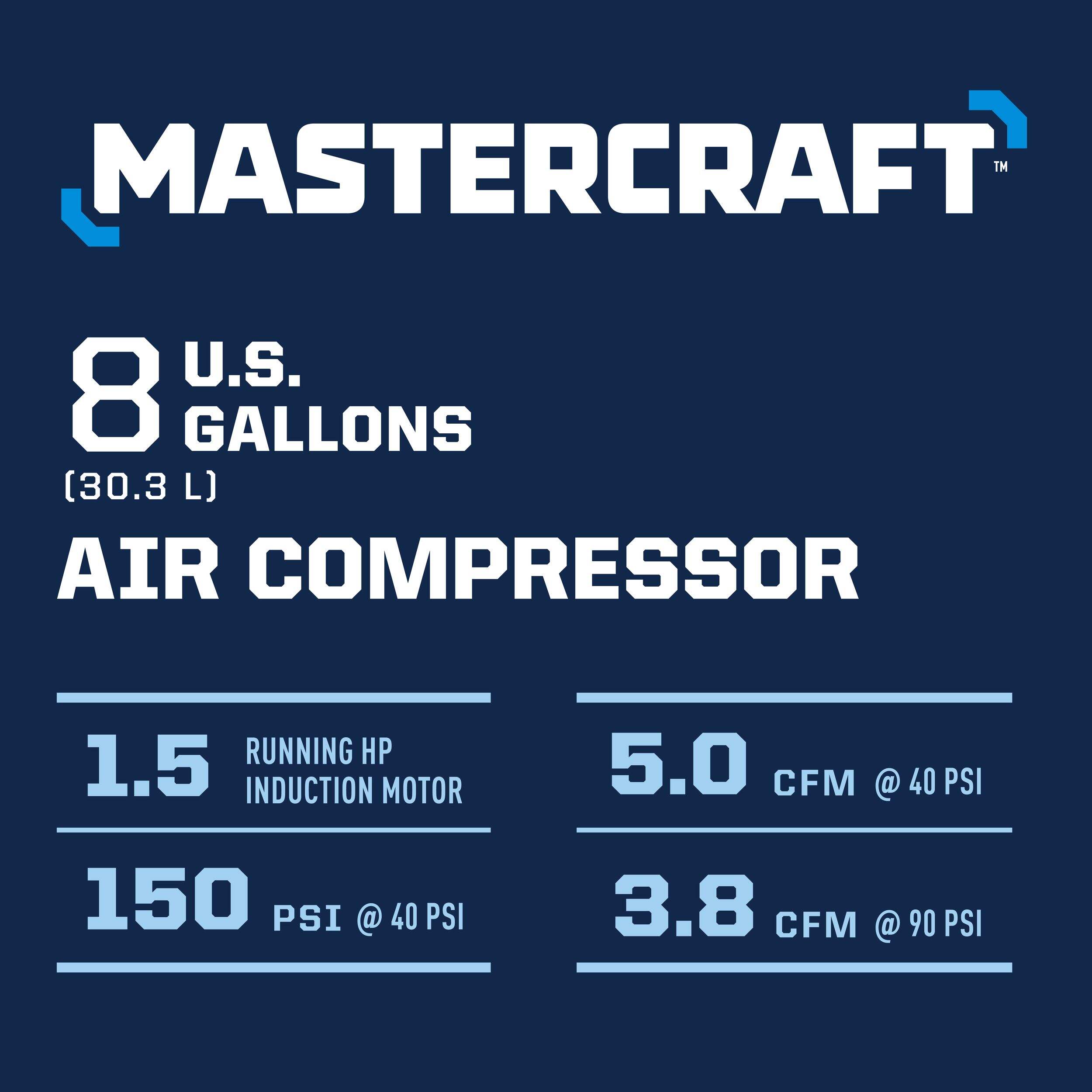 The Mastercraft 8-Gallon Portable Air Compressor delivers the airflow you need to power nail guns, impact wrenches, and spray guns with ease. Its robust motor packs industrial-grade strength into a portable design, while the 8-gallon tank provides the capacity to handle larger projects effortlessly. With an upright build and large rubber wheels, this compressor glides smoothly across jobsites, and the extended handle ensures easy maneuverability. The upward-facing gauge allows for quick pressure checks, while the universal quick coupler enables instant tool connections, making it a versatile addition to any toolkit.