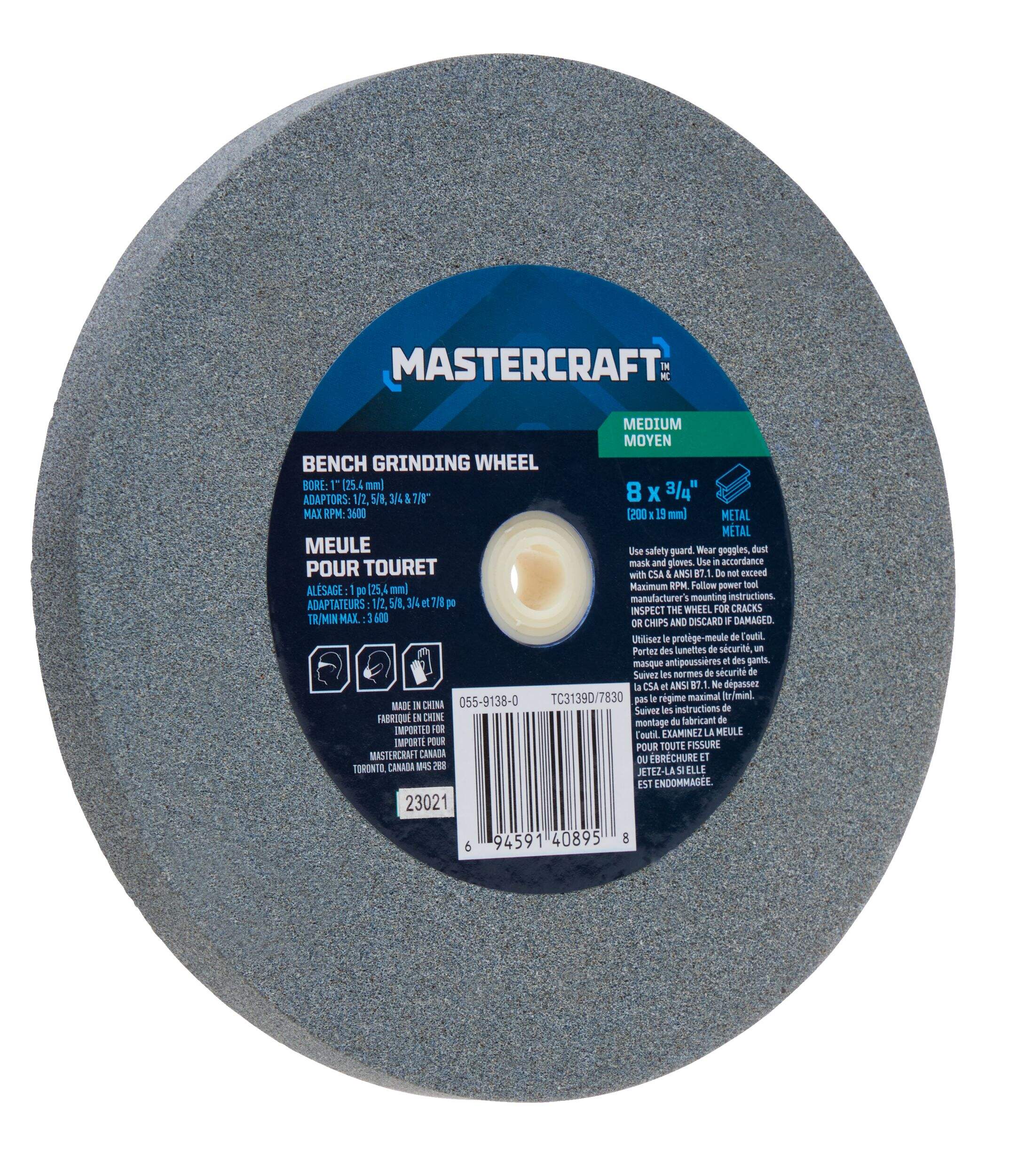 Take on various grinding tasks with the Mastercraft Grinding Wheel Kit. This grinding wheel measures 8 x 3/4" (20 x 1.9 cm), and is built for use on bench grinders. The bench grinding wheel features a self-sharpening construction, ensuring that the grinding disc stays sharper for longer. This vitrified grinding wheel has a 1" (25.4 mm) bore and has a maximum RPM of 3600.