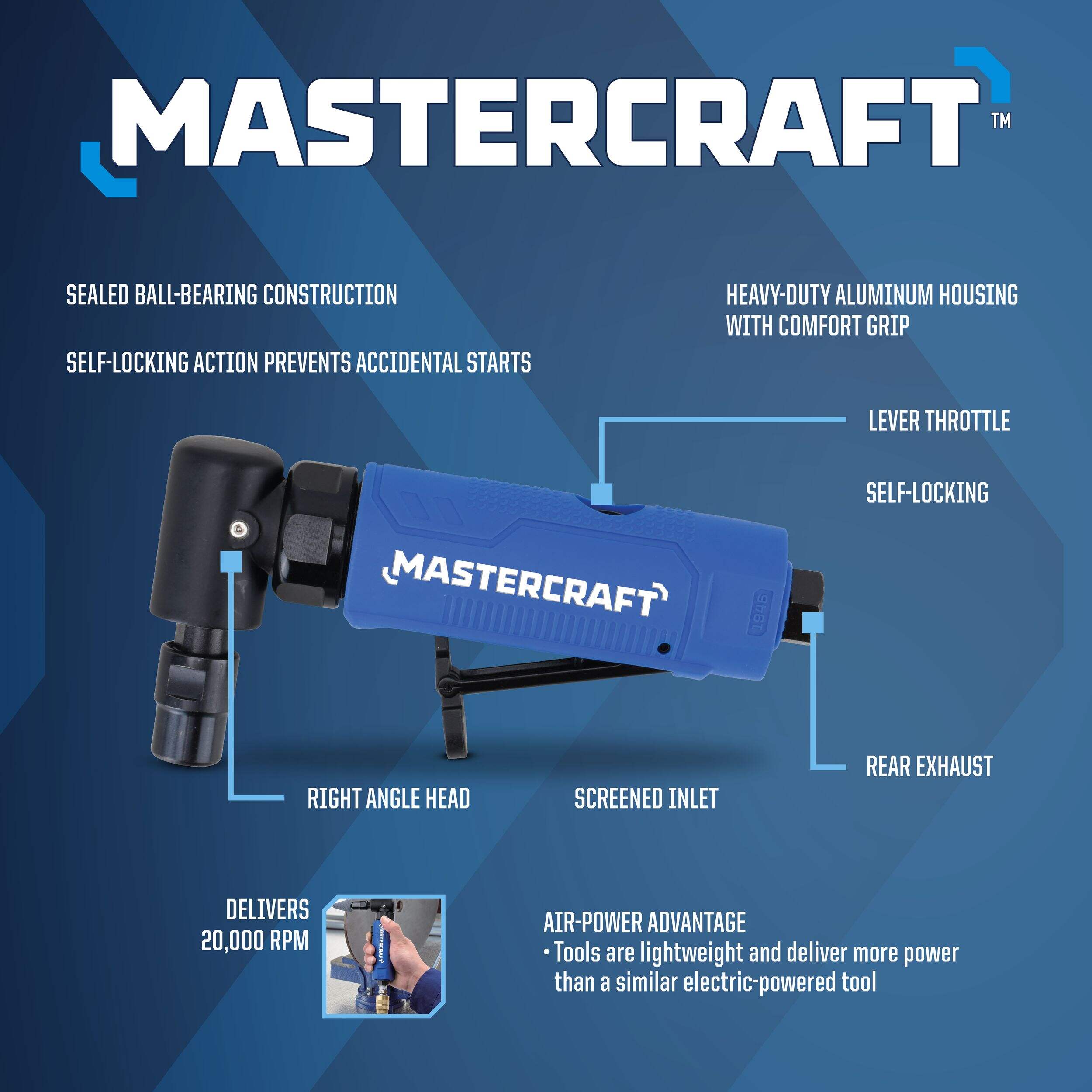 Mastercraft Angle Die Air Grinder is ideal for a variety of applications, including porting, weld breaking, de-burring, polishing, and grinding