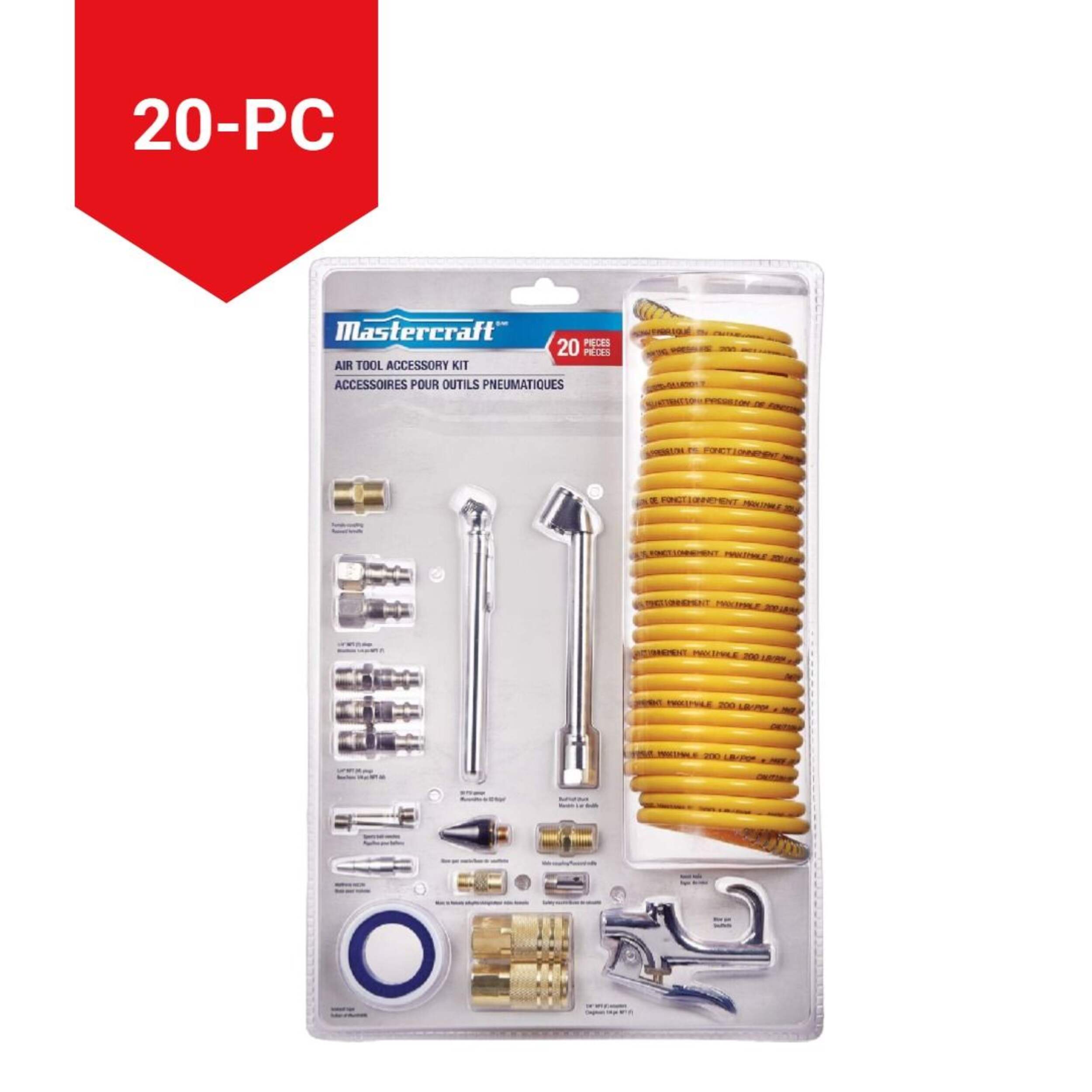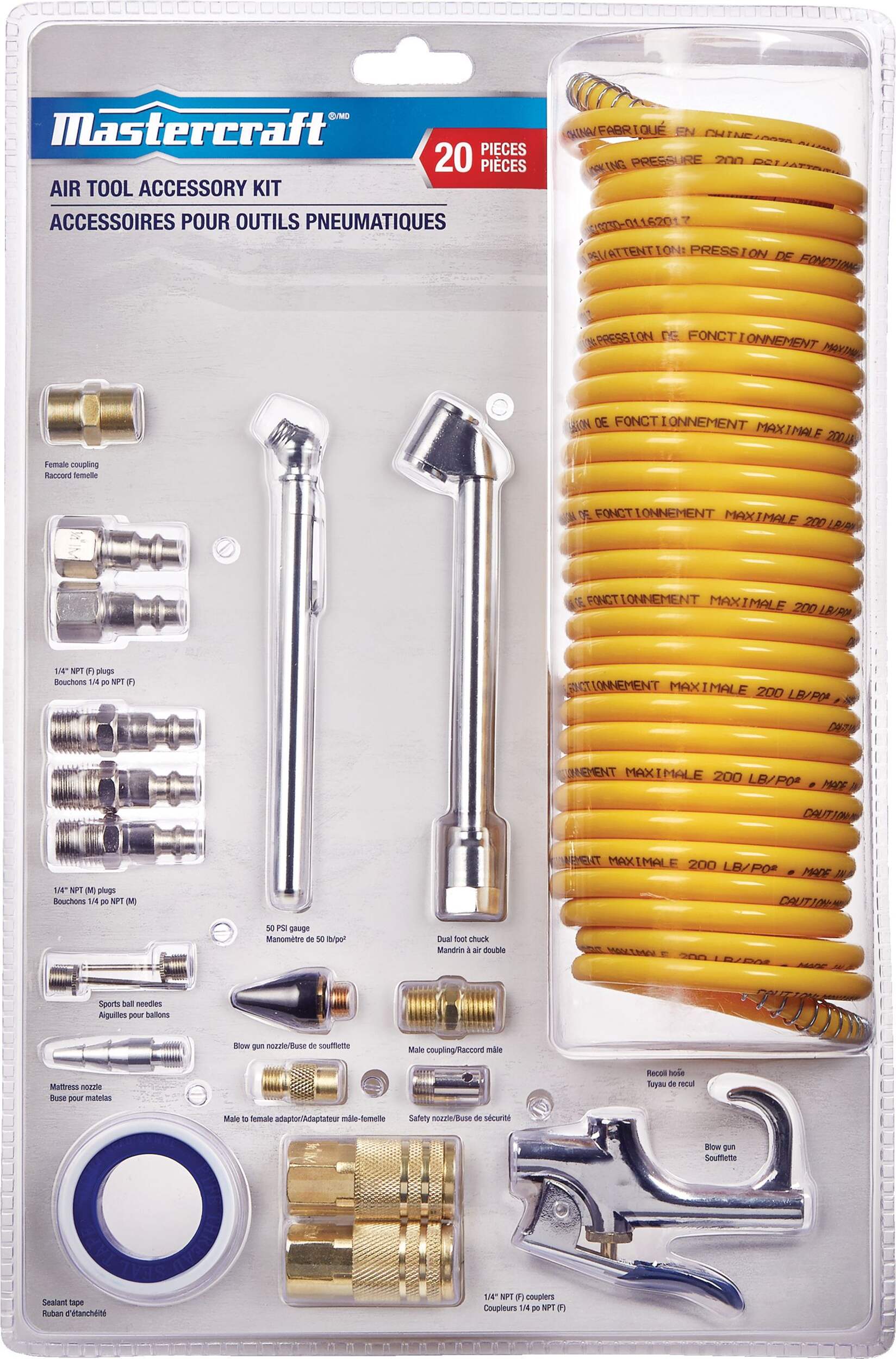 The Mastercraft Air Compressor Accessory Kit is a vital addition to any well-equipped workshop or job site. With the versatility to handle both DIY and professional jobs, the air compressor kit provides everything you need to maximize its potential right out of the box. The long recoil hose gives you the reach to power pneumatic tools in your shop or garage, while the blow gun helps clear away dust and debris. Female and male couplers join the compressor to tool with leak-free connections, and PTFE tape ensures air-tight threads. Gauges let you monitor pressure for optimal performance and safety.