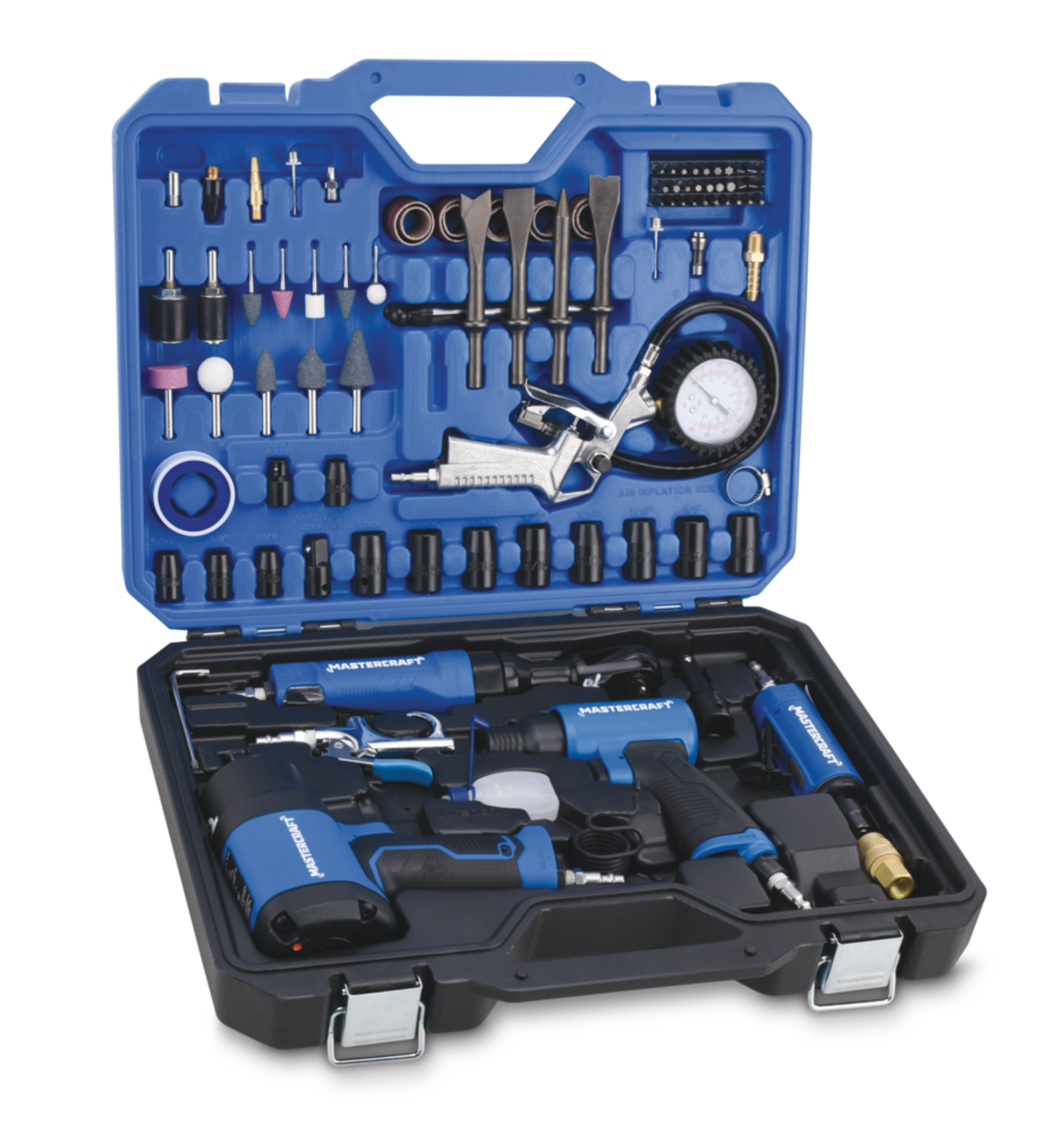 The Mastercraft Air-Powered Tool Kit is a comprehensive set designed to tackle a variety of automotive, home, and workshop projects. Featuring 100 high-quality components, this kit includes essential air tools and accessories like impact wrenches, air ratchets, chisel bits, and more, providing versatility and efficiency. Built for durability and performance, each tool is designed to deliver reliable results, whether you're performing automotive repairs or DIY tasks.