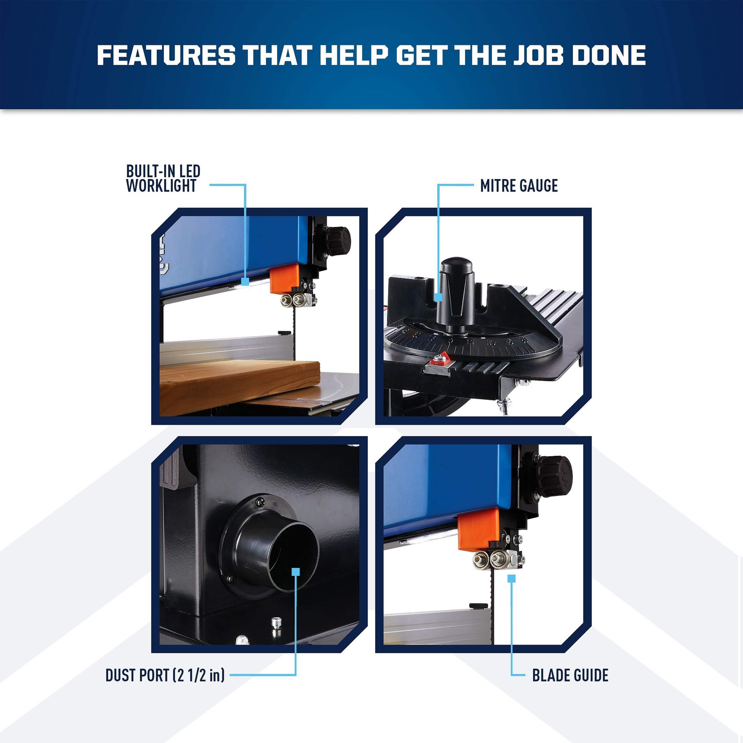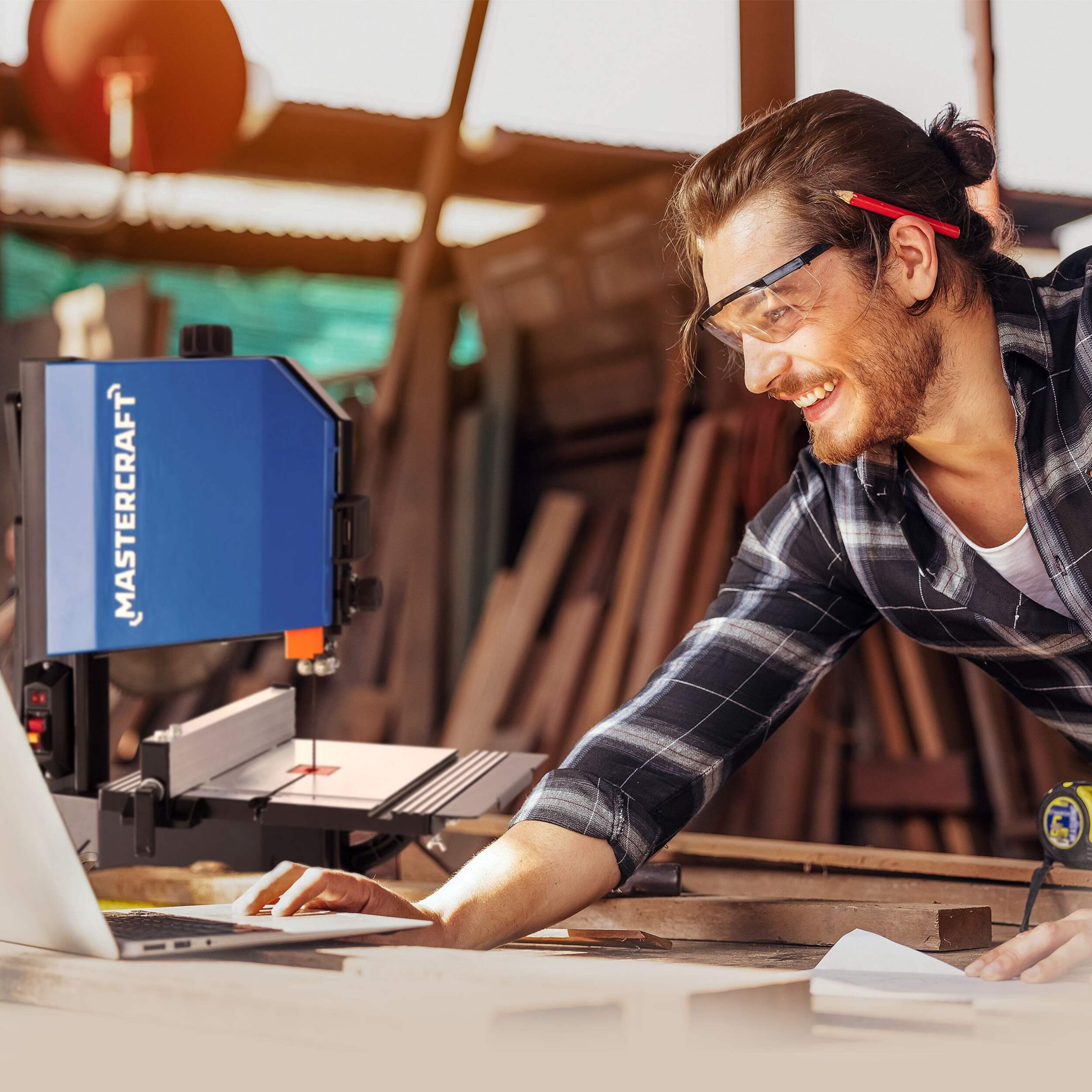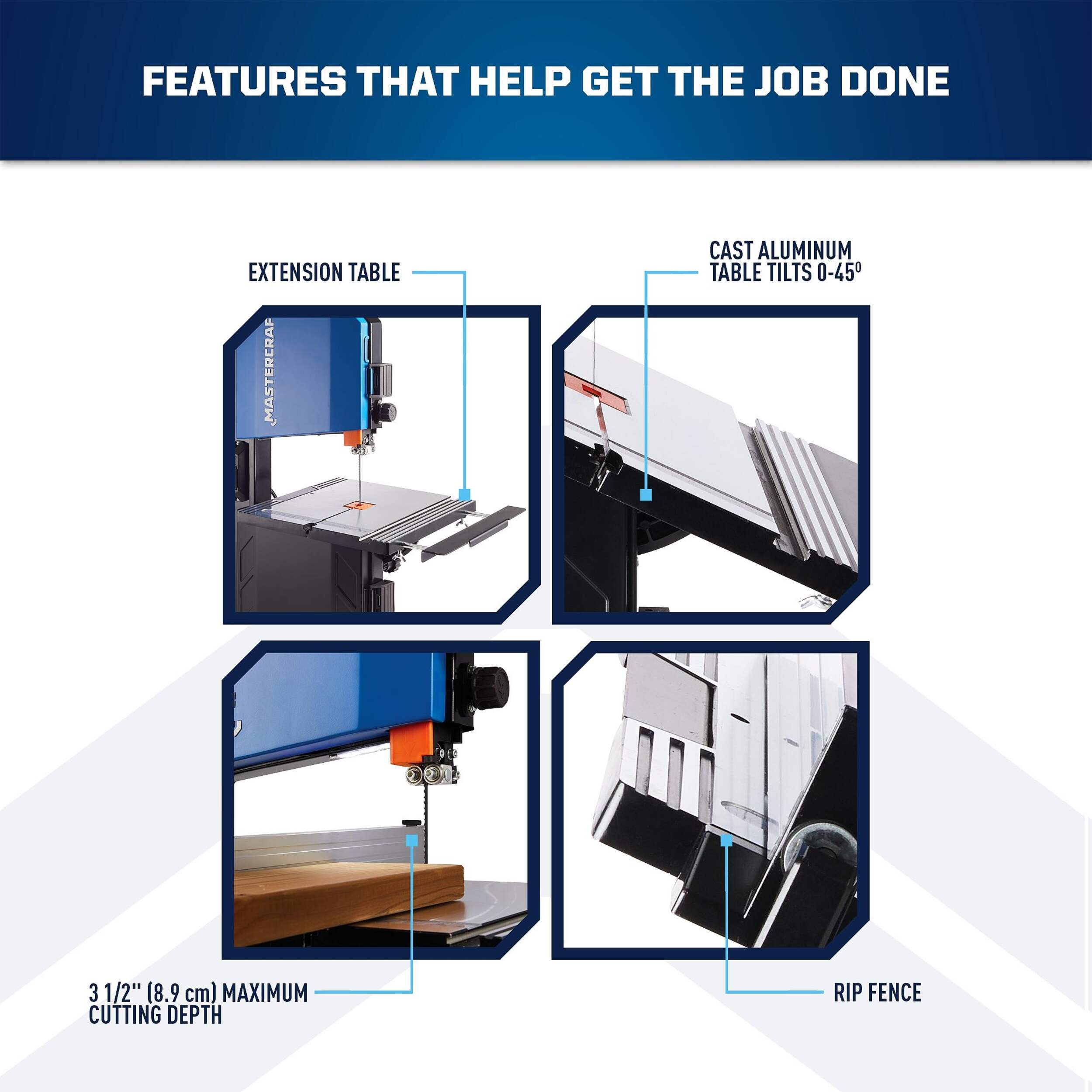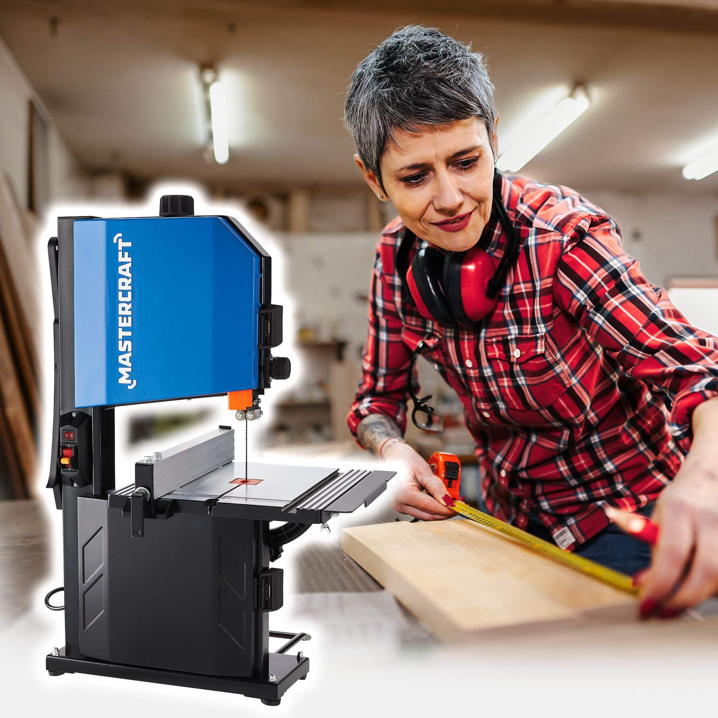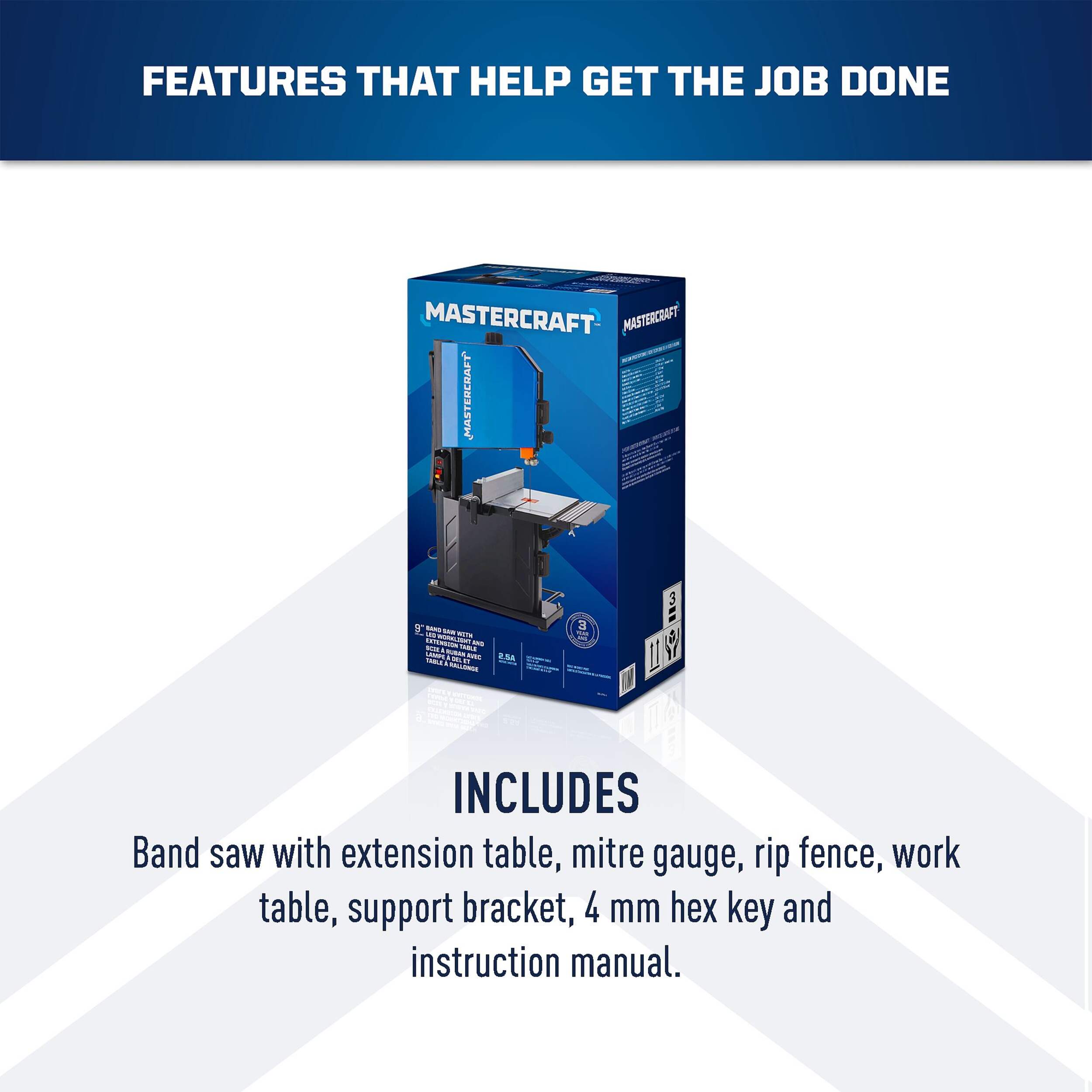 The Mastercraft 9-in Bandsaw is a powerful tool designed to make precise cuts through wood, plastic, and other materials. With a sturdy 2.5-amp motor, this bandsaw provides smooth, accurate cuts, making it ideal for woodworking projects, DIY tasks, and hobby work. The 9-in throat and adjustable cutting angles offer flexibility for various cuts, while the compact size fits well in any workshop. Equipped with a tilting work table and adjustable blade tension, the Mastercraft Bandsaw ensures precision and control for both beginner and experienced woodworkers.