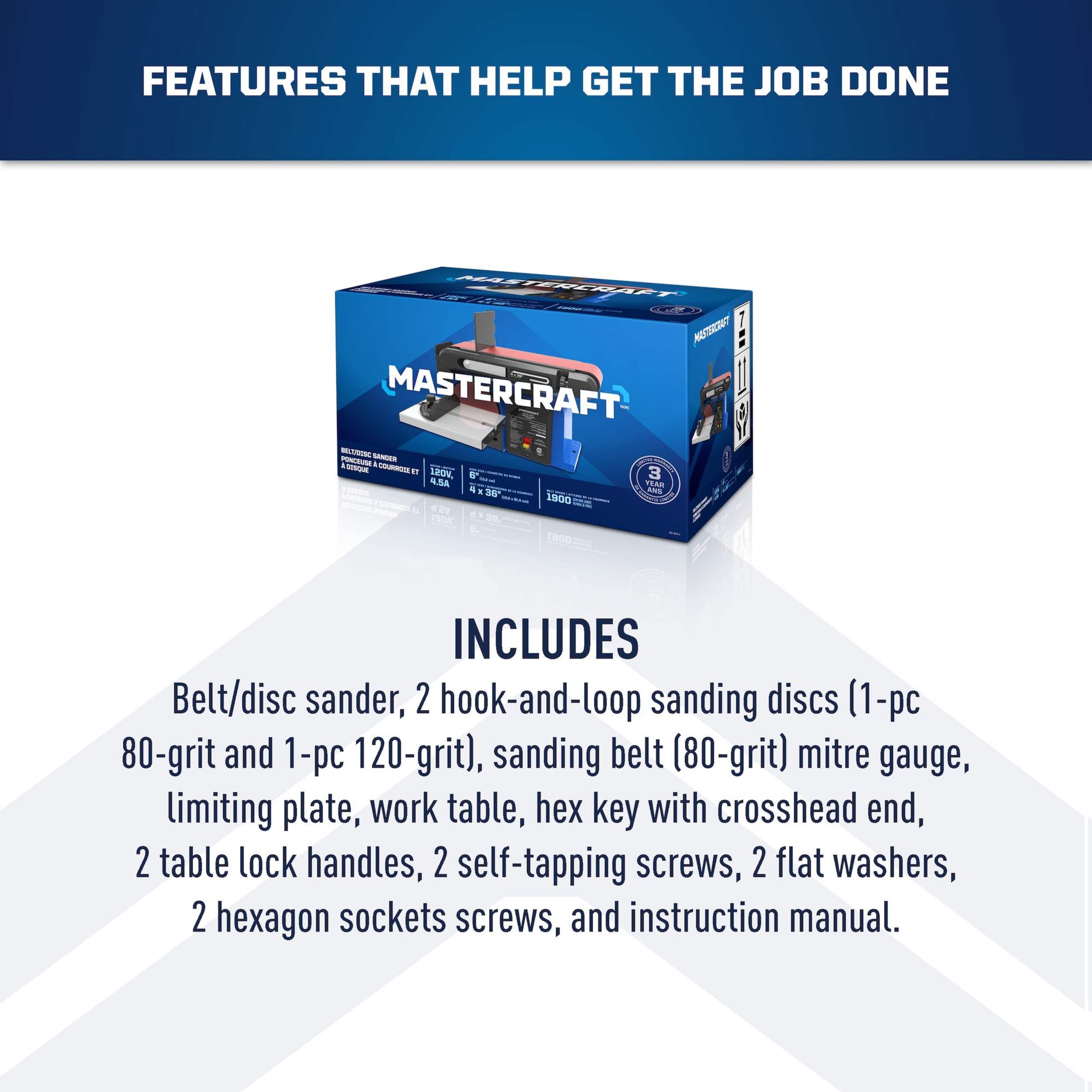 The Mastercraft Belt/Disc Sander offers versatile sanding options with its adjustable table and tilting belt. It features easy-to-change sanding discs and a stable design that minimizes vibration, making it ideal for smooth, precise sanding tasks.