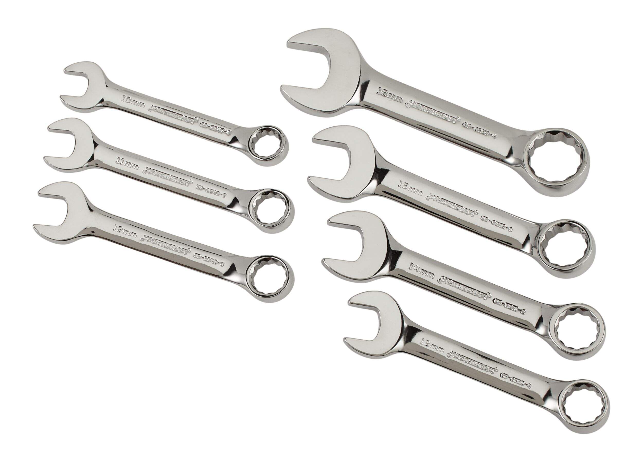 Contains 7 wrenches with short handles built from alloy steel with a nickel-chrome plating