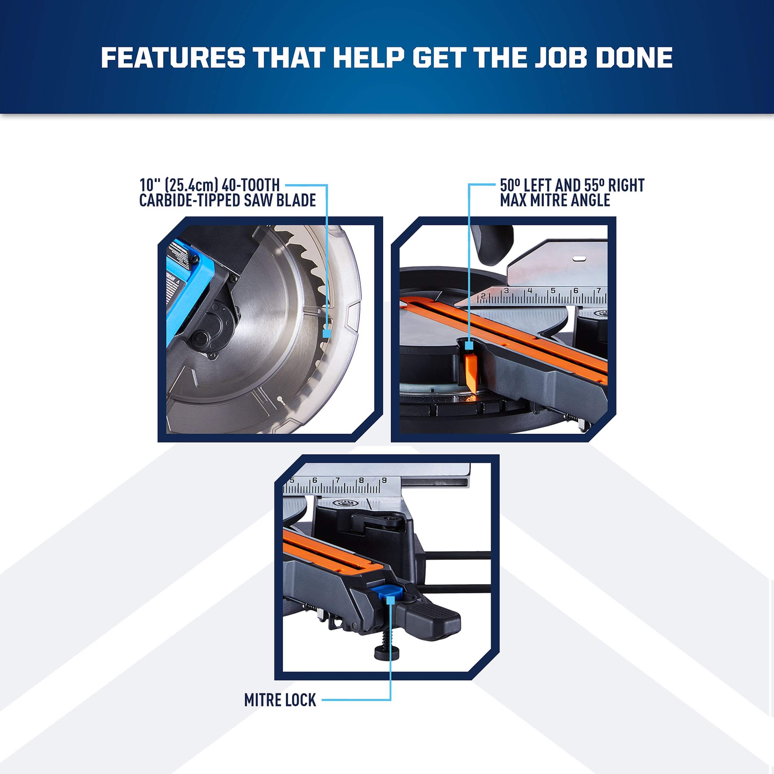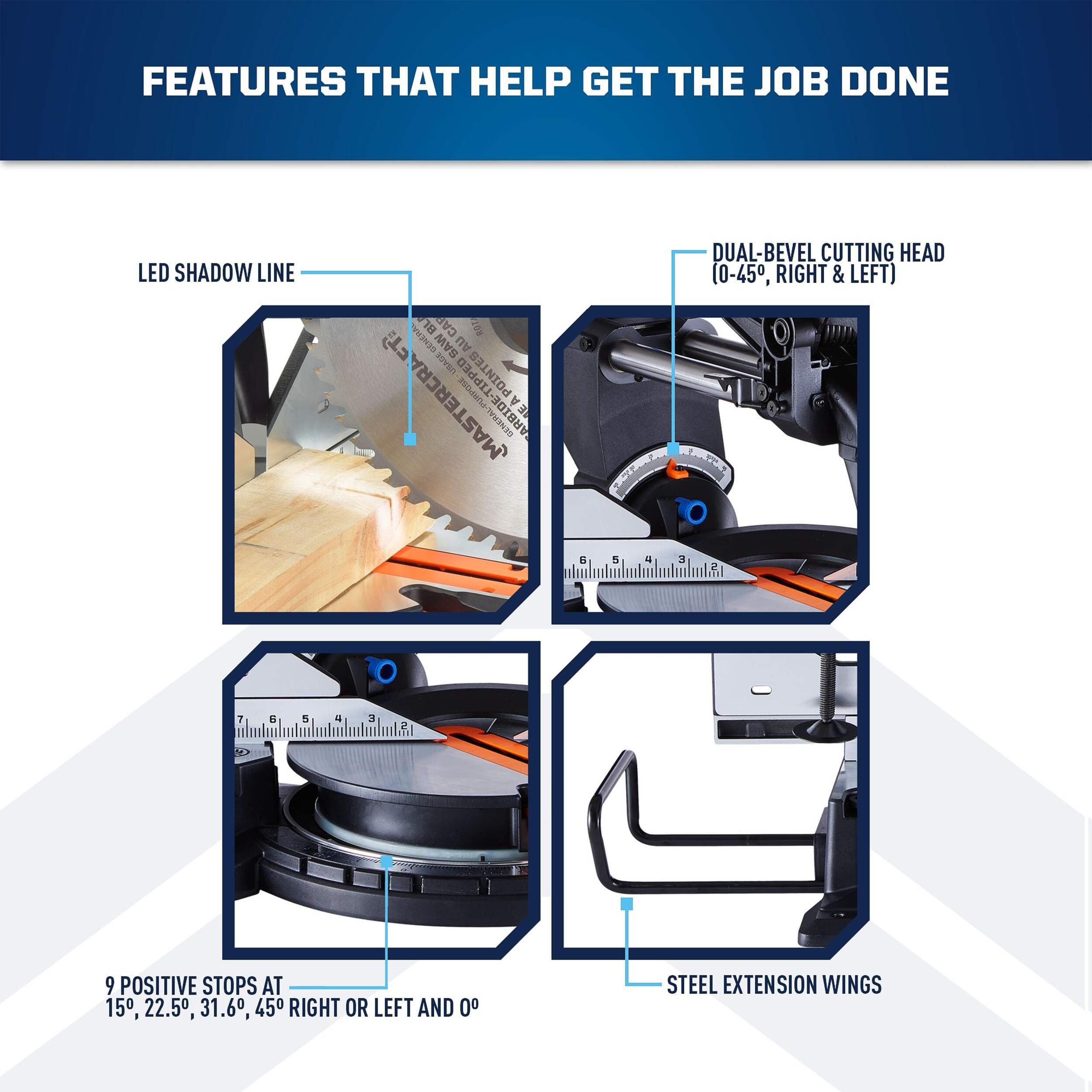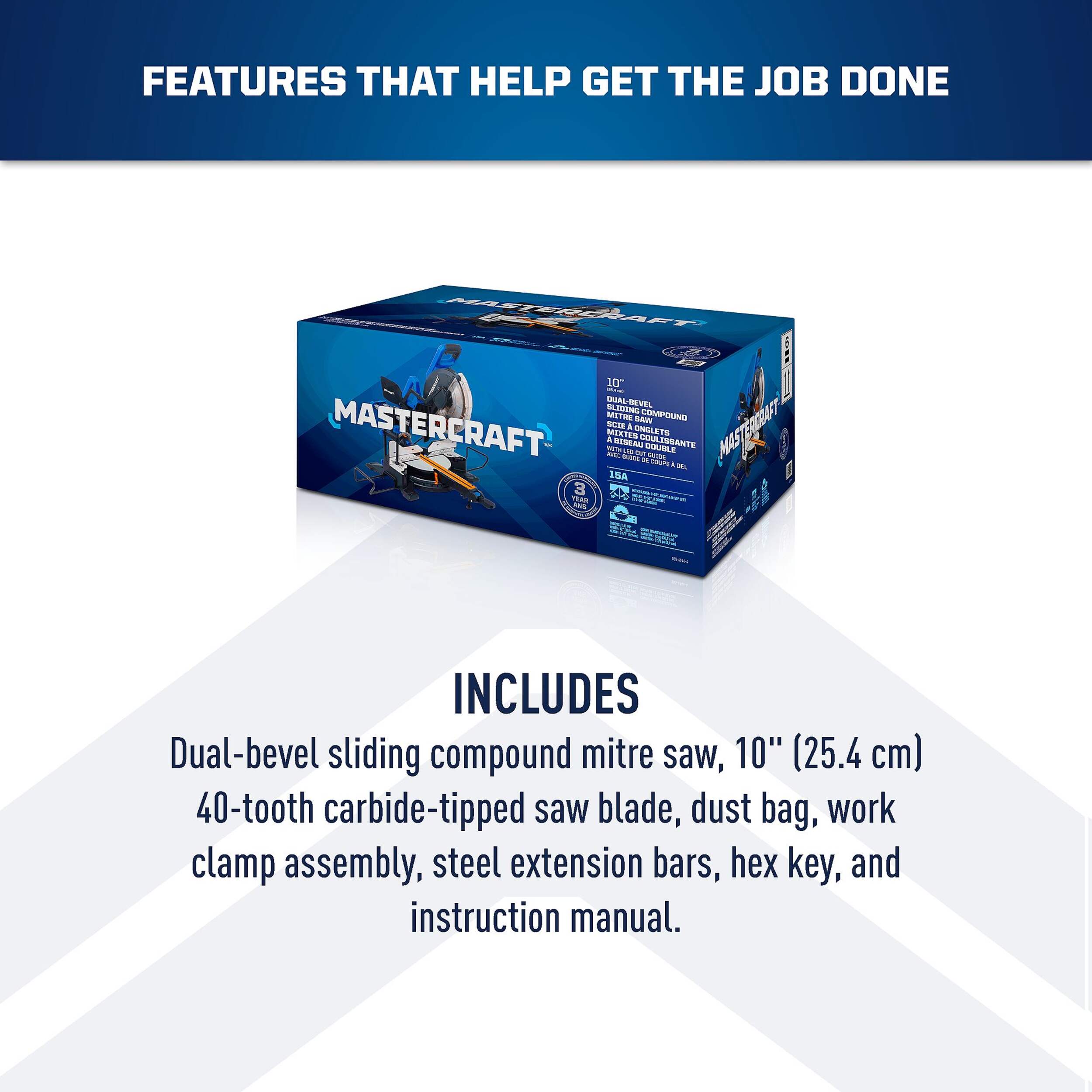 The Mastercraft Dual Bevel Sliding Mitre Saw delivers precision cutting capabilities in a versatile 10-in format. Equipped with a dual beveling blade, this mitre saw can handle compound mitre cuts with ease. The sliding fence supports large material on the base yet slides out of the way for bevel cuts. This Mastercraft mitre saw also comes supplied with a 10-in 40T carbide-tipped blade, dust bag and blade wrench.