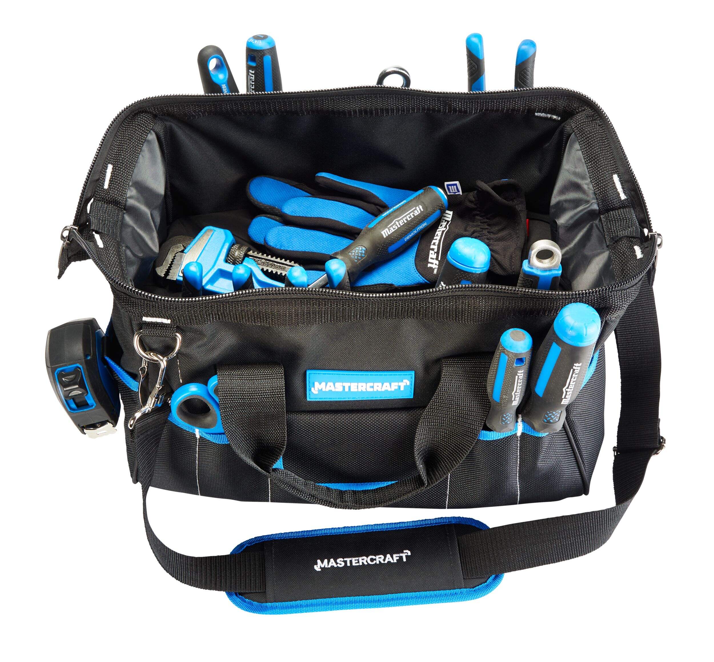 The Mastercraft Duffle Tool Bag features 17 pockets to organize your tools and accessories. Padded handles ensure comfort during transport, reducing wear and tear on your hands. The unique cross-stitch design provides extra support for carrying heavy tools without coming apart. The wide mouth opening allows for quick storage and removal of various items. Crafted from a combination of 600-denier and 1200-denier ballistic weave, this bag is extremely durable, making it ideal for tool storage on the go.