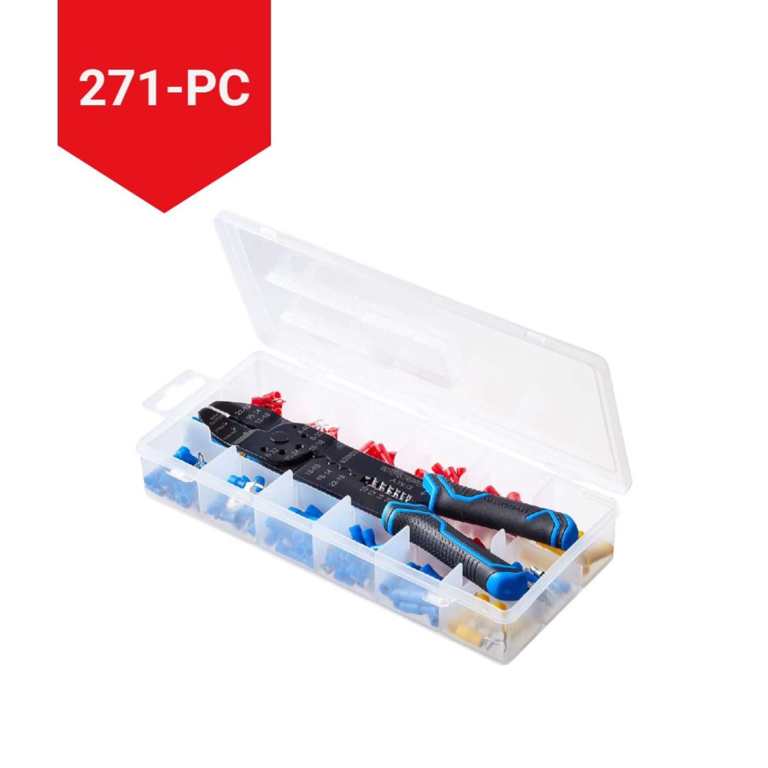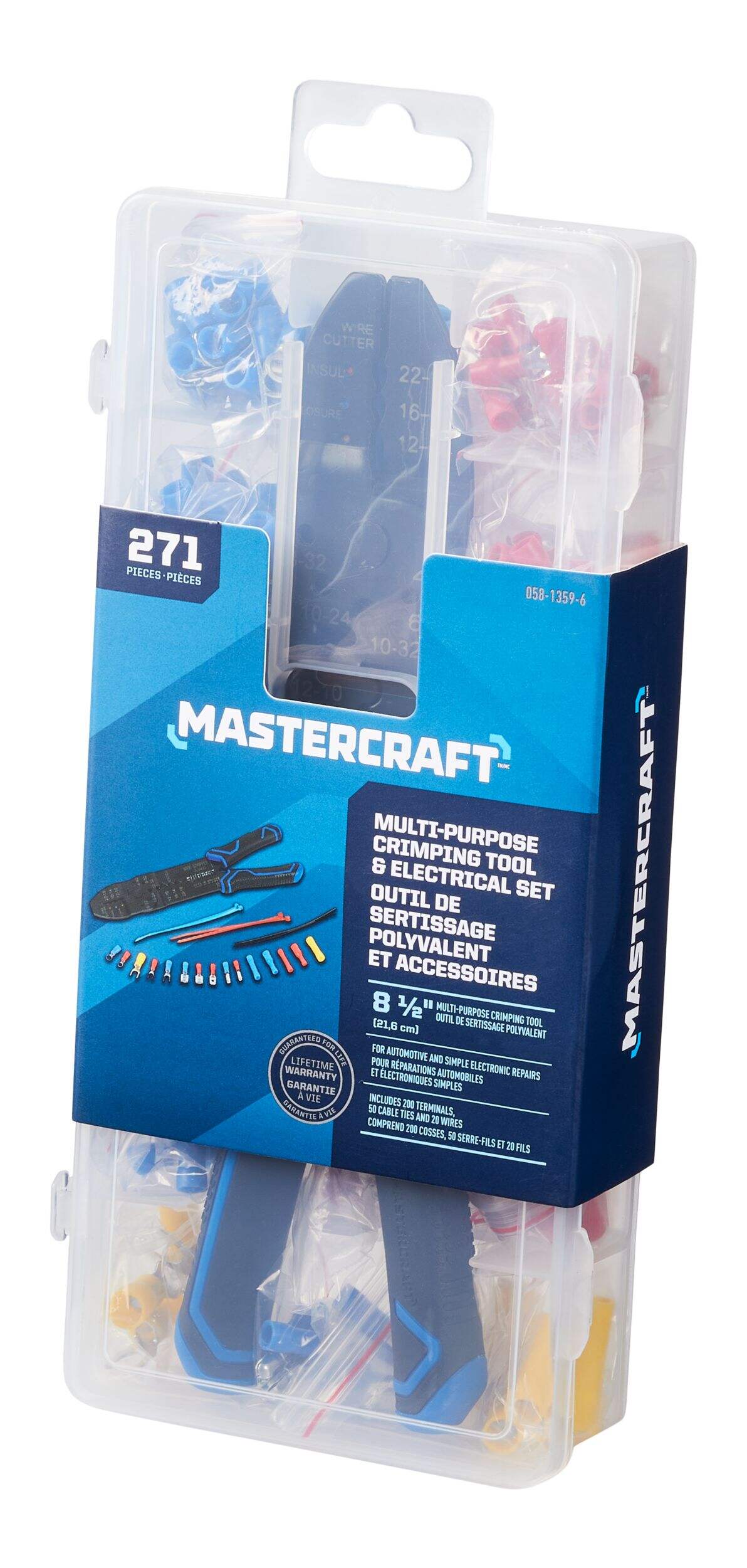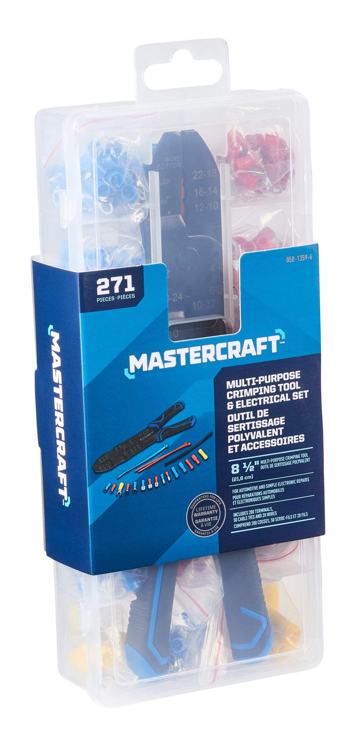 Tackle any electrical wiring task around your home with the all-inclusive Mastercraft Electrical Set. The 271-pc selection comes in a convenient storage case to keep your tools organized. The electrical kit features a 9-in steel crimping tool designed for the repair and maintenance of various solid and stranded wires commonly found in lighting fixtures, wall outlets and small appliances. Ideal for any home handyperson, this compact electricians' toolkit includes a versatile array of cable ties and connectors.