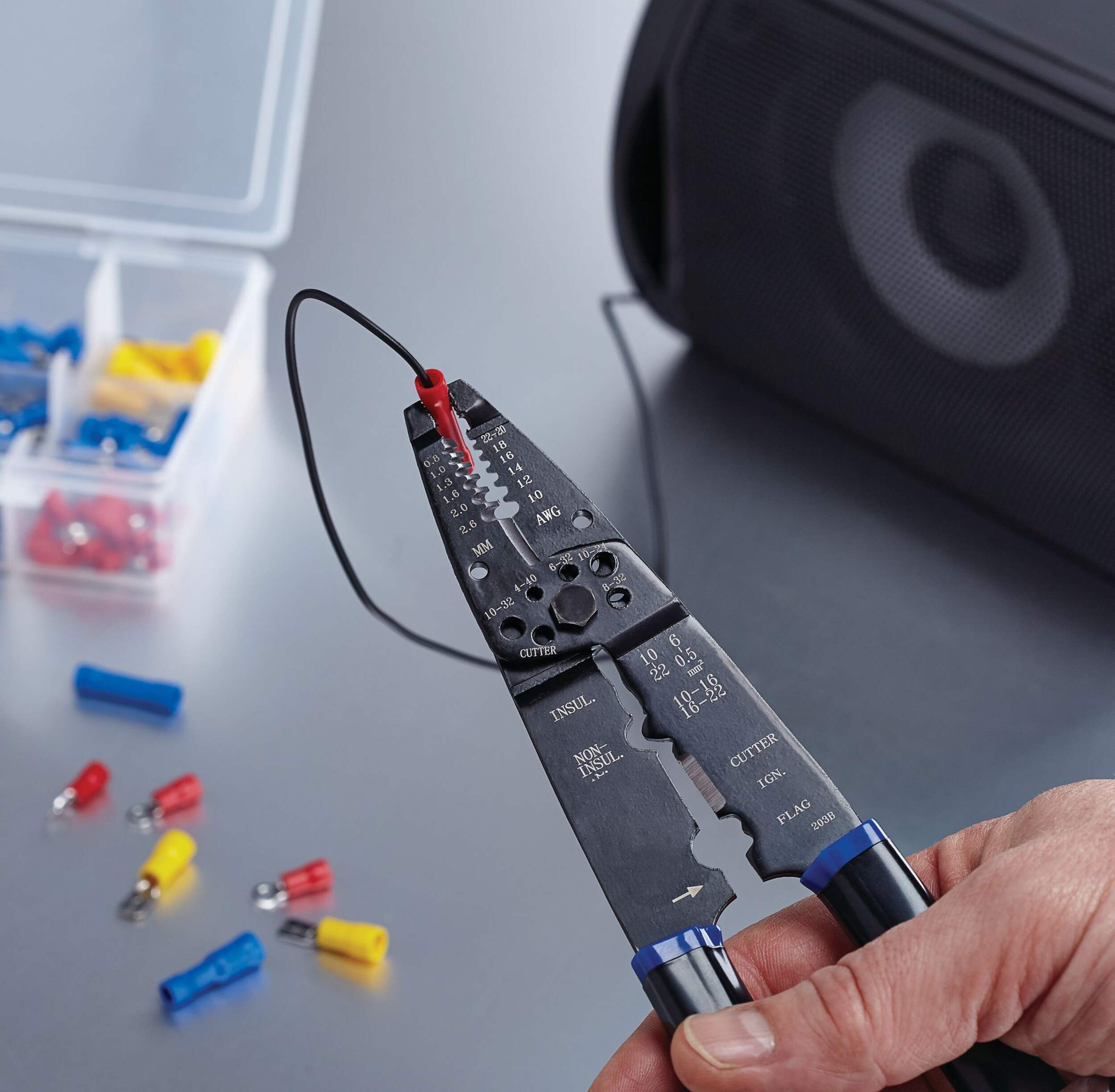 Multi-purpose crimping tool strips solid or stranded copper and aluminum wire