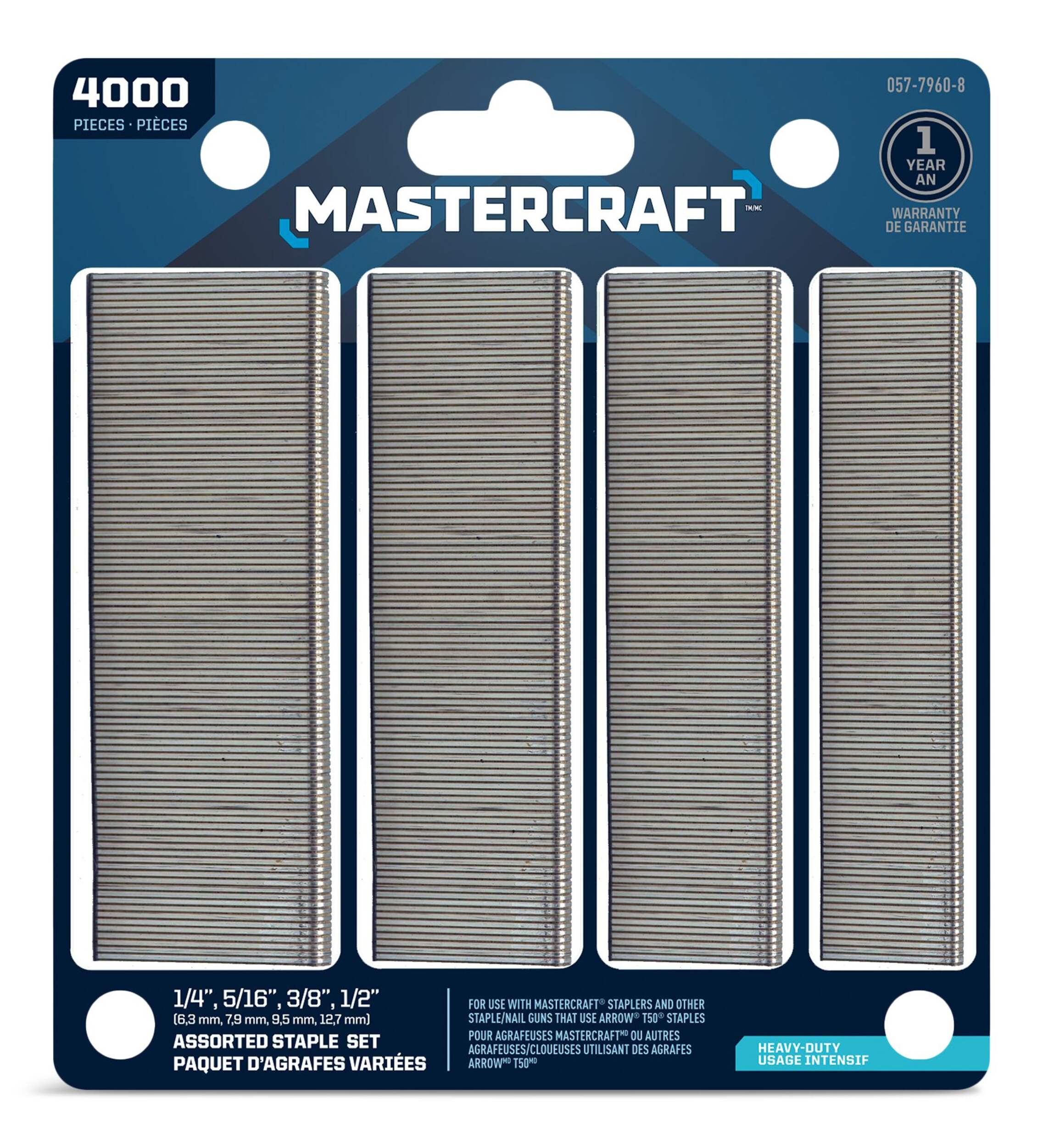 The Mastercraft Fastener T50 Galvanized Staple Combo Kit provides 4000 galvanized staples for a wide range of household and craft projects. This staple kit includes 1000 staples each of 1/4", 5/16", 3/8", and 1/2" sizes, giving you a variety of lengths to choose from. Suitable for use in all Arrow T50, Mastercraft T50, and generic T50 staplers, these fine wire staples are useful for a wide variety of projects.