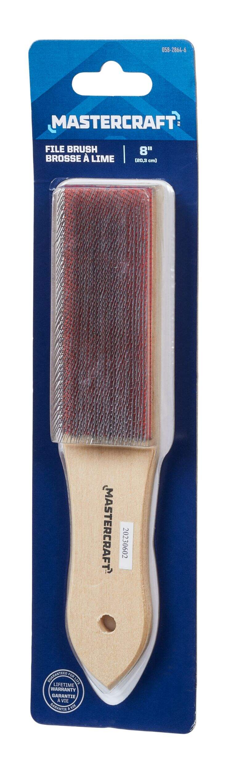 The Mastercraft File Brush/Cleaner is the ideal tool for maintaning your various files, this file cleaner's metal bristles brush away debris between the file teeth, it also features a useful hang up hole for easy storage and ultimate ease of use. This wooden file brush also has a lifetime exchange warranty for ultimate peace of mind.