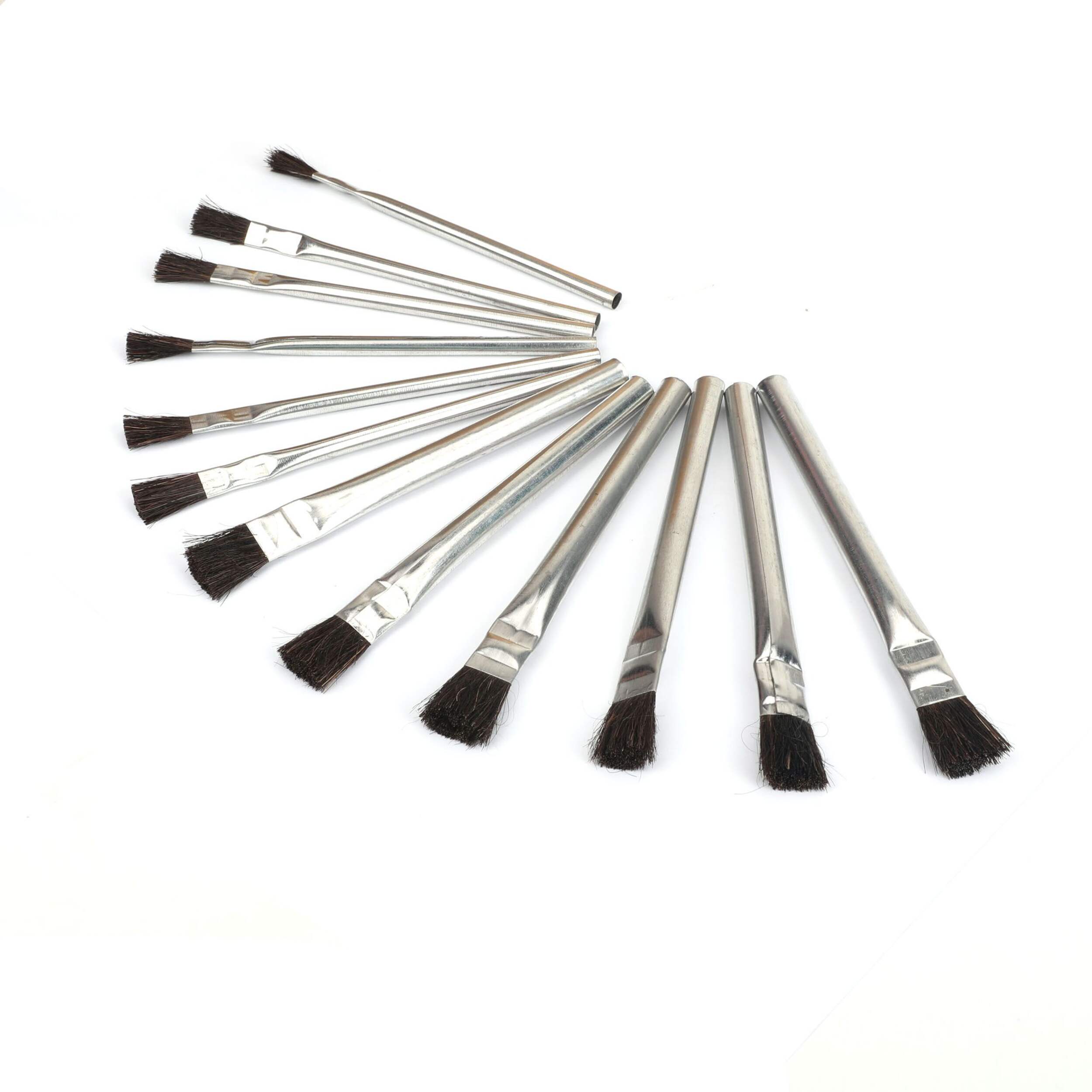 The Mastercraft Flux Brush Set includes 12 high-quality brushes ideal for applying fluxes, acids, glues, lubricants, and more. This comprehensive set contains 6 1/4" and 6 1/2" brushes. The horsehair bristles hold more liquid and provide smoother application compared to other bristle types. Tin ferrules resist water and corrosion while preventing bristles from loosening. Whether soldering, welding, or detailing, each durable flex brush allows controlled application of liquids for professional-quality results.
