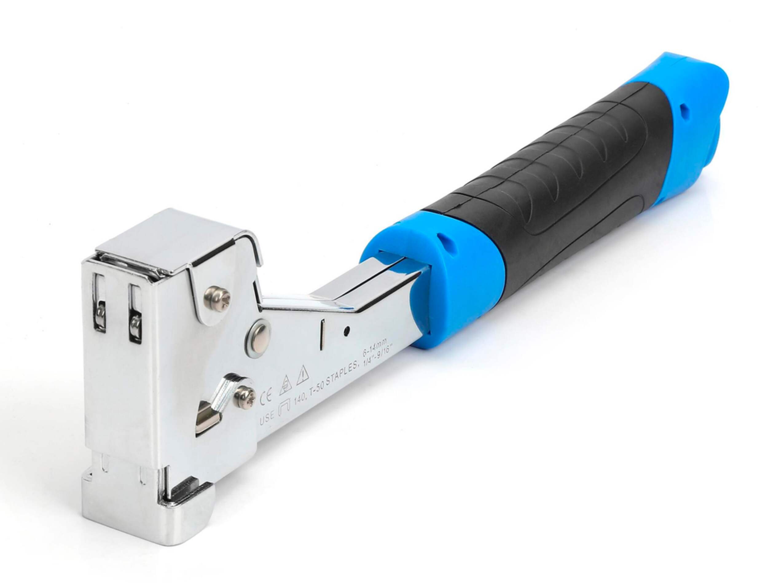 Hammer tacker features a non-slip rubber grip