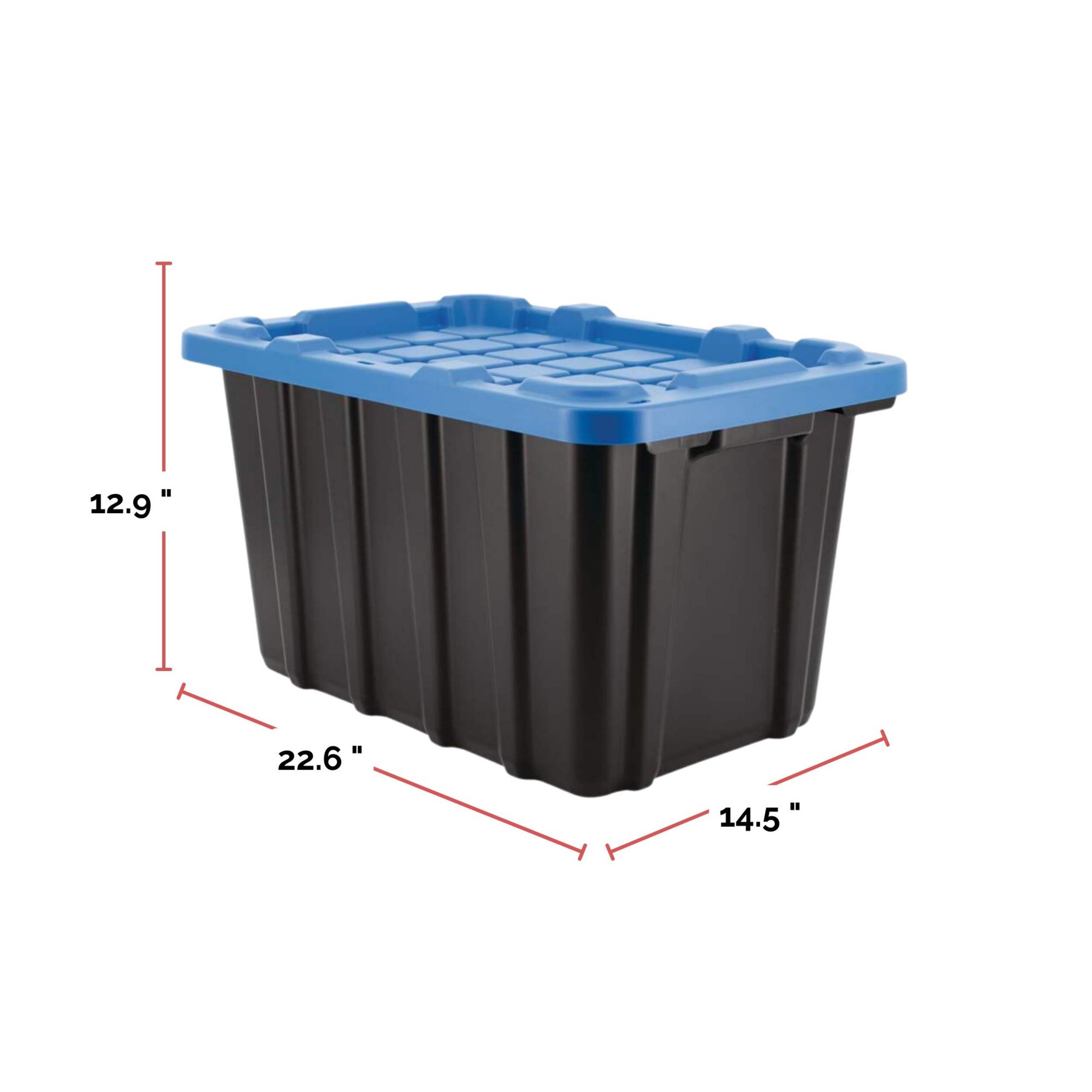 Get organized easily with the ample space in this Mastercraft Heavy Duty Stackable Storage Box. The sturdy plastic construction protects contents and features a recessed lid so you can securely stack the boxes and cover all your storage needs. It has ergonomic handles for easy carrying, and this versatile black and blue storage box features built-in holes for adding ties or a lock for extra security.