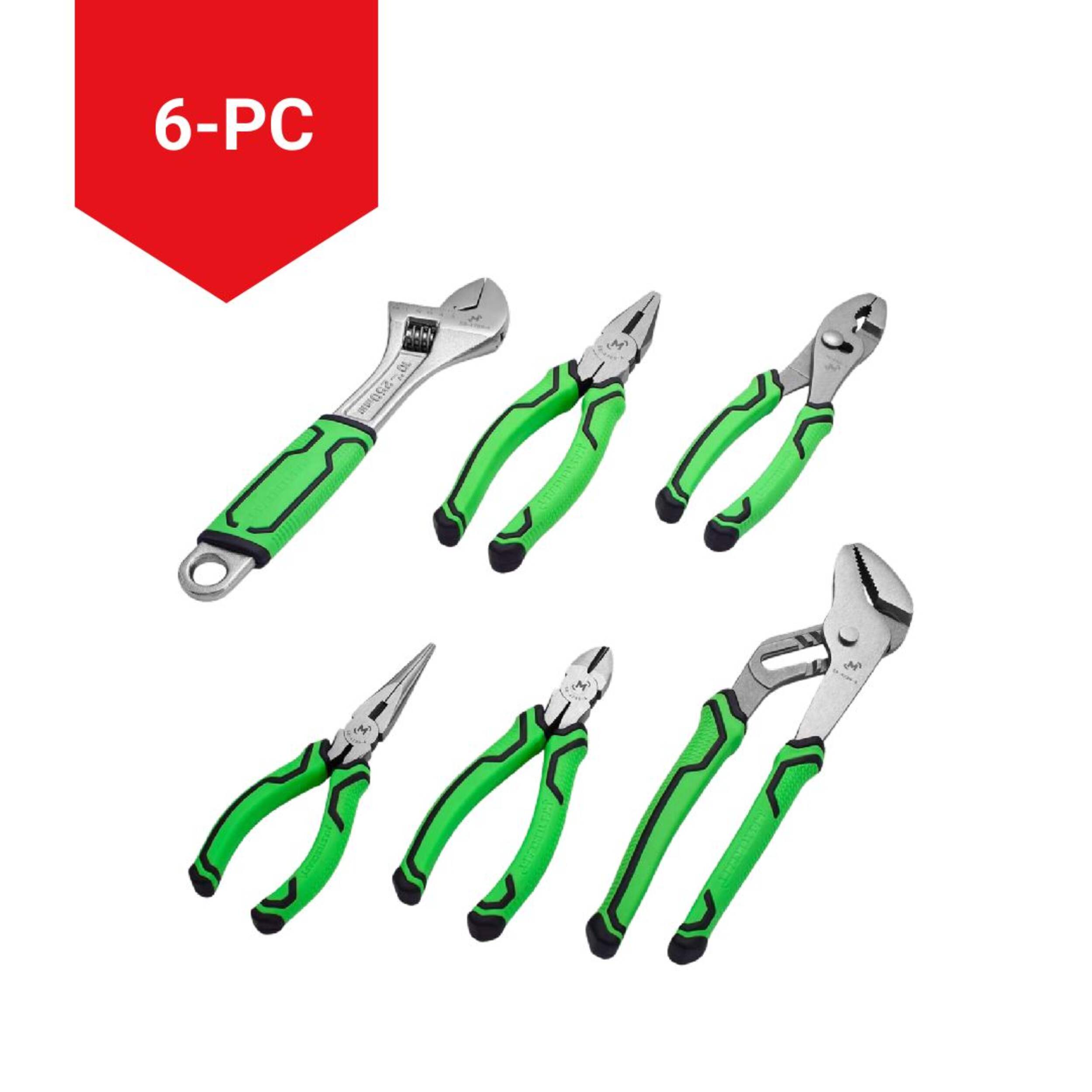 Includes: 6" (15.24 cm) diagonal cut, 8" (20.32 cm) slip joint, 8" (20.32 cm) lineman's, 10" (25.4 cm) adjustable wrench, 10" (25.4 cm) tongue and groove, 6" (15.24 cm) long nose