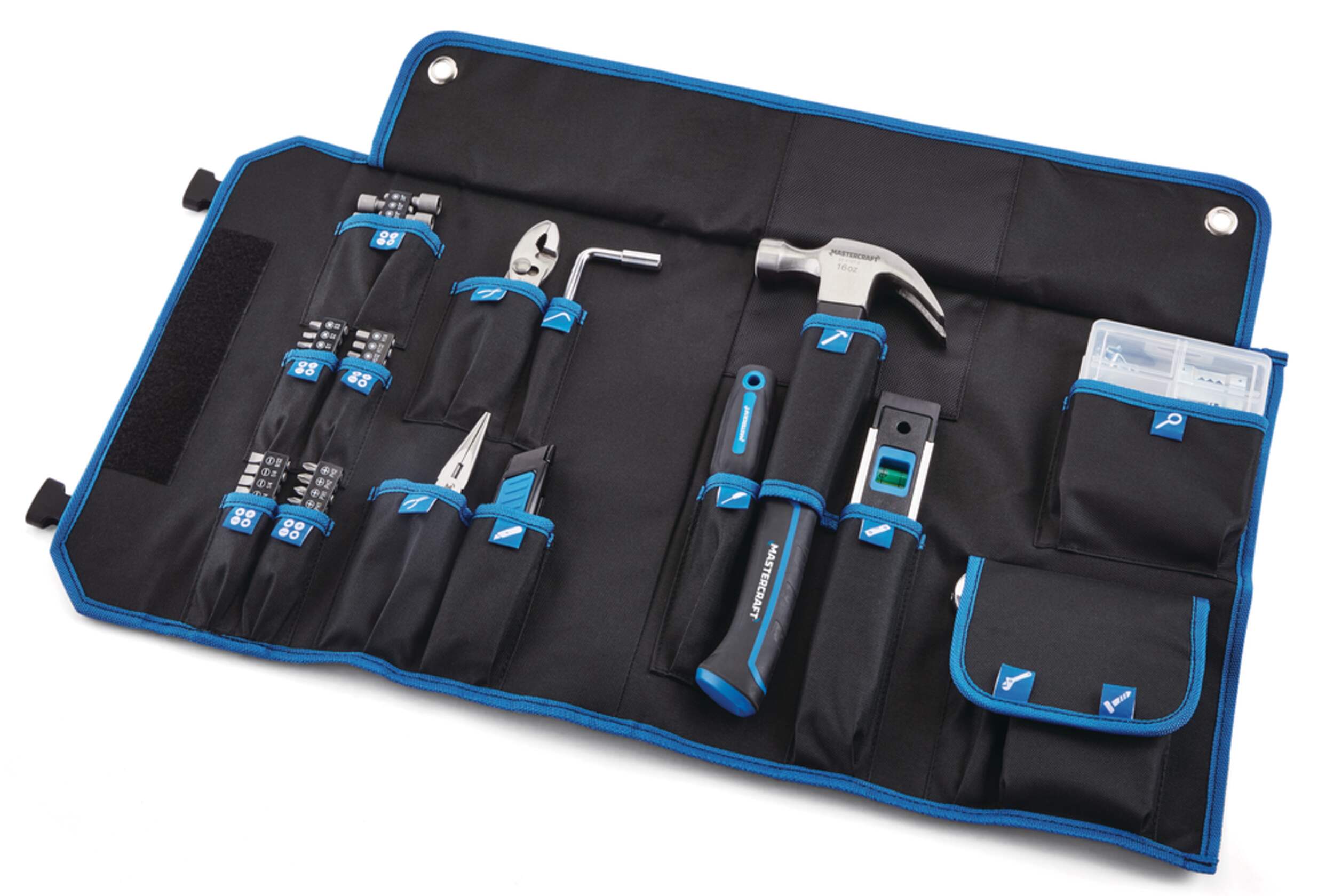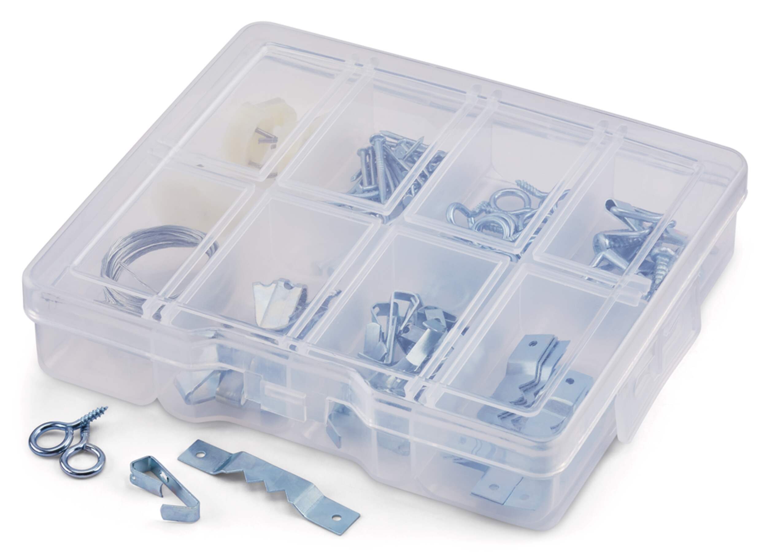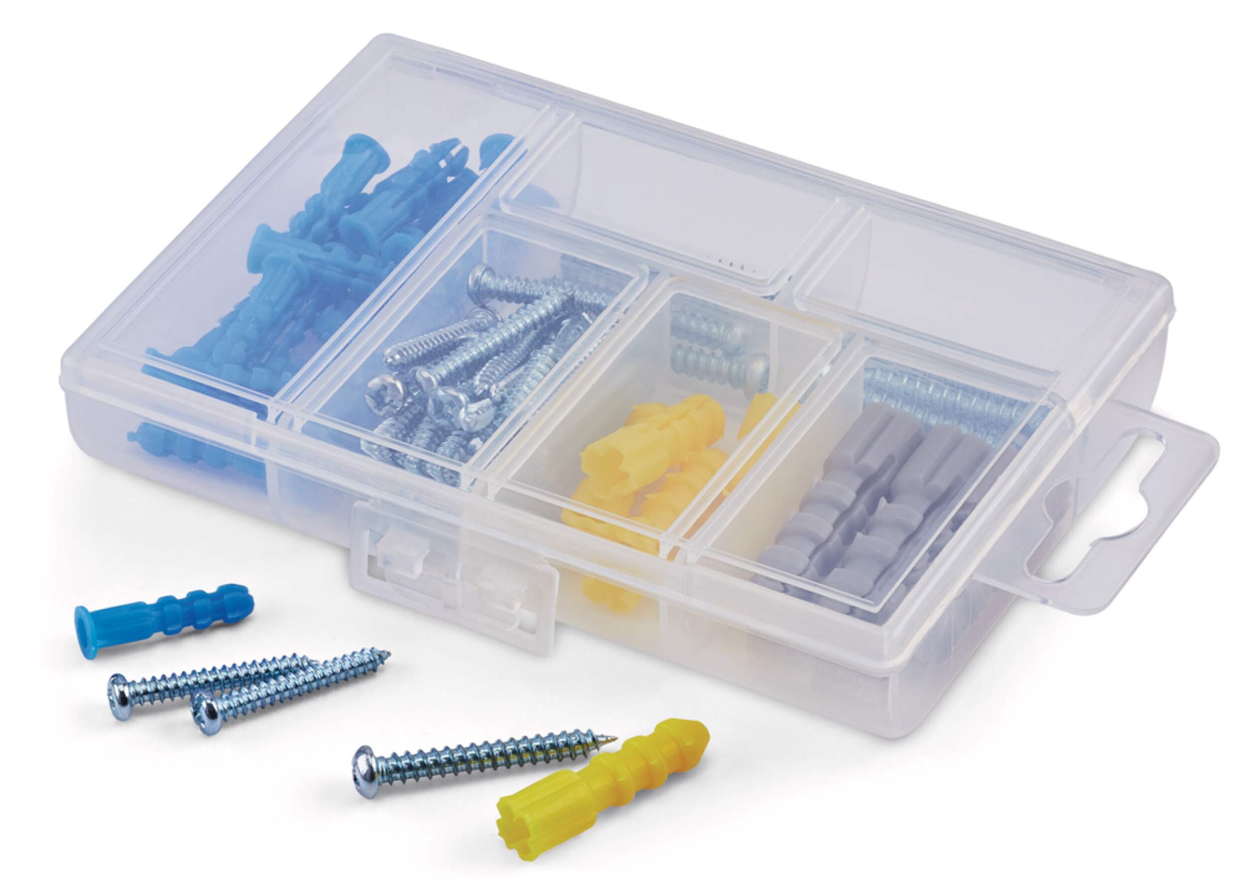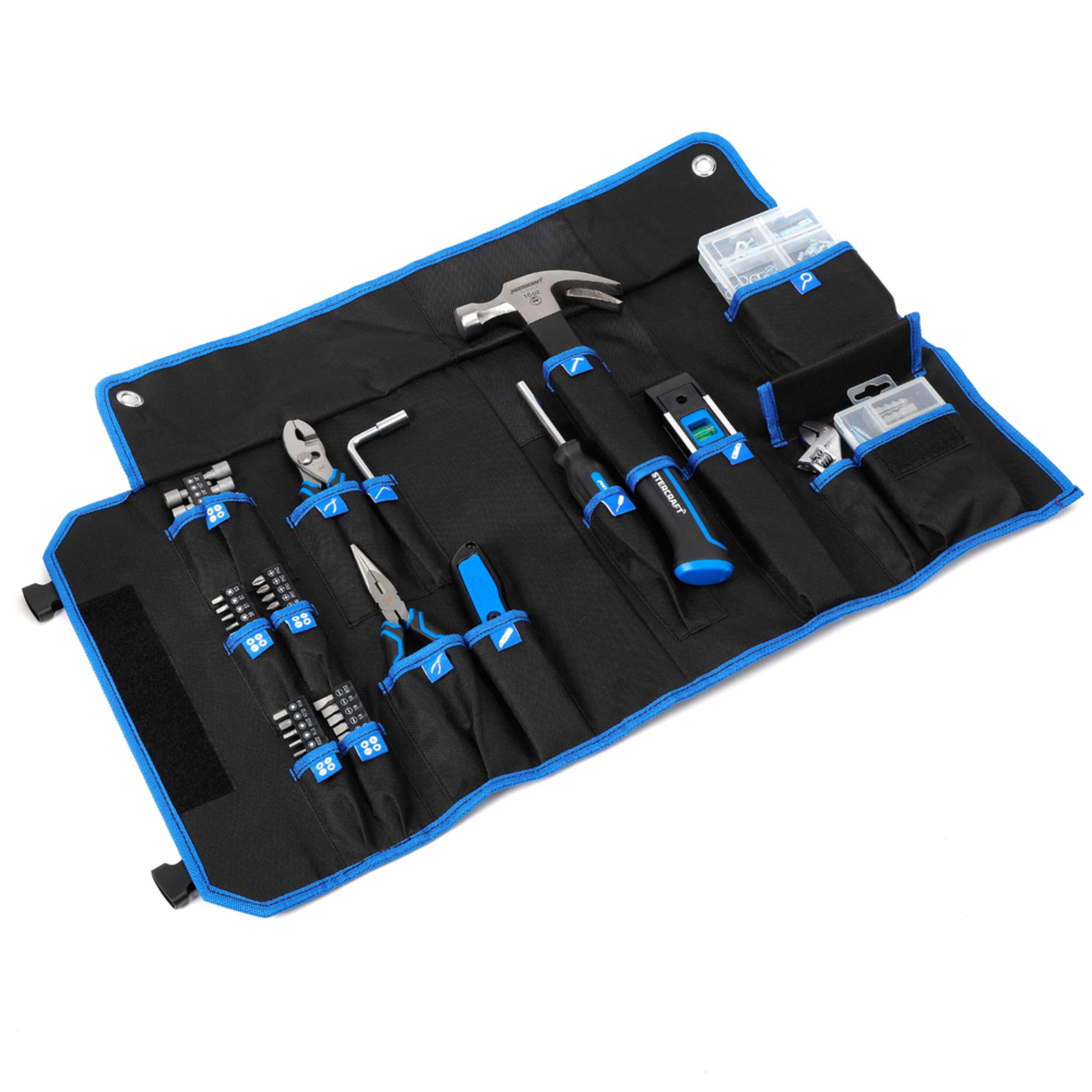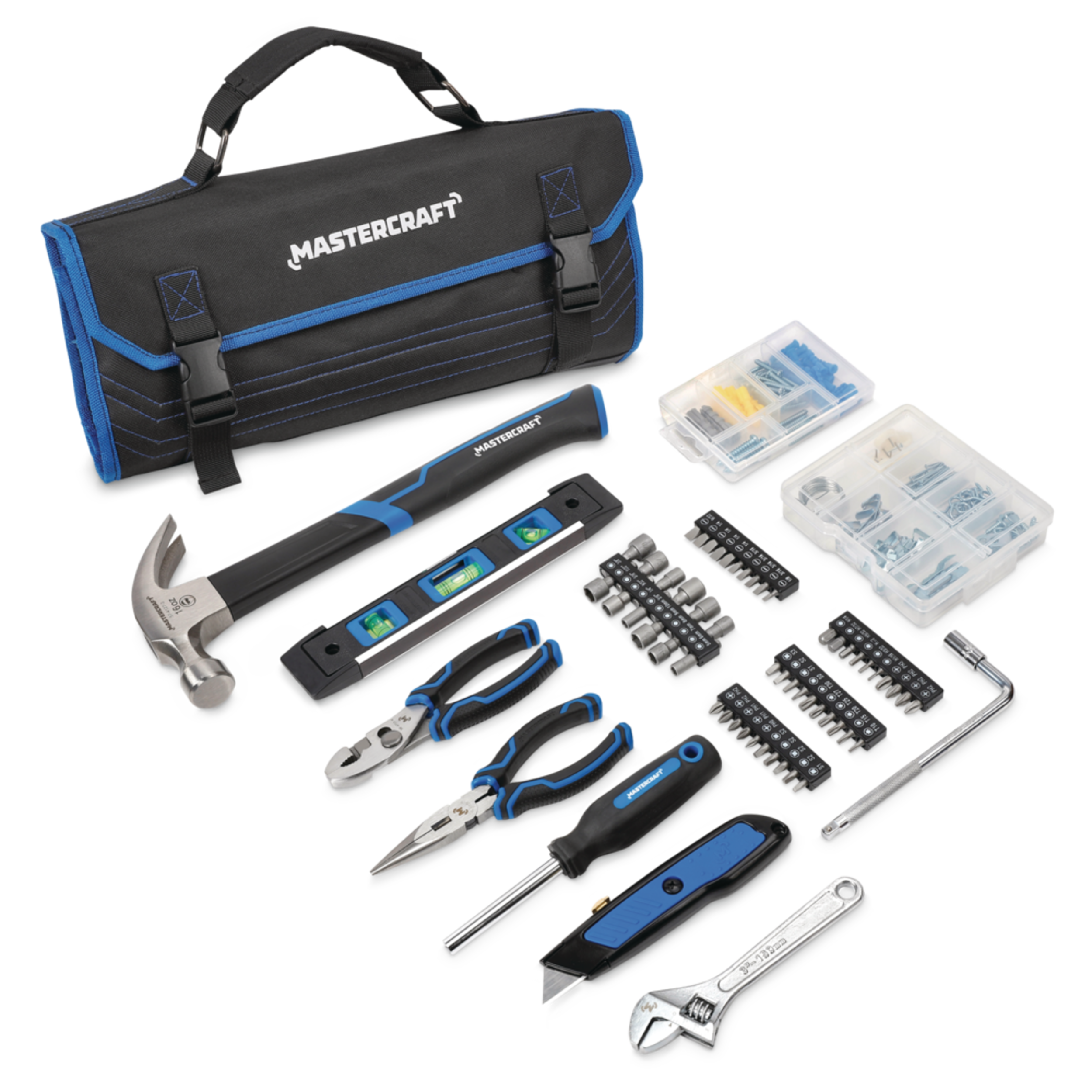 Tools and accessories include: 1 adjustable wrench, 1 long-nose pliers, 1 slip-joint pliers, 1 fibreglass hammer, 1 torpedo level, 1 magnetic L wrench, 1 retractable utility knife, 94-piece picture-hanging kit, 56-piece wall-anchor kit, 12-piece nut driver bit set, and 1 magnetic bit holder