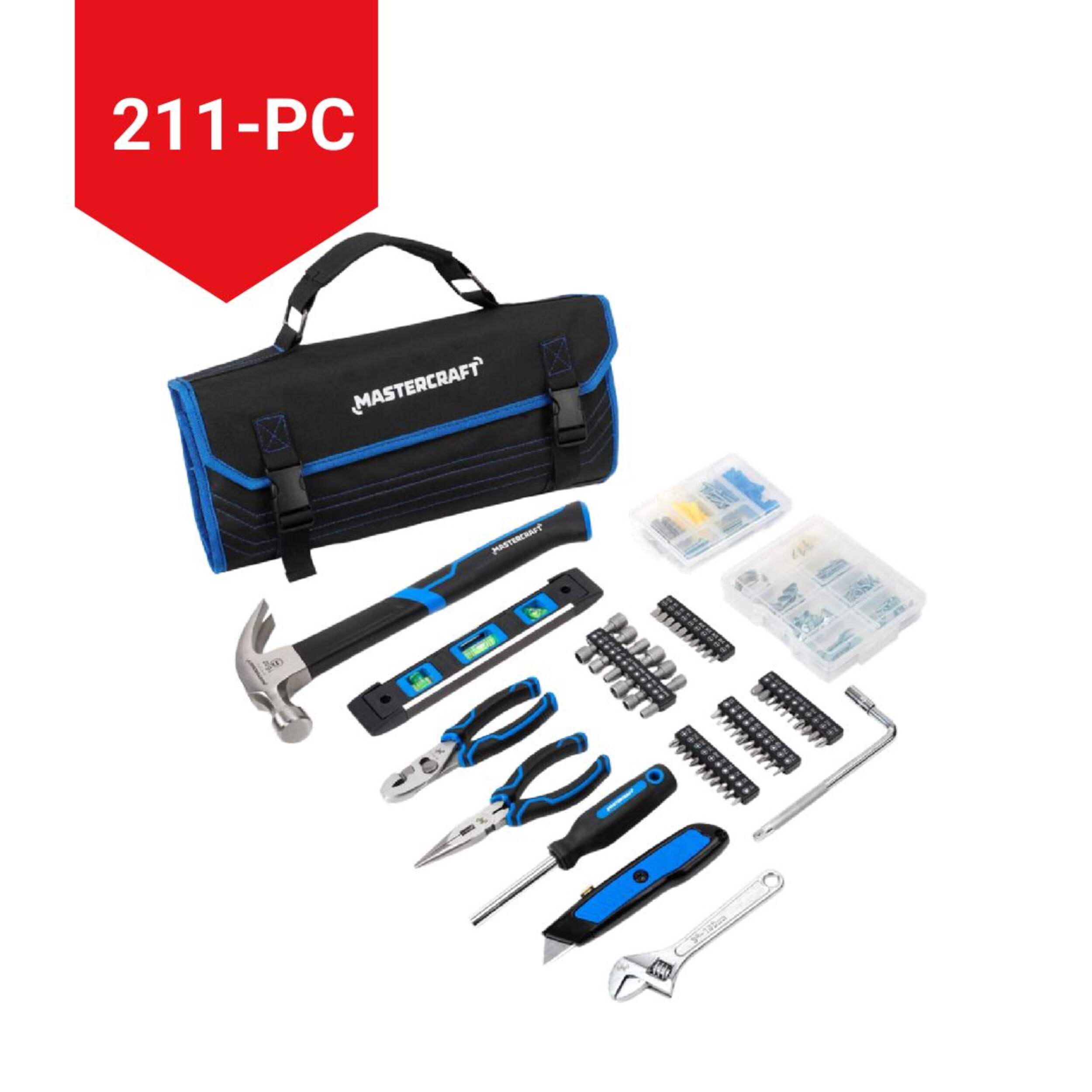 Tackle all your home repair tasks with ease using the Mastercraft Home Repair Tool Set, 211-pc. This comprehensive set includes a variety of hand tools made from durable carbon steel, perfect for basic DIY household repairs. The non-slip, double-injected handles ensure improved ergonomics for comfortable use. The kit features 40 screwdriver bits, an adjustable wrench, long-nose pliers, slip-joint pliers, a fiberglass hammer, torpedo level, magnetic L wrench, retractable utility knife, 94-piece picture-hanging kit, 56-piece wall-anchor kit, 12-piece nut driver bit set, and a magnetic bit holder.