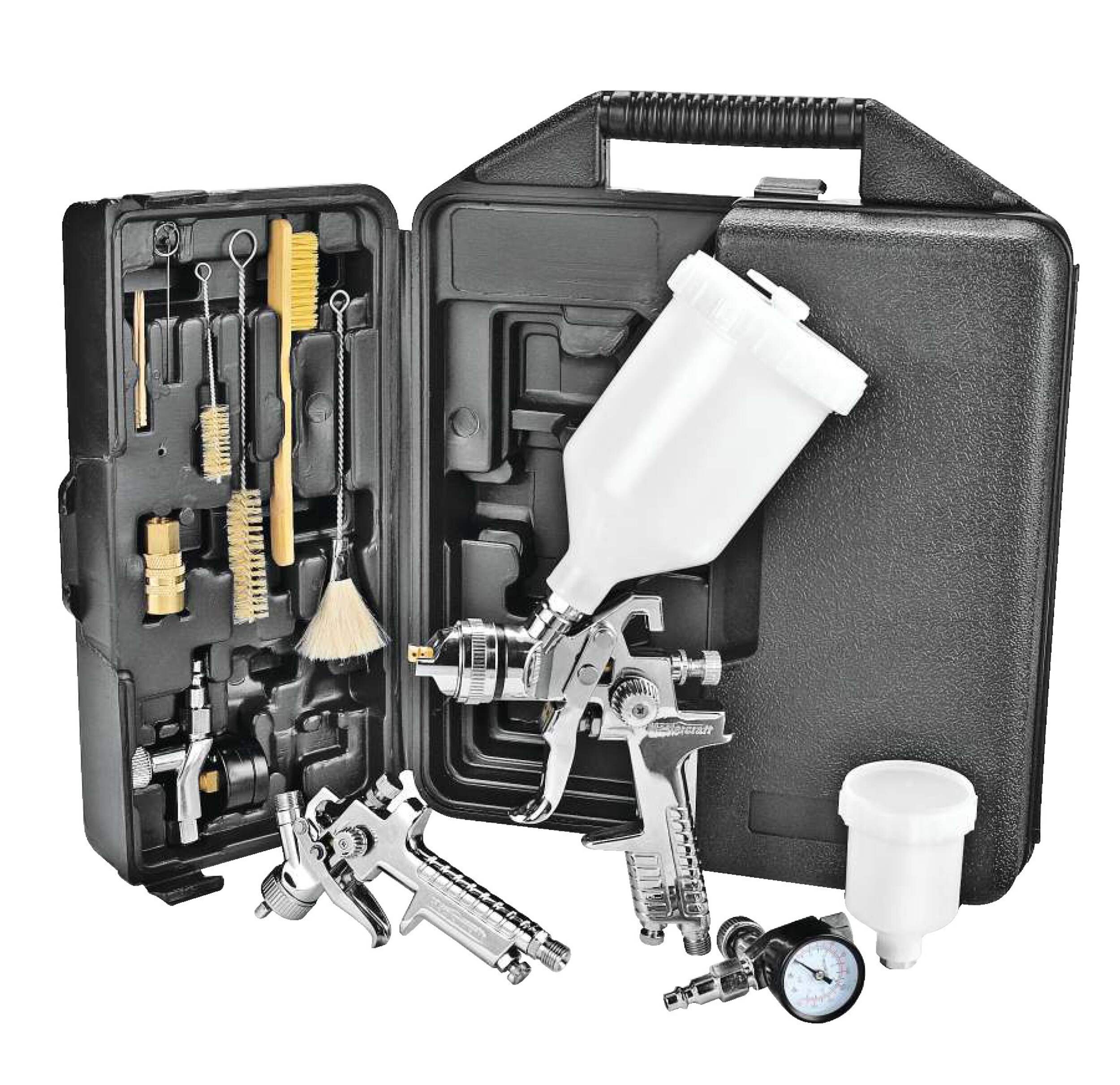 The Mastercraft HVLP Air Spray Gun Set, 36-pc is perfect for a wide range of projects, including hobby crafts, industry work, and car refinishing. Compact and lightweight, each cordless paint sprayer features a spray gun with extremely flexible spray pressure, paint pattern, and fluid inlet adjustment. Each paint sprayer has a stainless-steel needle and nozzle for extra longevity. Anti-drip canisters ensure that each gravity-feed air spray gun doesn’t make a mess. Each air-powered paint spray gun works with water-based paint. This set includes: air-powered gravity-feed spray gun, air-powered gravity-feed touch-up spray gun, 0.6 and 0.12 L anti-drip canisters, 2 air regulators, 5 inline paint filters, 10 paint filters, 5 wood picks, 5 cleaning tools, 1/4” NPT (F) coupler, two 1/4” NPT (F) plugs, hex wrench, and sealant tape.