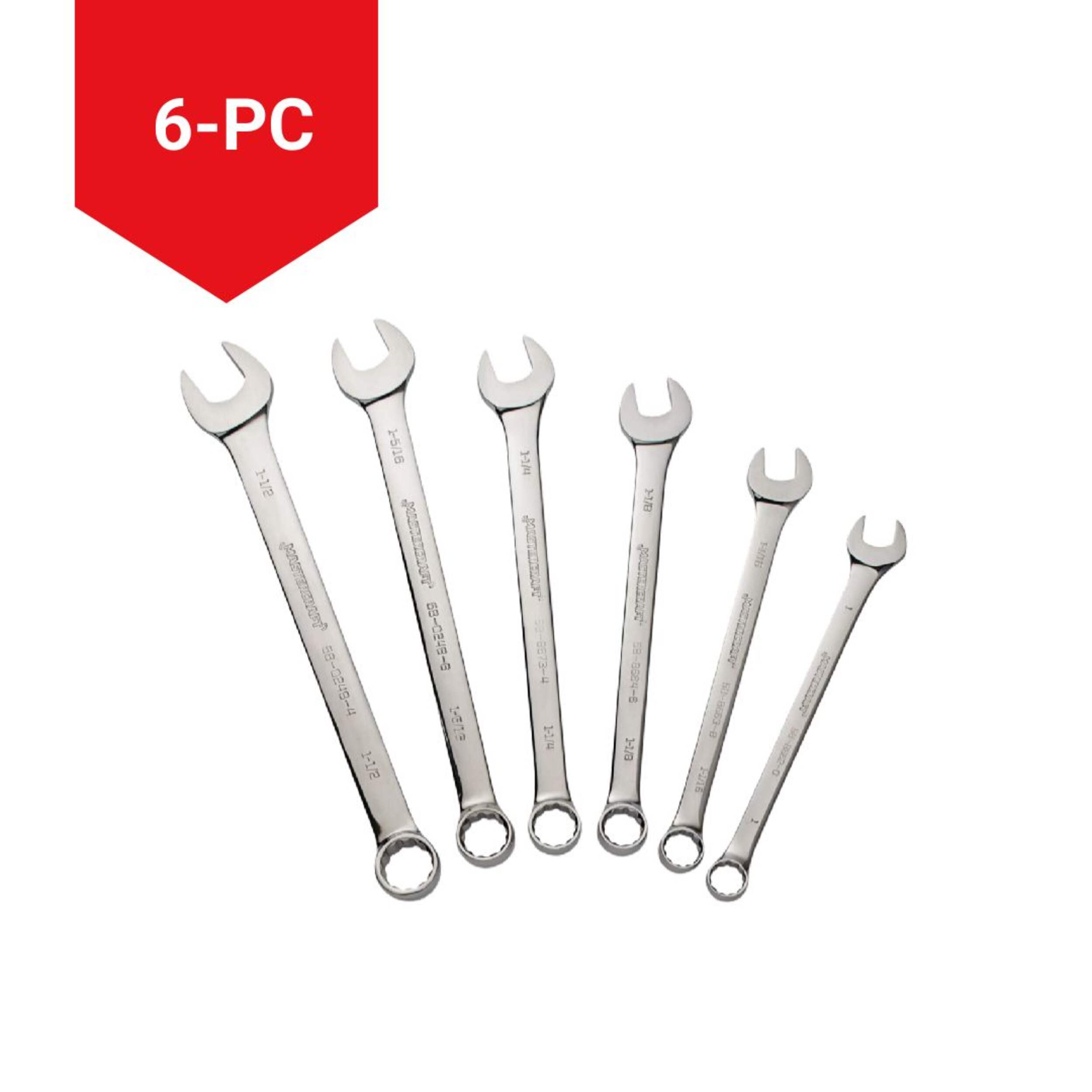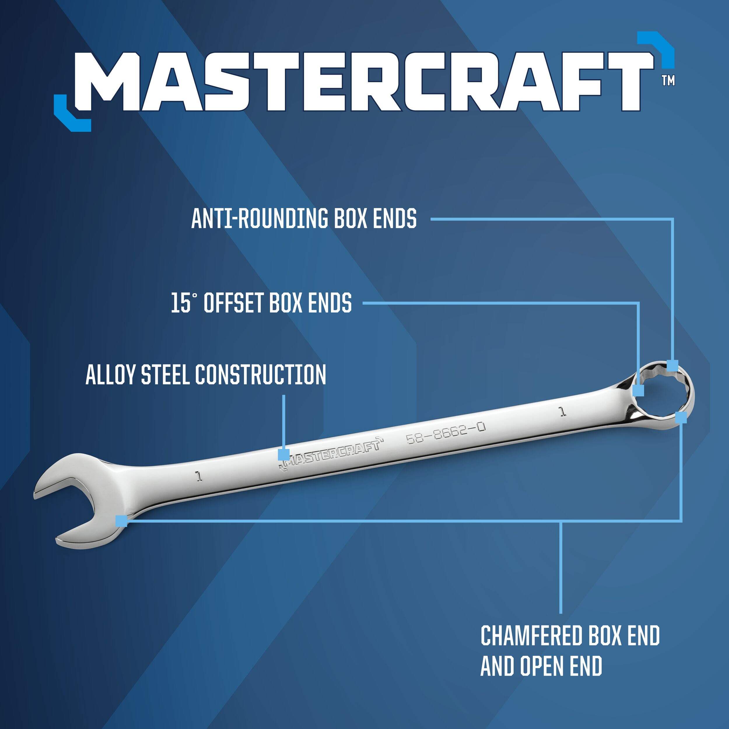 The Mastercraft Jumbo Wrench Set is meant to last a lifetime with premium grade alloy steel construction and a corrosion-resistant polished finish. The tools in this set of oversized wrenches ensure that you have maximum strength and leverage for the most difficult tasks. Each SAE-size jumbo wrench features a 15° offset box end for easier operation with an anti-rounding design. The chamfered box end and open end provide lead-in for easier placement on fasteners.