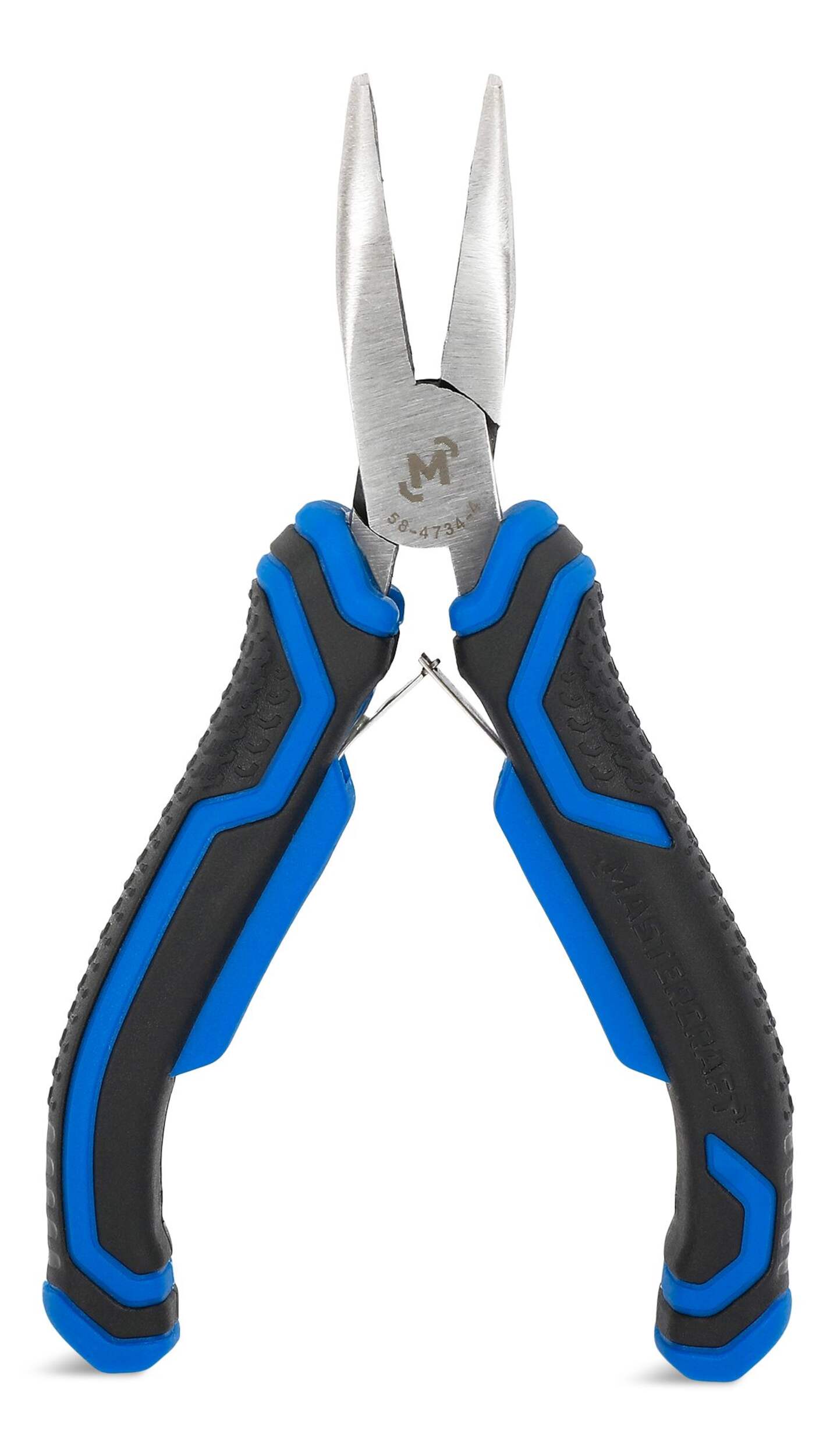 The Mastercraft 4 ¾” Mini Bent Nose Pliers feature a durable high-carbon steel frame with double-injected moulded handles for improved comfort and control