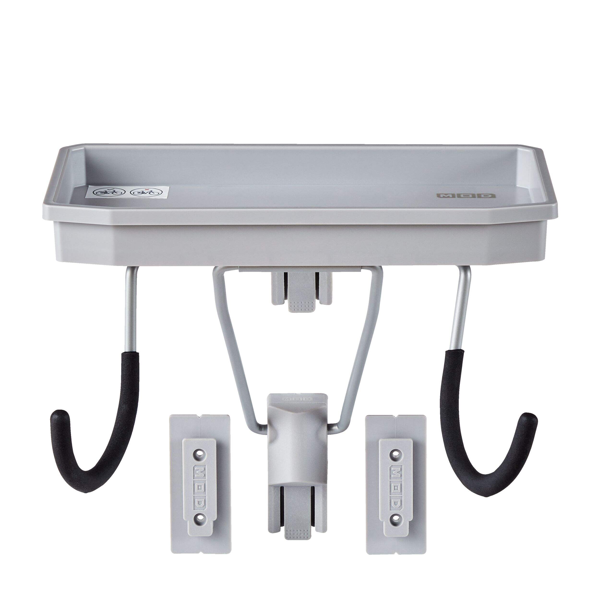 Easily and conveniently store your bike with the Mastercraft MOD Horizontal Bike Storage Rack and Hanger with Shelf, which has a load capacity of 50 lbs (22.7 kg). This wall-mounted bike rack is designed to keep your area organized while saving valuable floor space. It stores your bike horizontally, making it ideal for both exposed studs and finished walls. This versatile bicycle wall mount is constructed from reinforced nylon and steel. As part of the Mastercraft MOD garage organization system, this hanger is compatible with the Mastercraft MOD stud mount bracket, MOD starter kit, and MOD wall track kits.