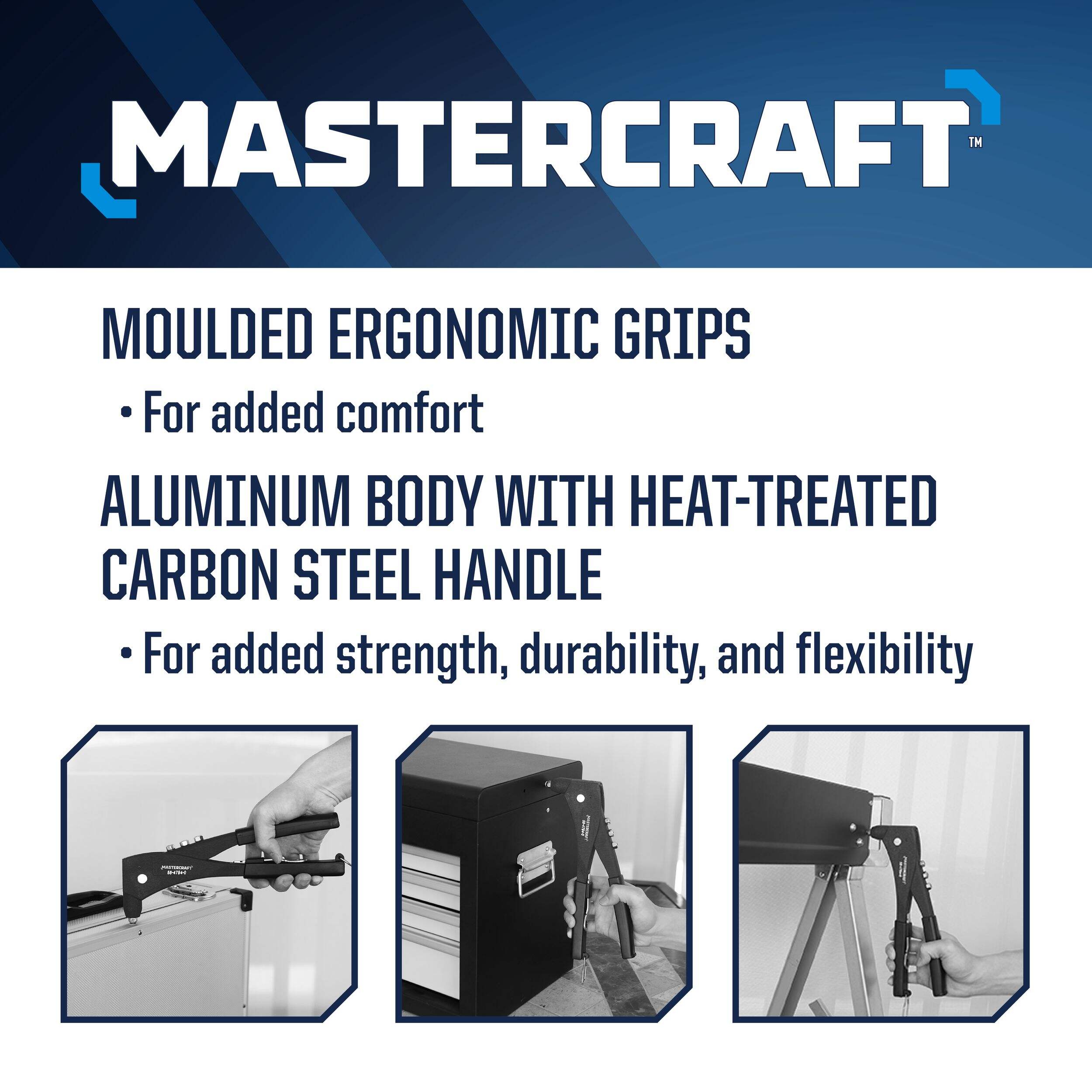Effortlessly join or fasten materials with the Mastercraft 10-in One Hand Rivet Gun Kit. This versatile kit includes a hand riveter, 50 assorted rivets, and 20 aluminum backup plates, offering everything you need for fastening metal, canvas, leather, or plastic. With a lifetime warranty, you can trust this rivet gun for countless future uses. Whether you're working on DIY projects or professional repairs, this rivet gun kit delivers reliable, long-lasting performance.