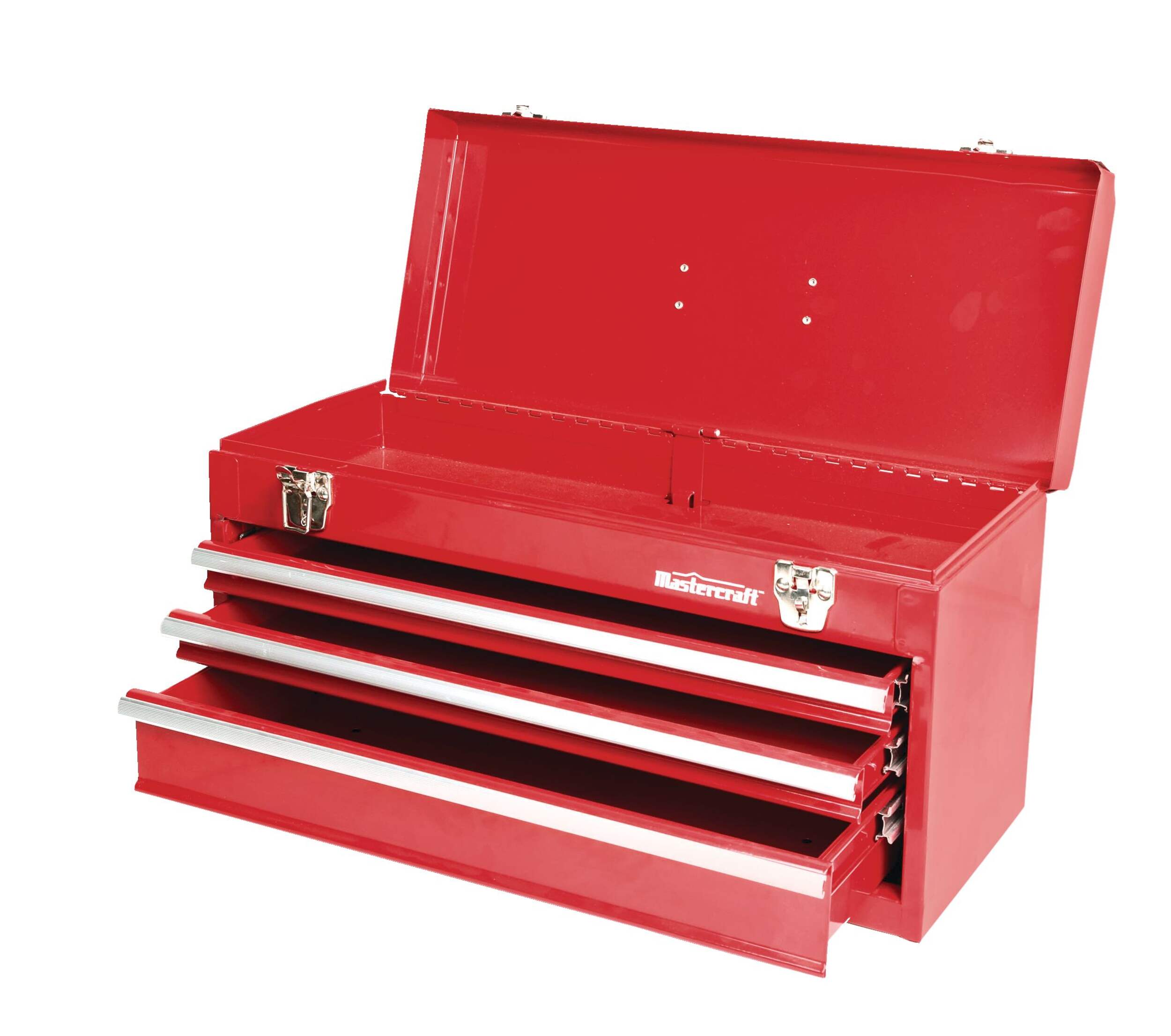 The Mastercraft Metal 3-Drawer Chest is designed for ultimate tool security and accessibility. Featuring three pull-out drawers for easy organization, this tool chest ensures your tools are within reach. The top lid opens to reveal a compartment that can be securely closed and locked with durable metal latches, providing additional storage options. Finished in a vibrant red, this highly visible storage solution stands out while offering adaptable storage for ongoing projects and jobs. Whether you need extra tool storage or simply have too many parts and accessories for your existing toolbox, the Mastercraft chest is your go-to solution for organized efficiency.