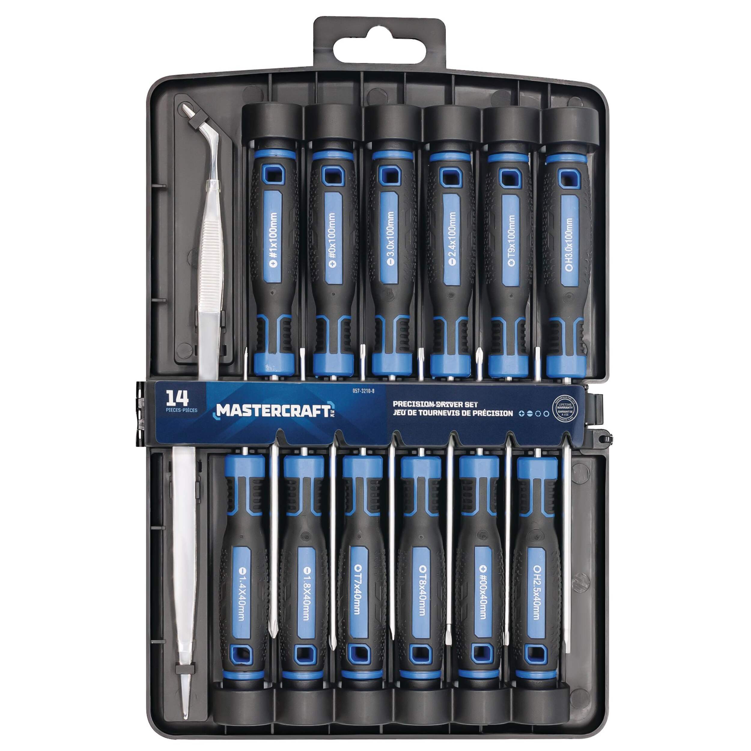 For repair jobs that require great attention to detail, rely on the Mastercraft Precision Screwdriver Set. It includes 6 precision drivers with a 40 mm blade length and 6 precision drivers with a 100 mm blade length. Additionally, the set contains offset tweezers and straight tweezers. Each precision screwdriver has a rotating cap on the handle, making it ideal for precision repair jobs. Use this precision screwdriver set for small repair jobs on electronics, watches, glasses and jewellery.