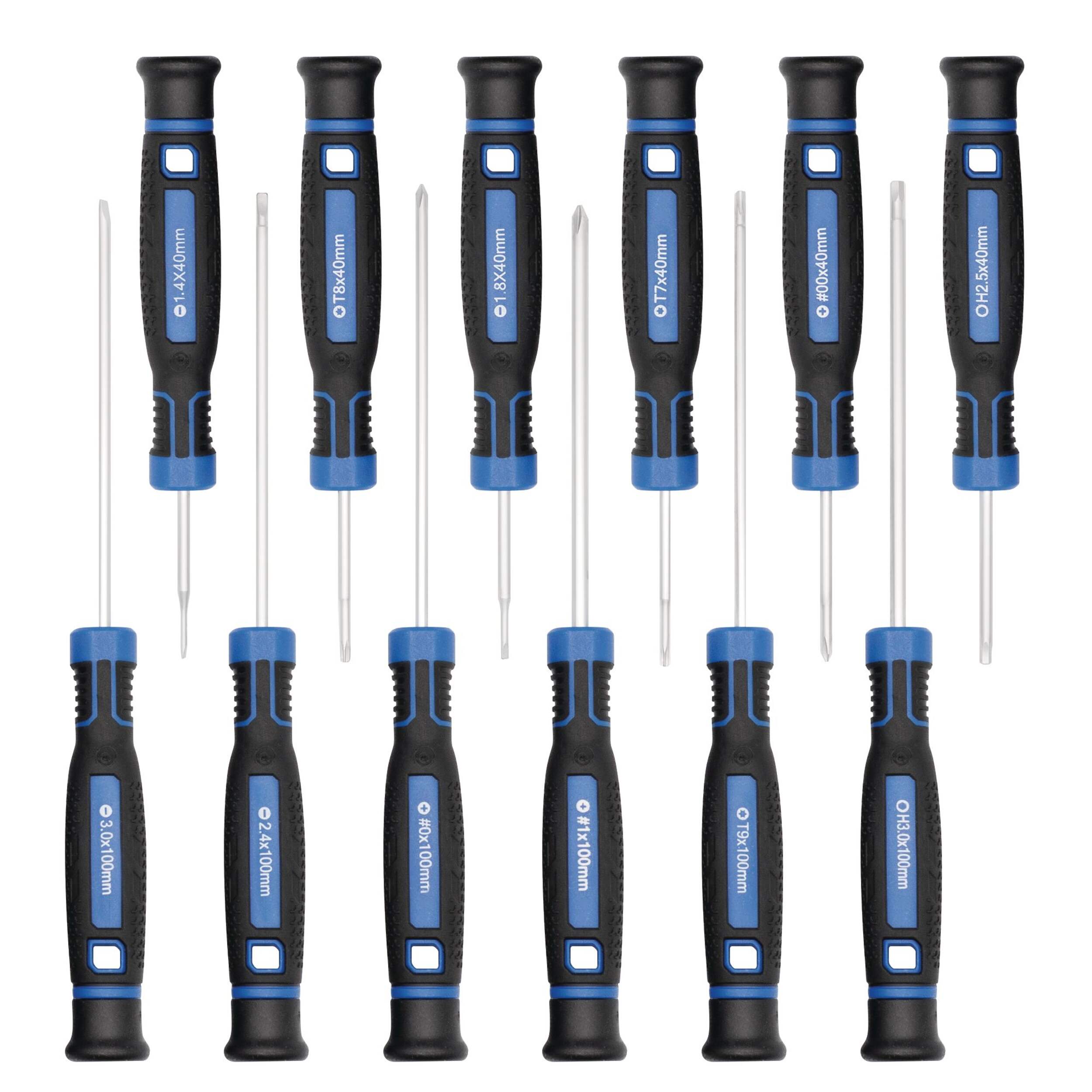 This set includes 6 precision drivers with 40 mm blades (2 slotted, 1 phillips, 2 torx and 1 hex) as well as 6 precision drivers with 100 mm blades (2 slotted, 2 phillips, 1 torx and 1 hex)