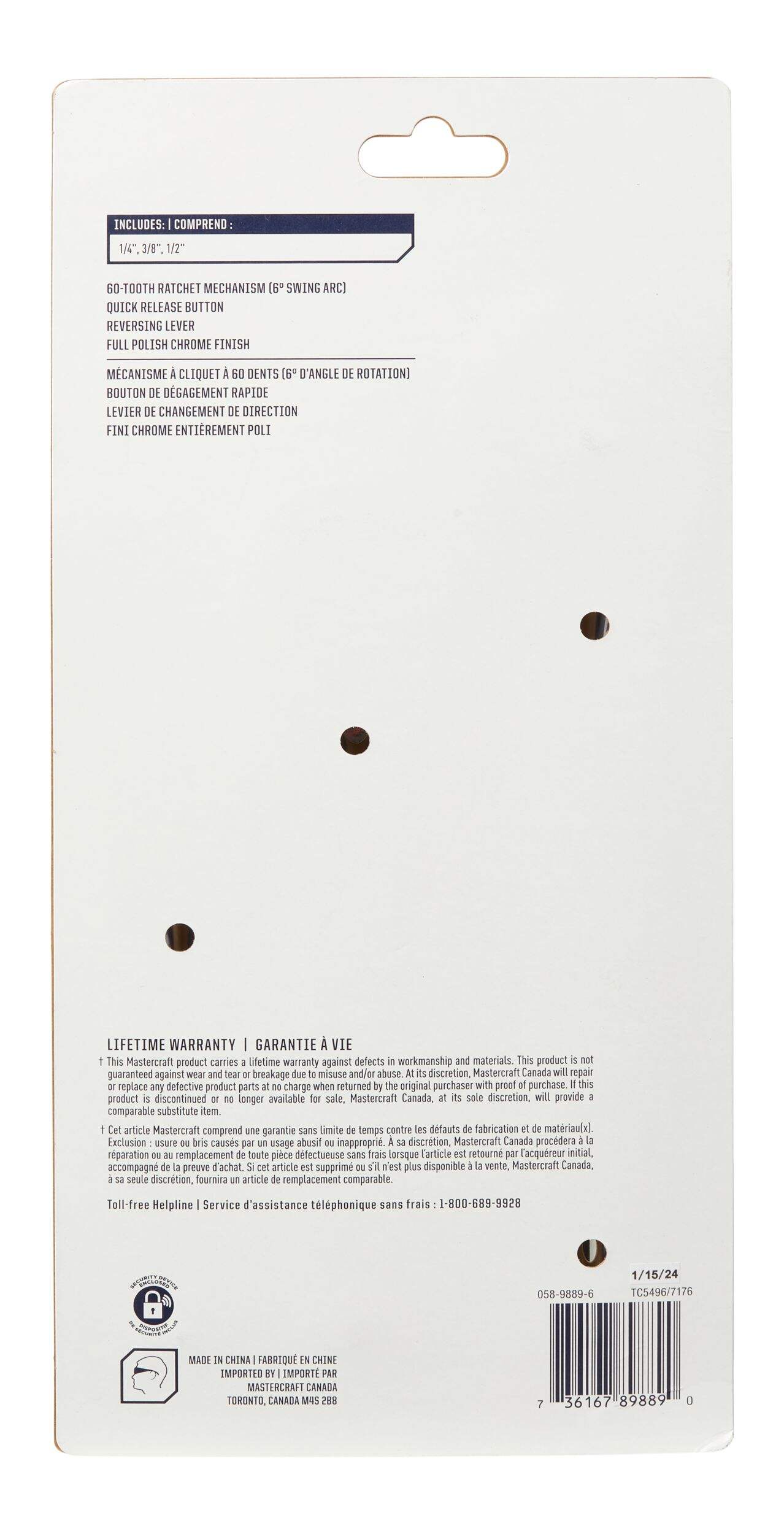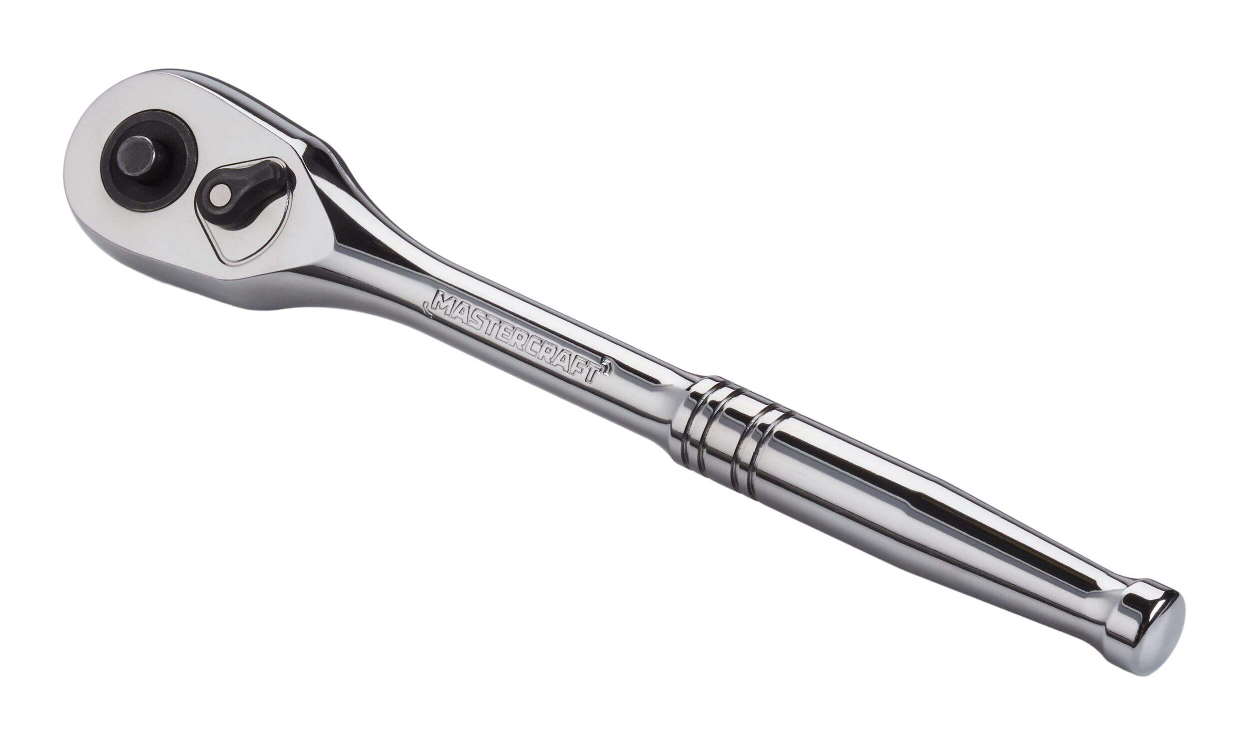 The Mastercraft Ratchet Set includes 1/4 drive, 3/8 drive, and 1/2 drive 60-tooth teardrop ratchets for a variety of applications. The teardrop-style design provides a lower profile head for better access in tight areas, while the 60-tooth mechanism only requires a 6-degree swing to move fasteners.