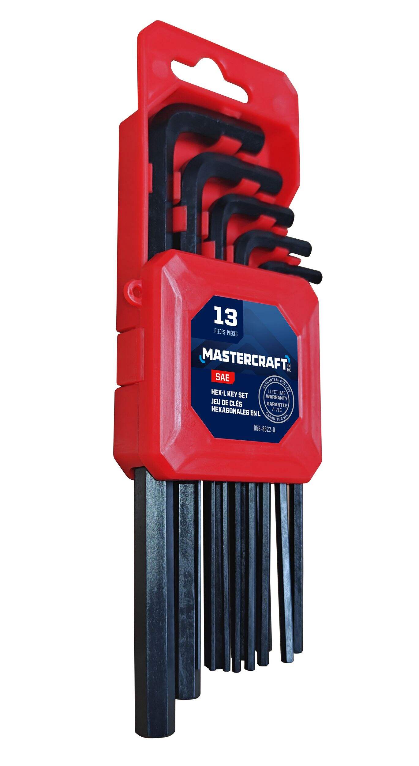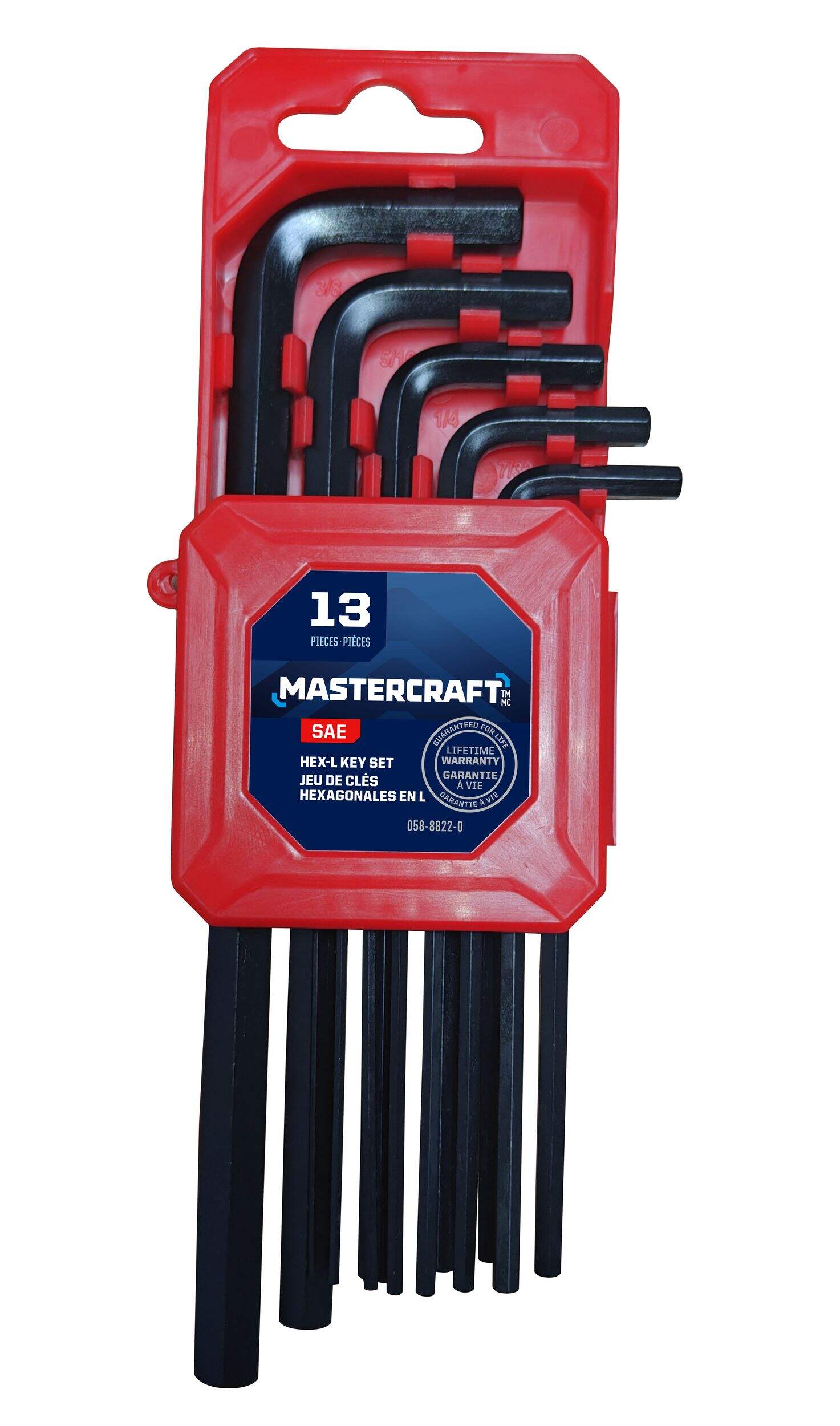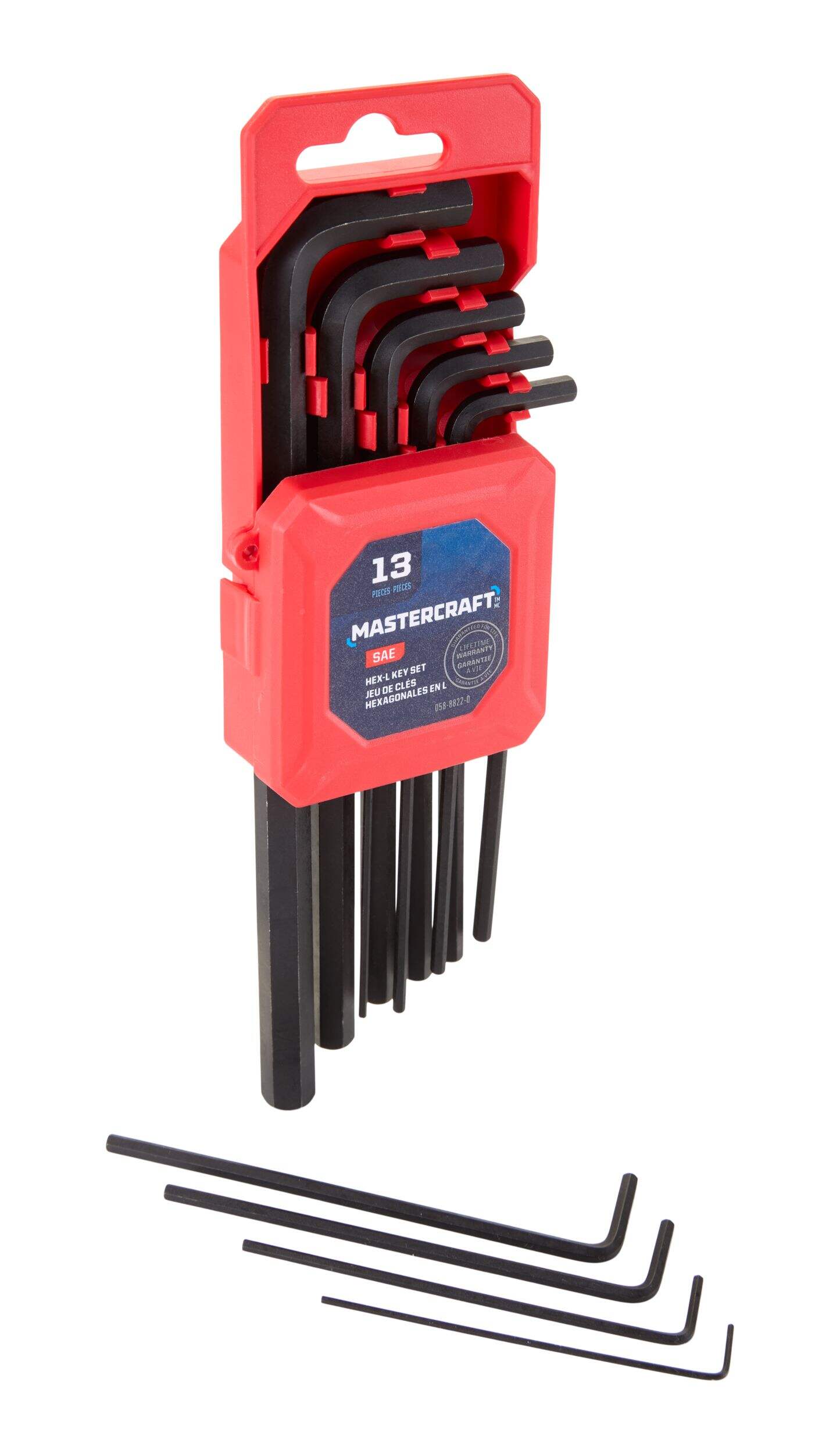 Accomplish repair or maintenance projects easily with the Mastercraft SAE 13 Piece Long Arm Hex Key Set. These long-arm hex keys are specially designed to help you access tight spaces. The key set includes various sizes: 0.05, 1/16, 5/64, 3/32, 7/64, 1/8, 9/64, 5/32, 3/16, 7/32, 1/4, 5/16, and 3/8 inches to help you with various onsite or DIY projects. All the keys have laser-etched size markings for easy size identification. The SAE hex key set is made from high-quality chrome-vanadium steel for extra durability and longevity. Each top-grade hex key resists rotational distortion for maximum performance. The Allen keys have chamfered ends on both sides to help guide them into the fastener and enable quick and easy changes. This hand tool includes a lifetime exchange warranty with hassle-free replacement.