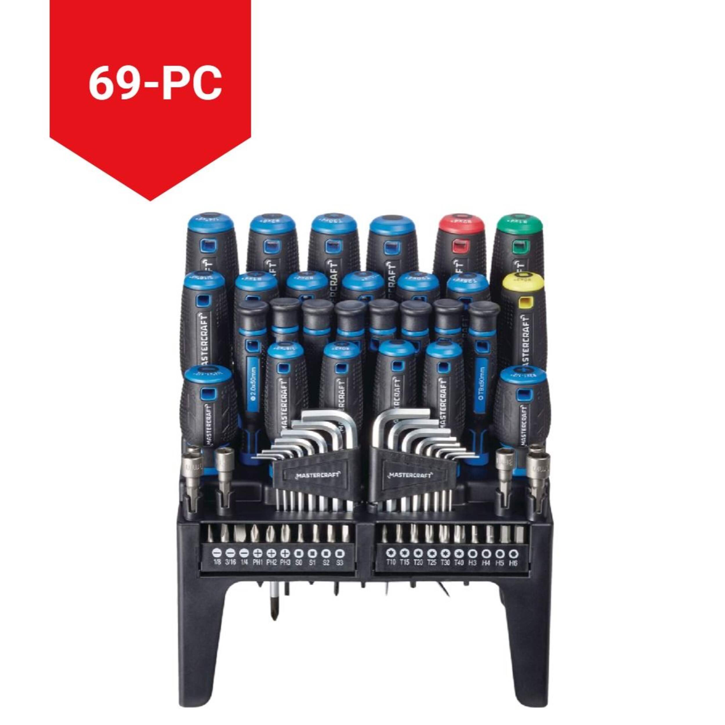 The Mastercraft Screwdriver Set is designed to keep tools neatly organized for a wide range of projects. The tools in this durable, long-lasting screwdriver set have a contoured triangular handle for a comfortable, ergonomic grip. Chrome-vanadium steel blades improve the resiliency of the tools for lasting use. This handy screwdriver set includes 8 precision drivers, 6 nut drivers, 16 hex keys, 20 screwdriver bits, a multi-bit driver, a 3" awl, a 3" hook, and a convenient storage container.