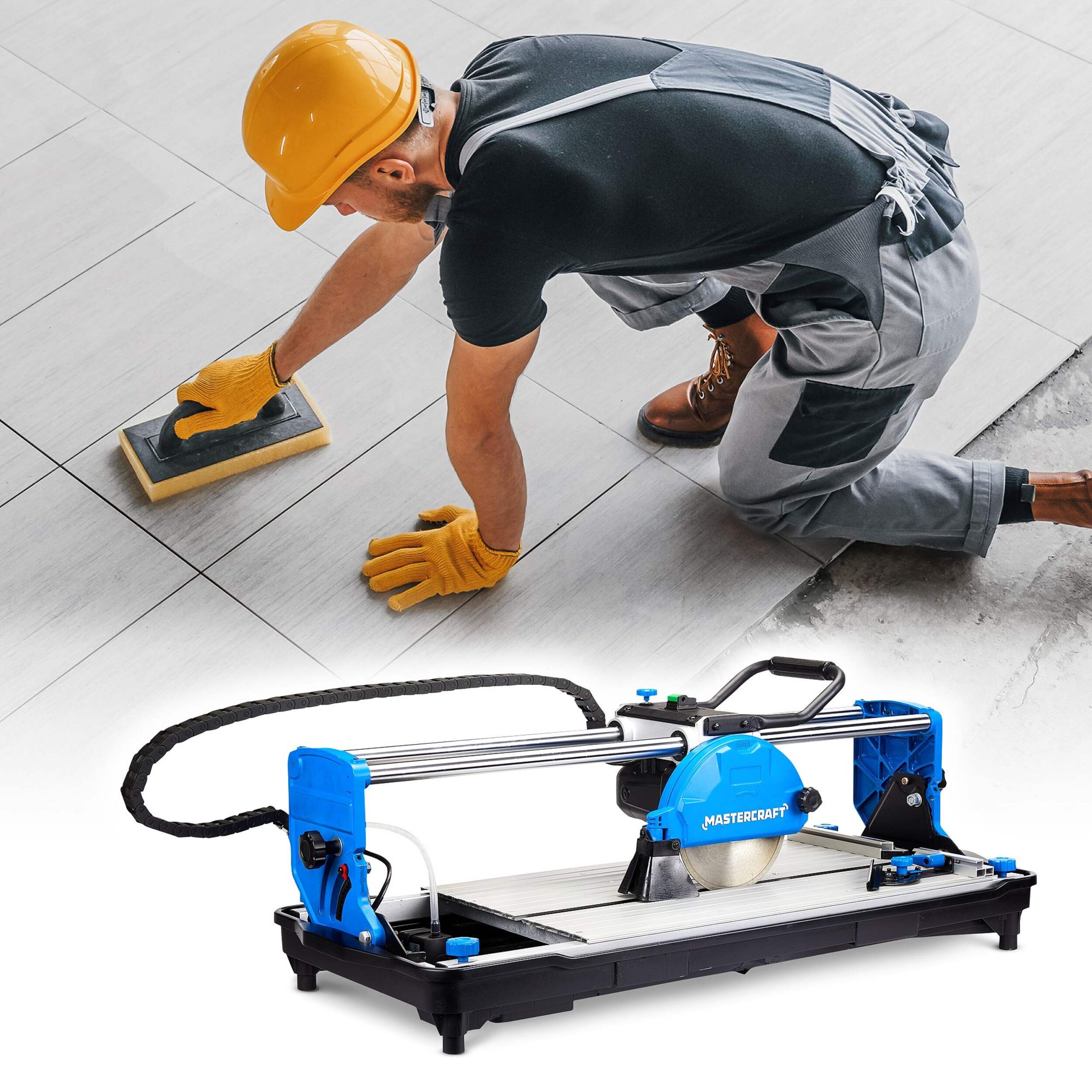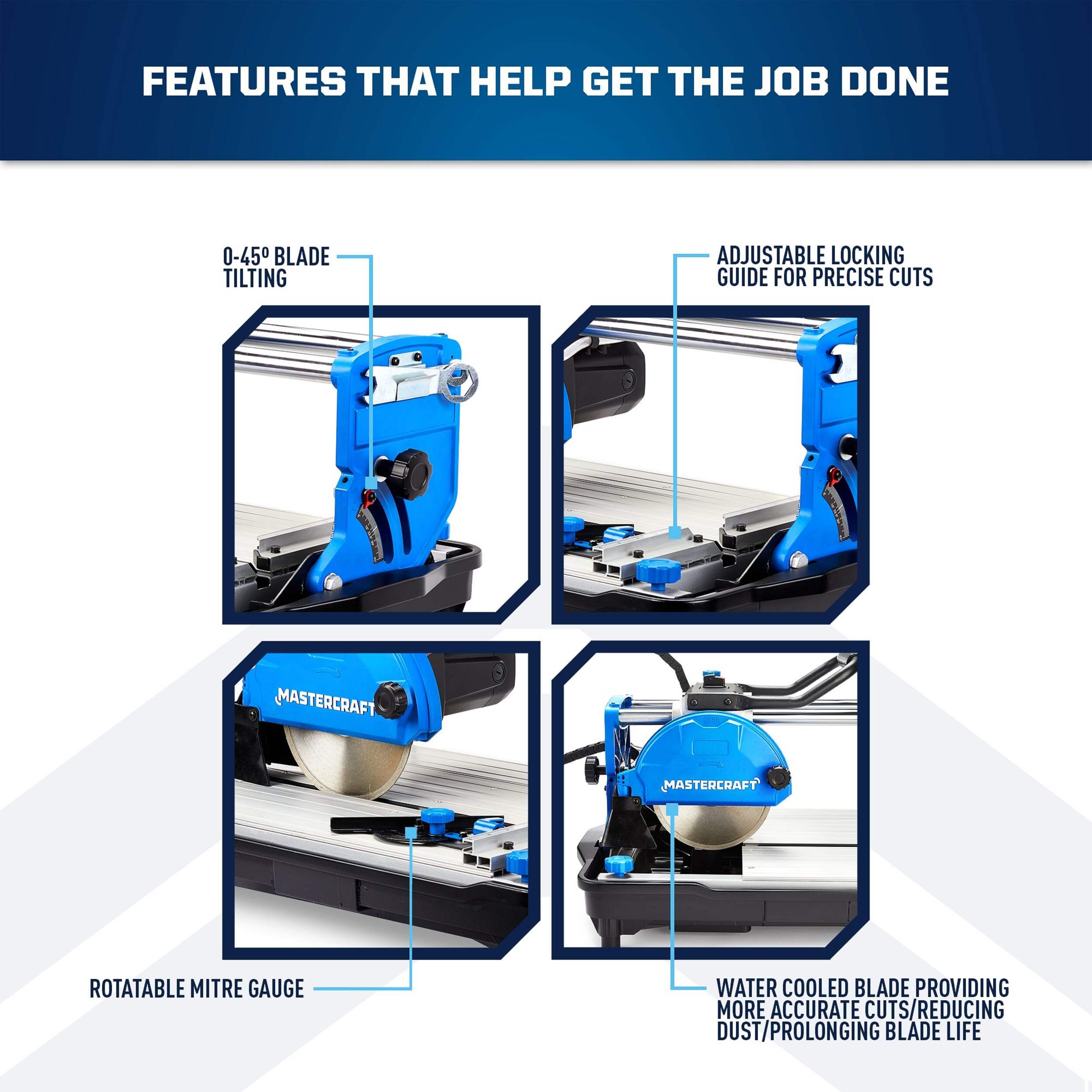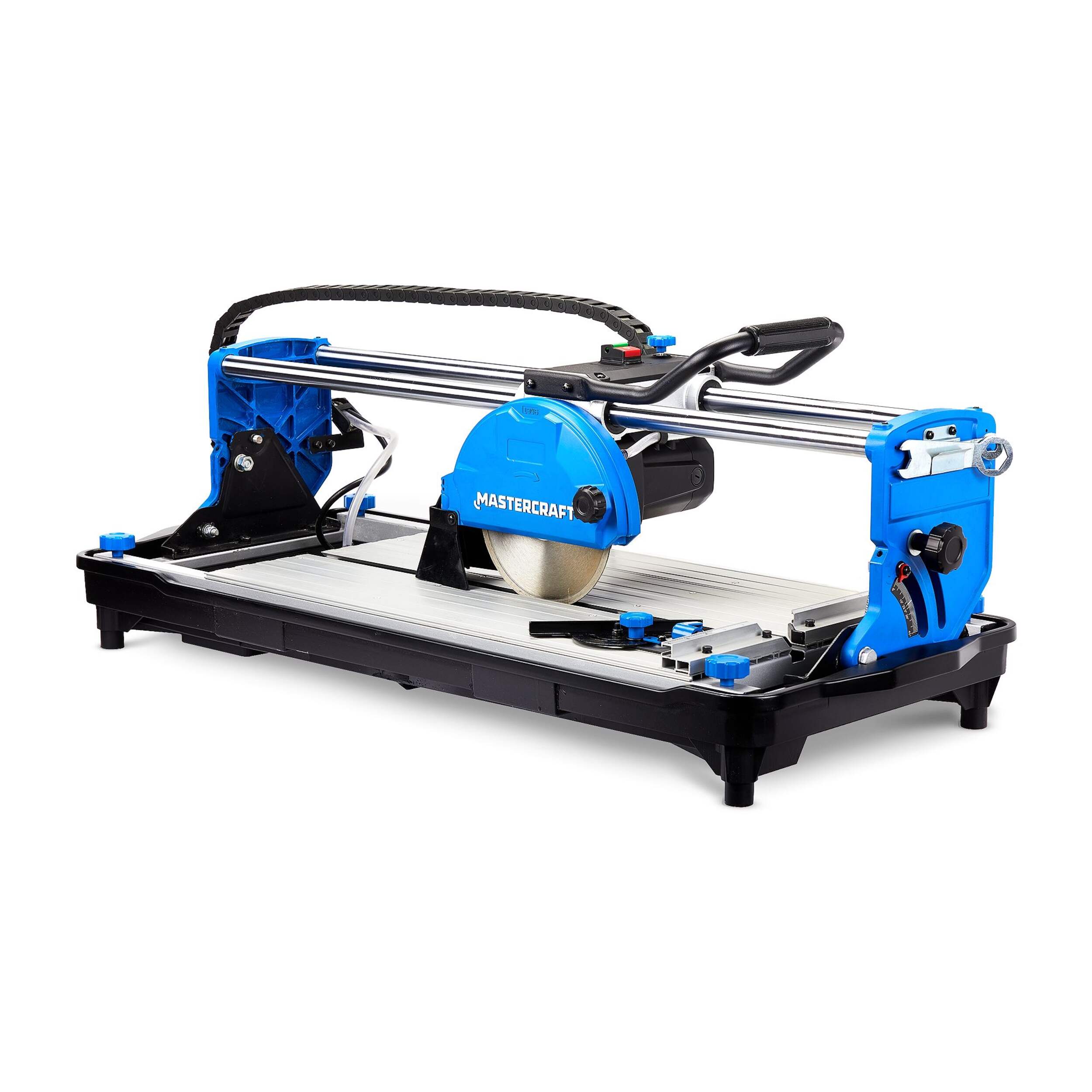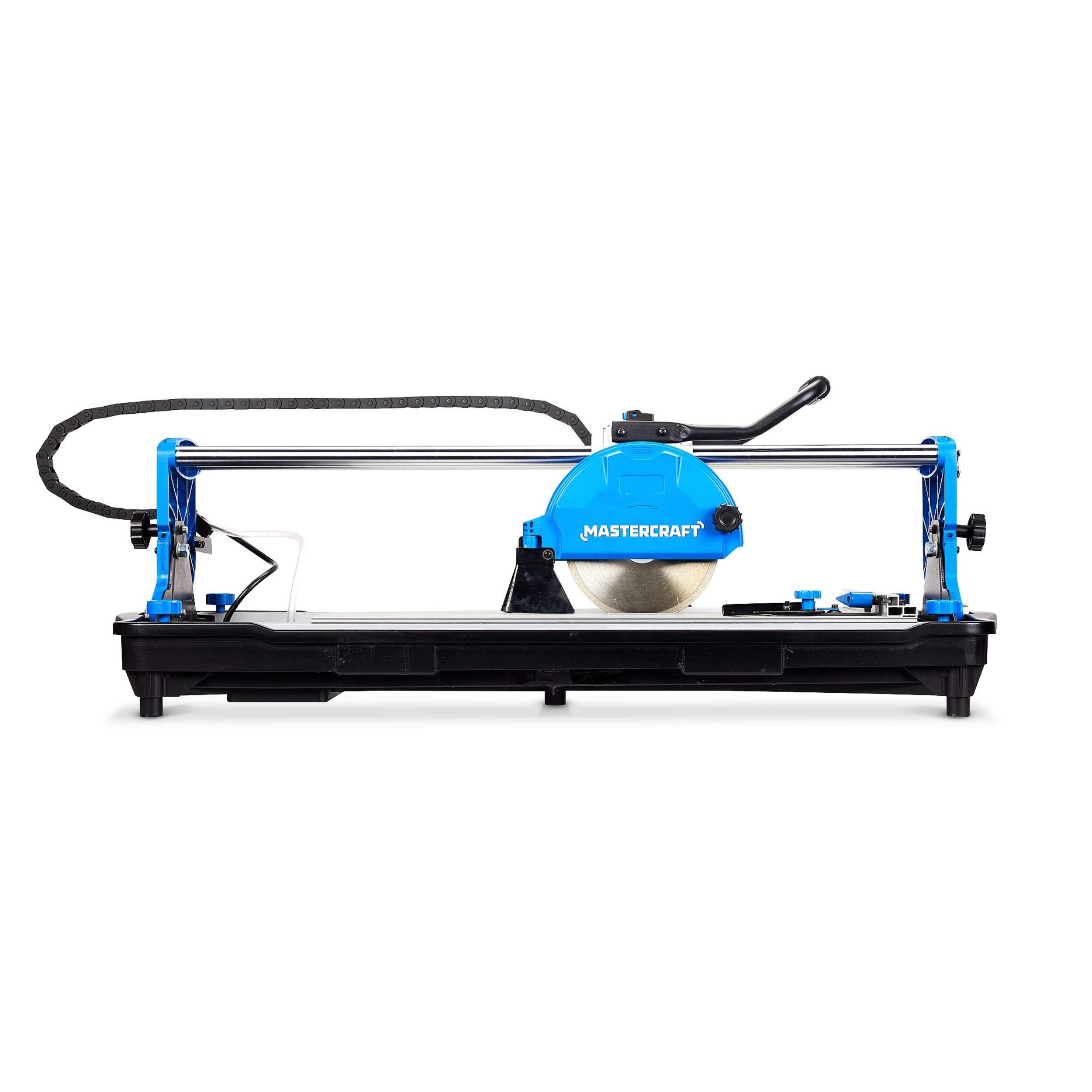 Cut through materials with ease and accuracy with the Mastercraft Sliding Wet Tile Saw. This durable 7-in wet saw is ideal for tackling tiling projects, providing the precision and power you need to get the job done right. This wet tile saw is your go-to tool to tackle tiling projects with confidence. The saw provides a generous bevel range and pinpoint accuracy to produce the finest of cuts to complete your projects beautifully.