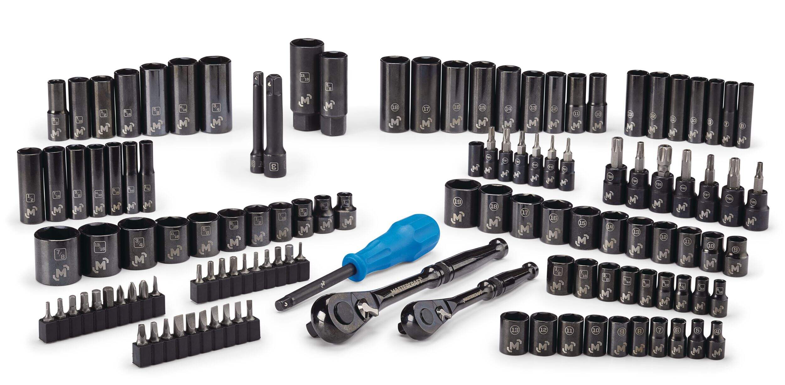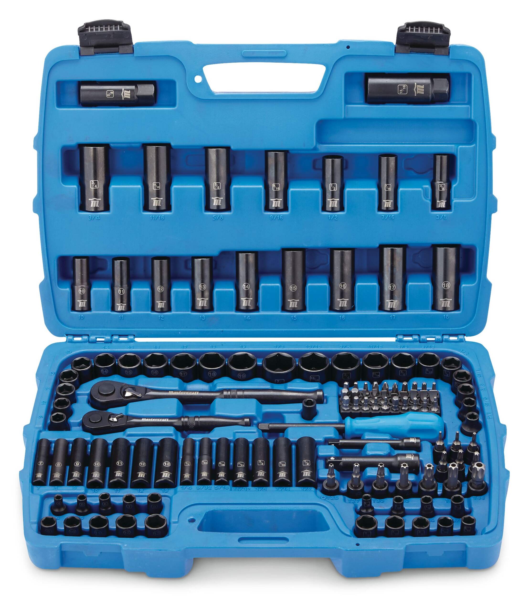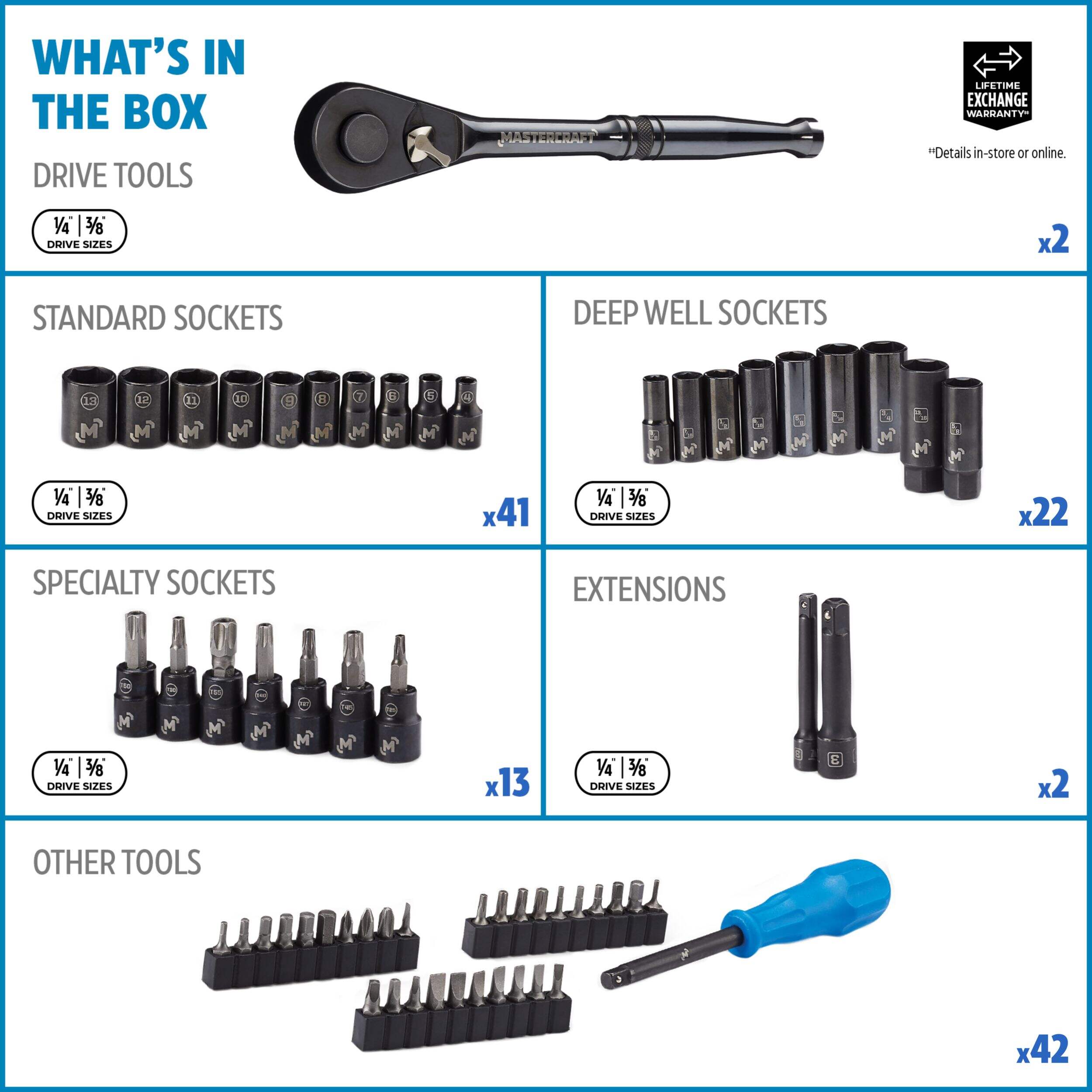 The Mastercraft Black Steel Socket Set features a comprehensive selection of standard, metric, shallow and deep sockets in 1/4" and 3/8-in drive sizes ideal for automotive repair and home maintenance tasks. Built to last, every item in this socket set has an industrial-grade black steel finish for maximum corrosion protection. A blow-moulded carrying case provides added convenience, protection and portability.