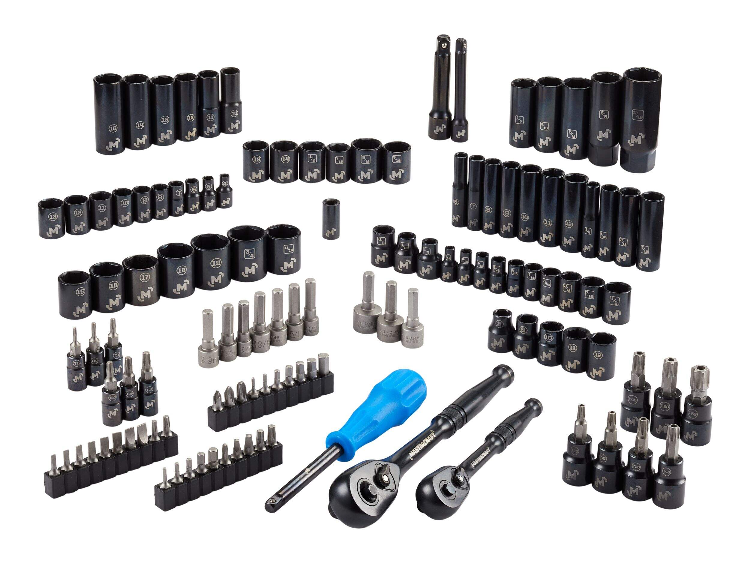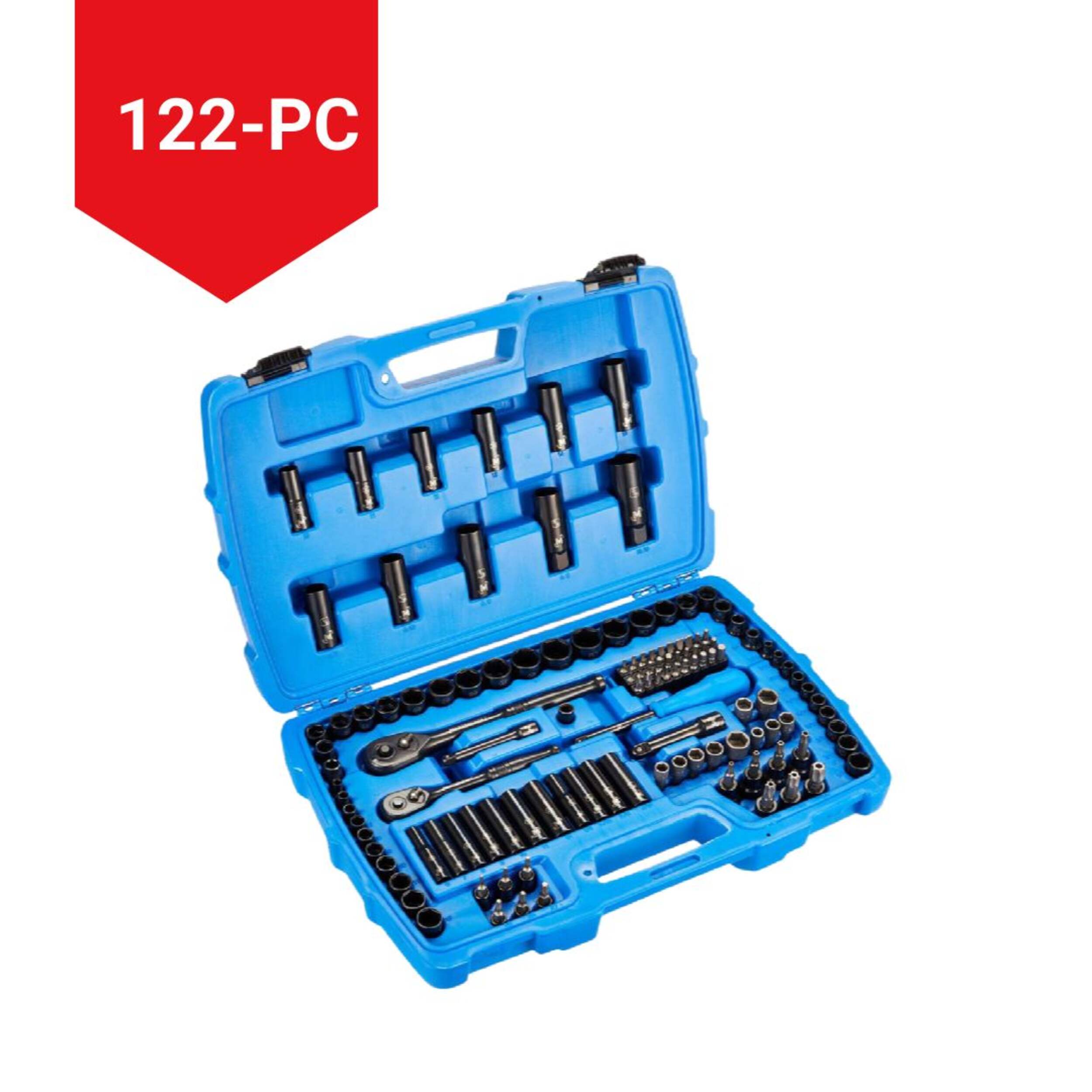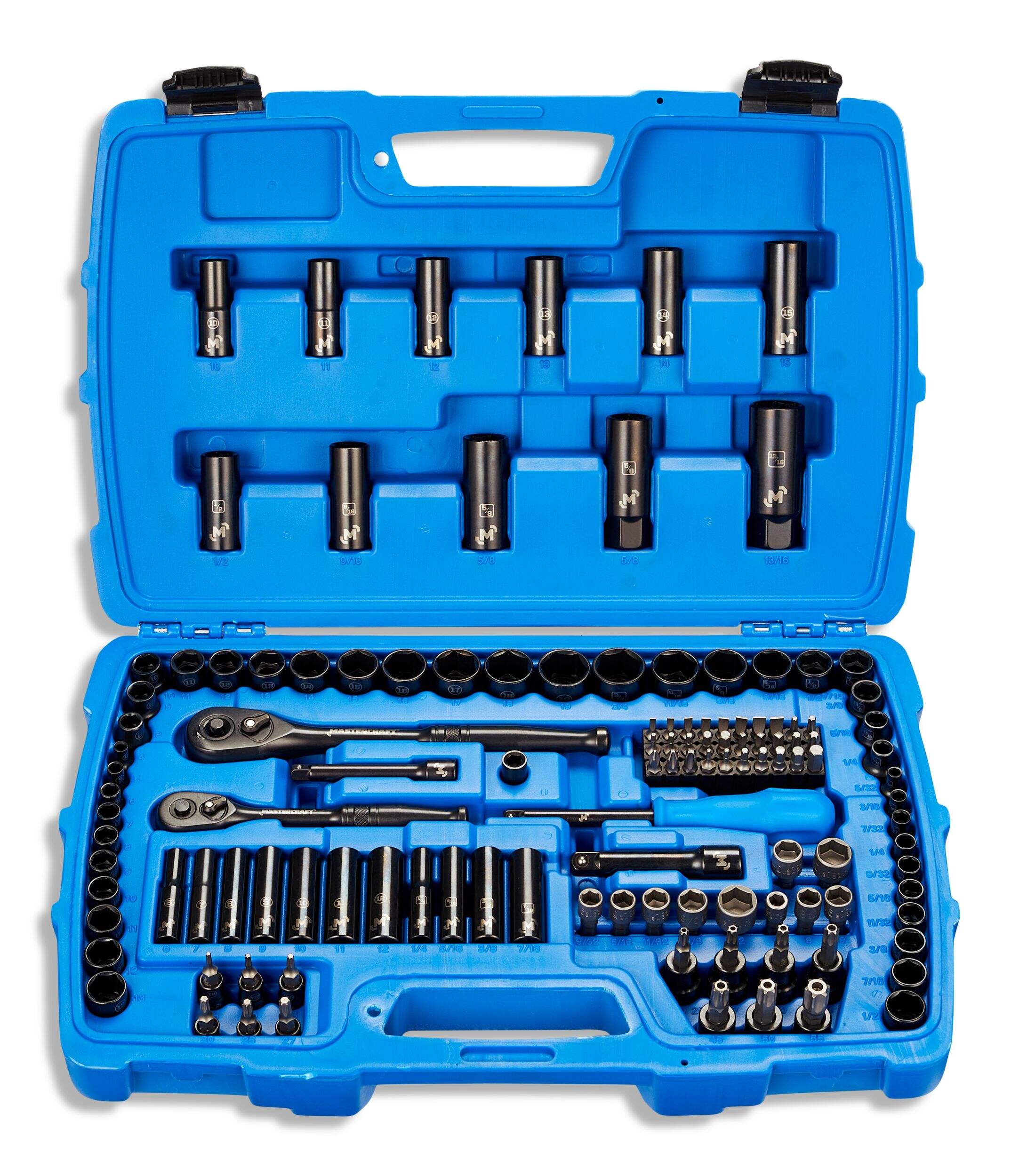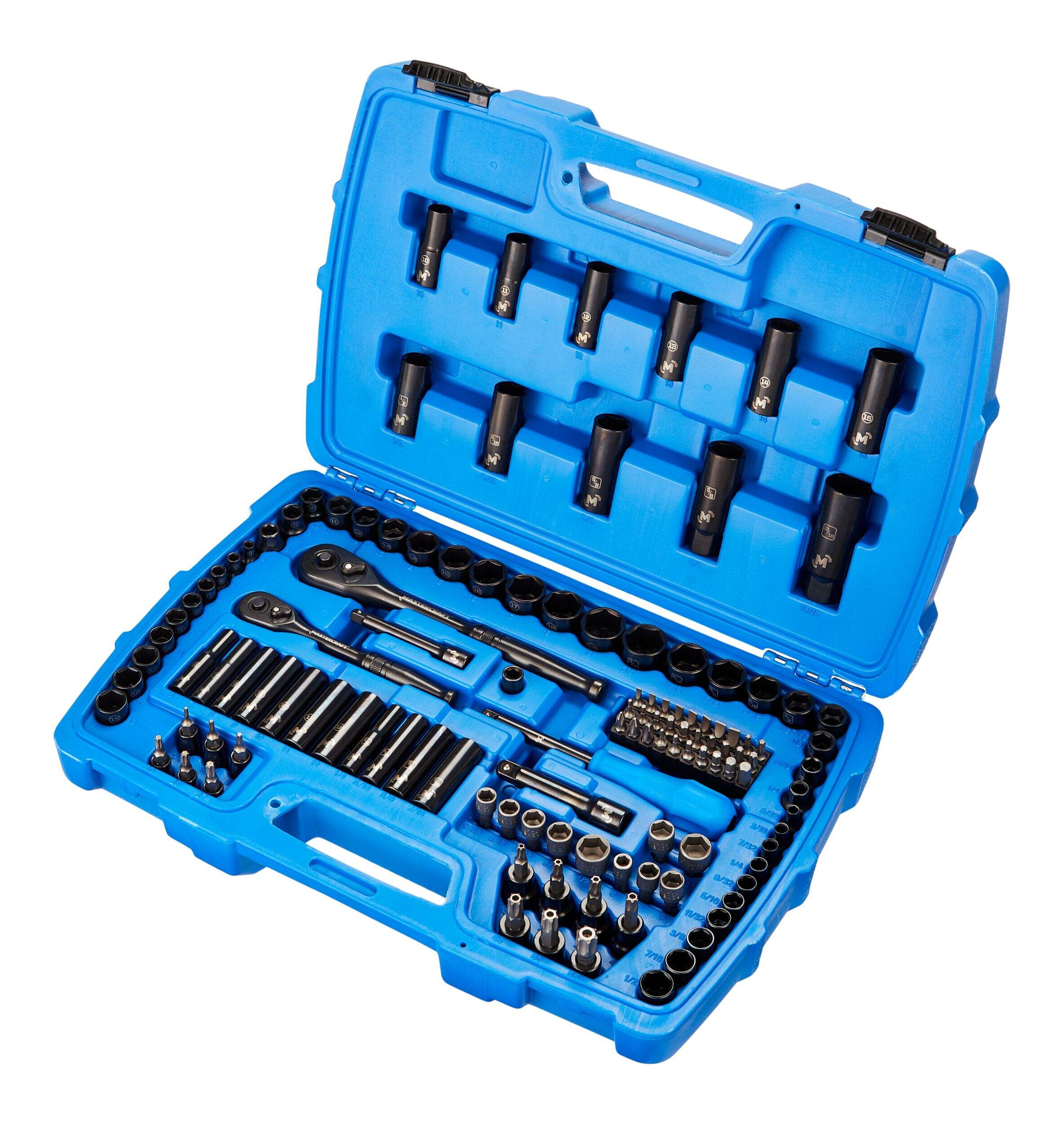 The Mastercraft Black Steel Socket Set features a comprehensive selection of standard, metric, shallow and deep sockets in 1/4" and 3/8-in drive sizes ideal for automotive repair and home maintenance tasks. Built to last, every item in this socket set has an industrial-grade black steel finish for maximum corrosion protection. A blow-moulded carrying case provides added convenience, protection and portability.