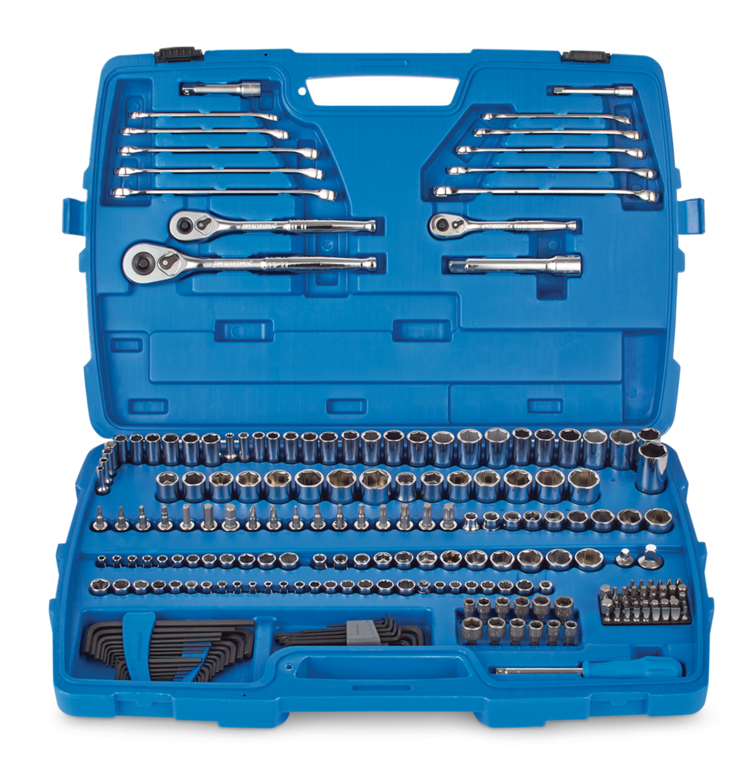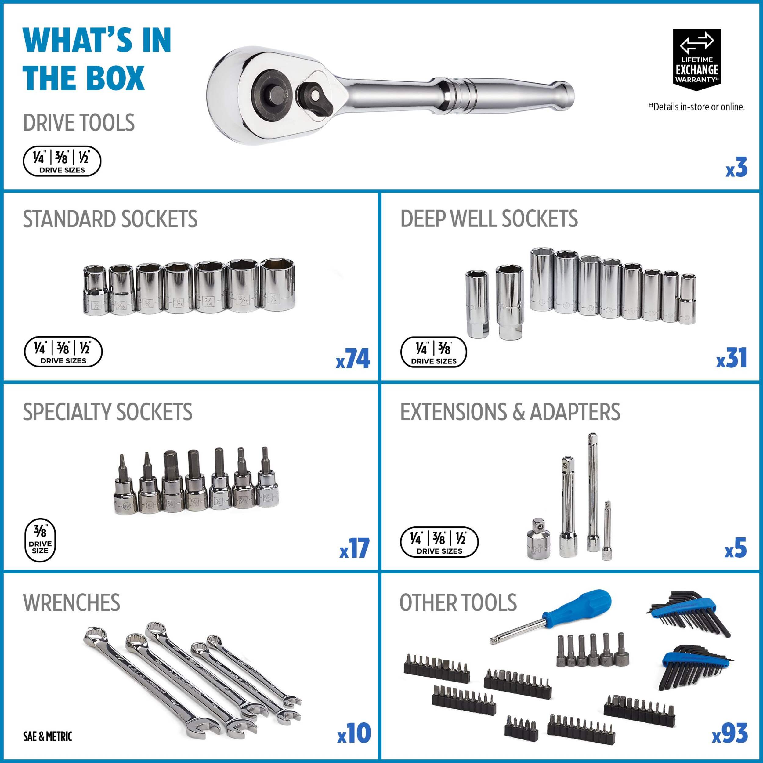 Contains an assortment of standard, metric, shallow, and deep sockets in the following drive sizes: 1/4" (70 pieces), 3/8" (54 pieces), and 1/2" (17 pieces)