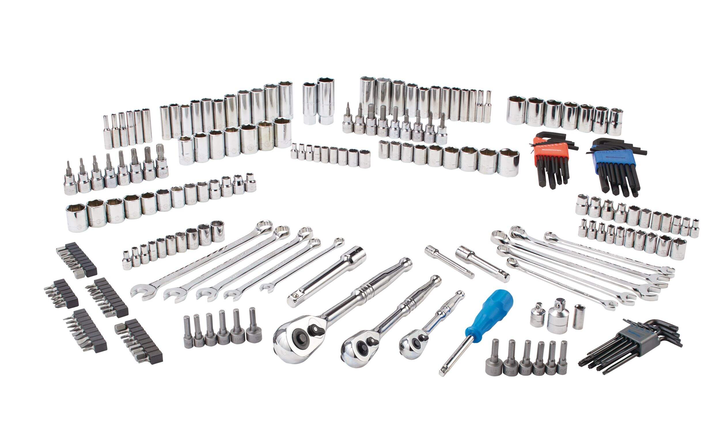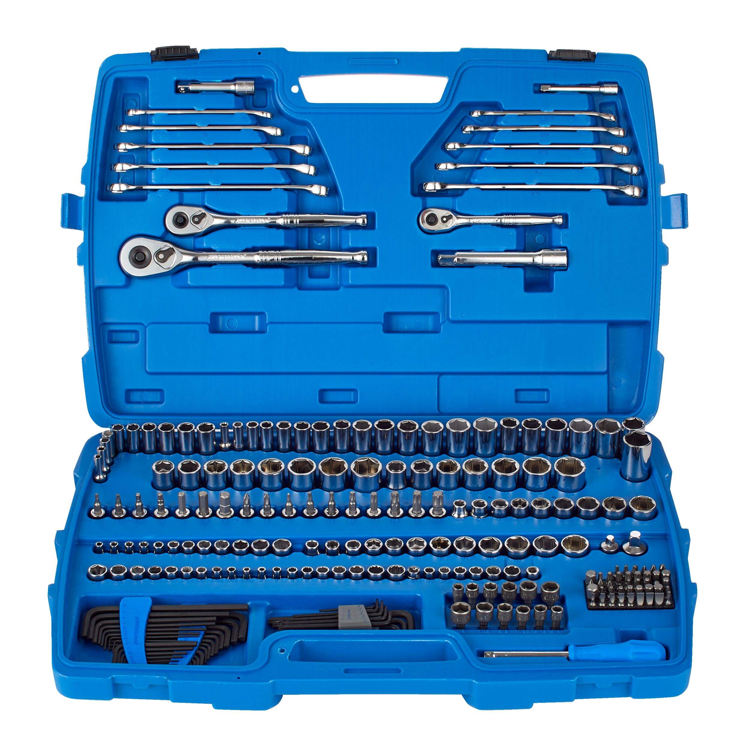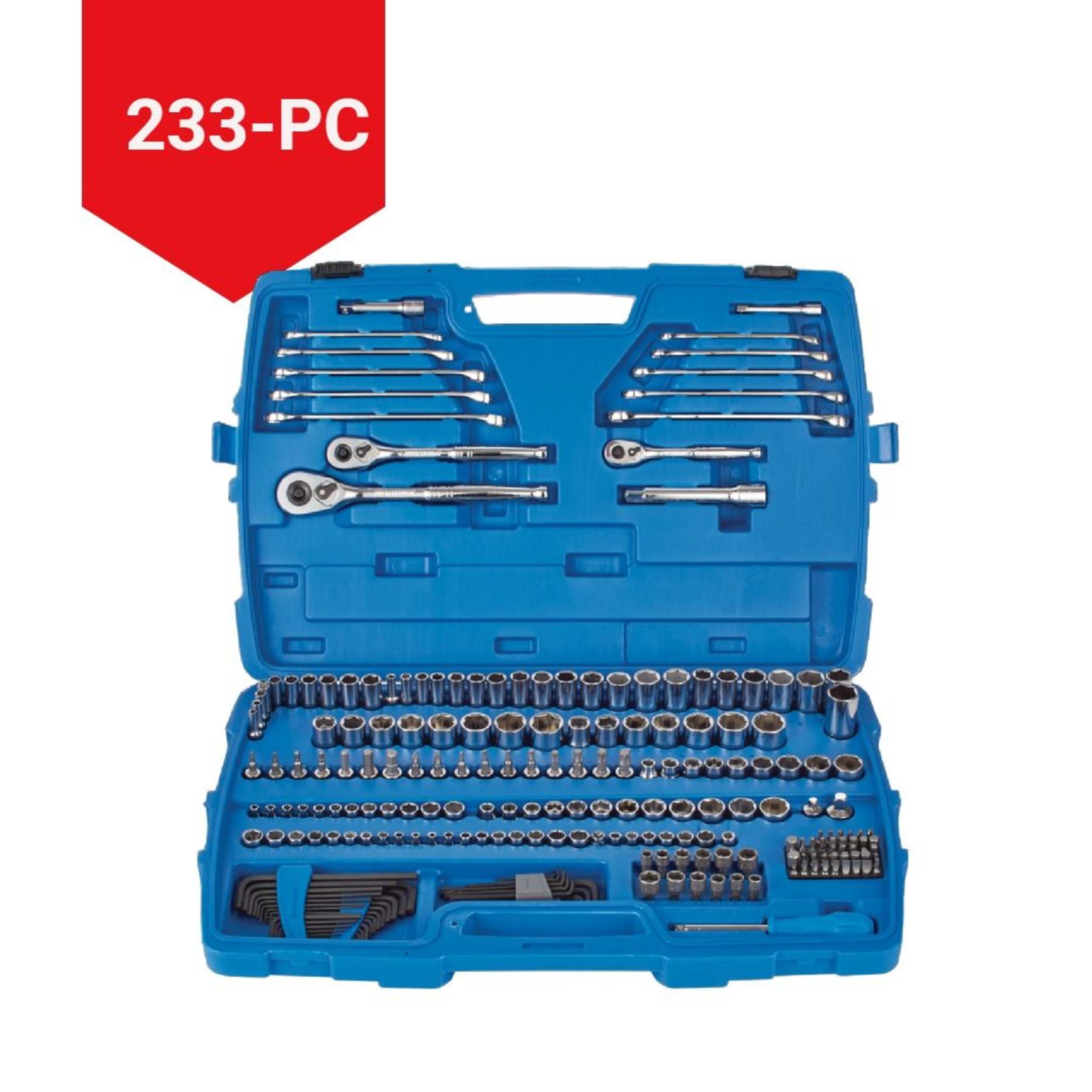 Expand your tool library with this 233-piece Mastercraft Socket Set. This mechanic’s tool set comes with screwdriver bits, combination wrenches, accessories, and plenty of sockets. The set includes SAE and metric wrench sizes and an assortment of standard, metric, shallow, and deep sockets. The wrenches in this set include a 60-tooth ratchet mechanism with a 6° swing arc. A quick-release button and reversing lever allow the ratchet to securely hold sockets and release them when needed. The sockets and accessories included in the set all feature fully polished chrome finishes for added rust resistance. A blow-moulded carrying case allows for convenient transport and storage.