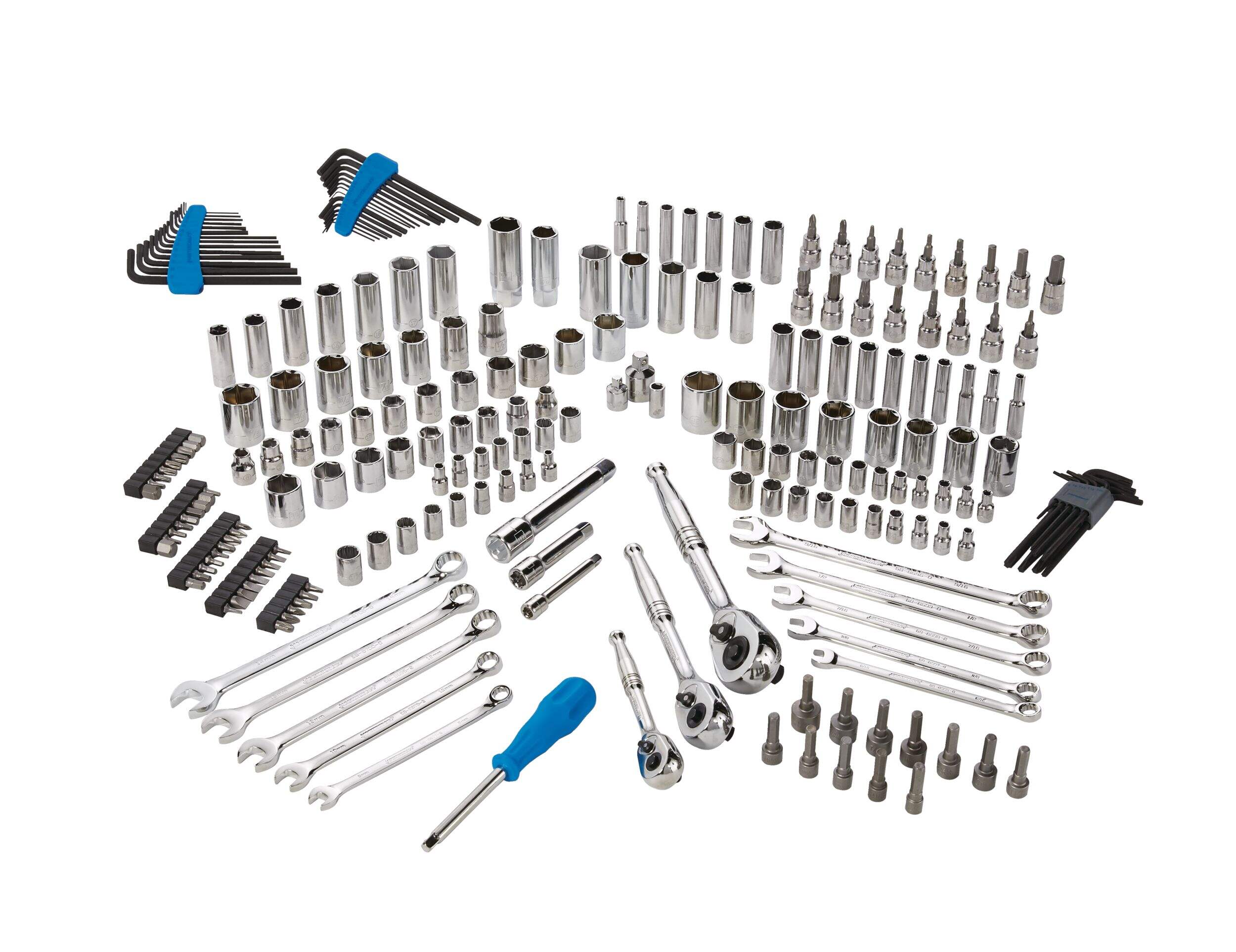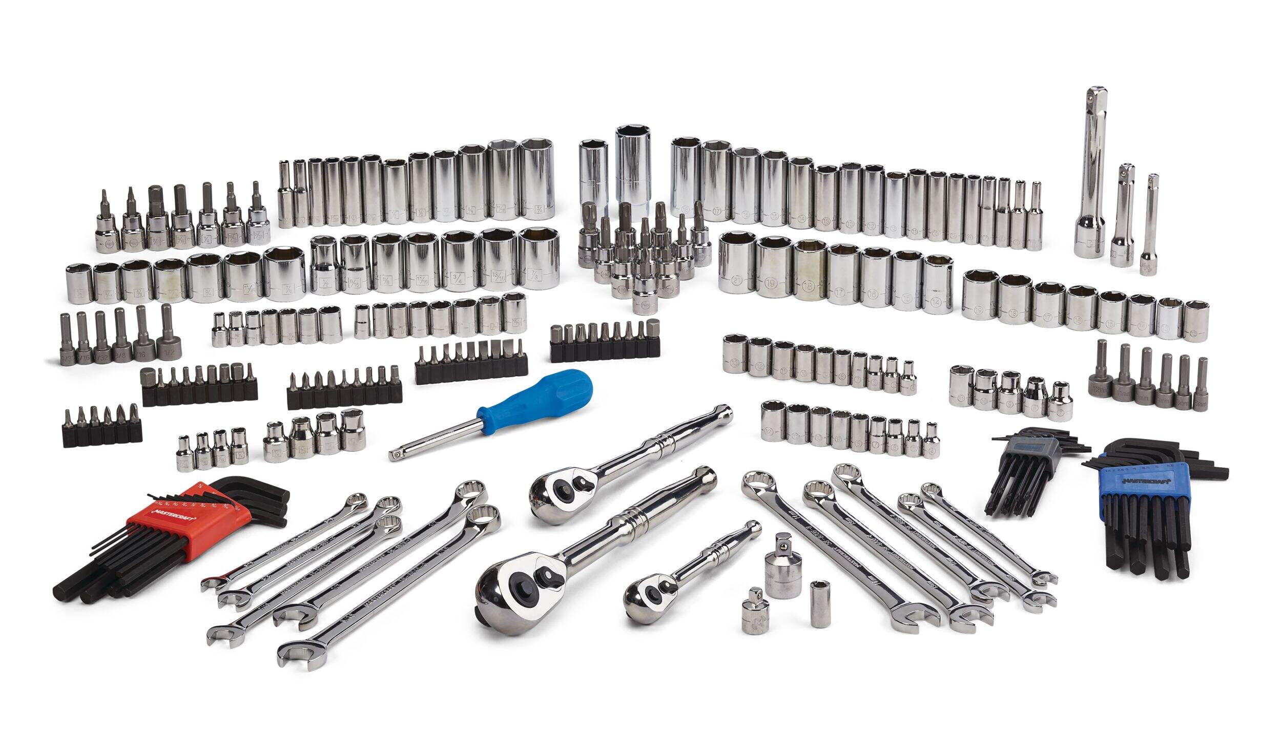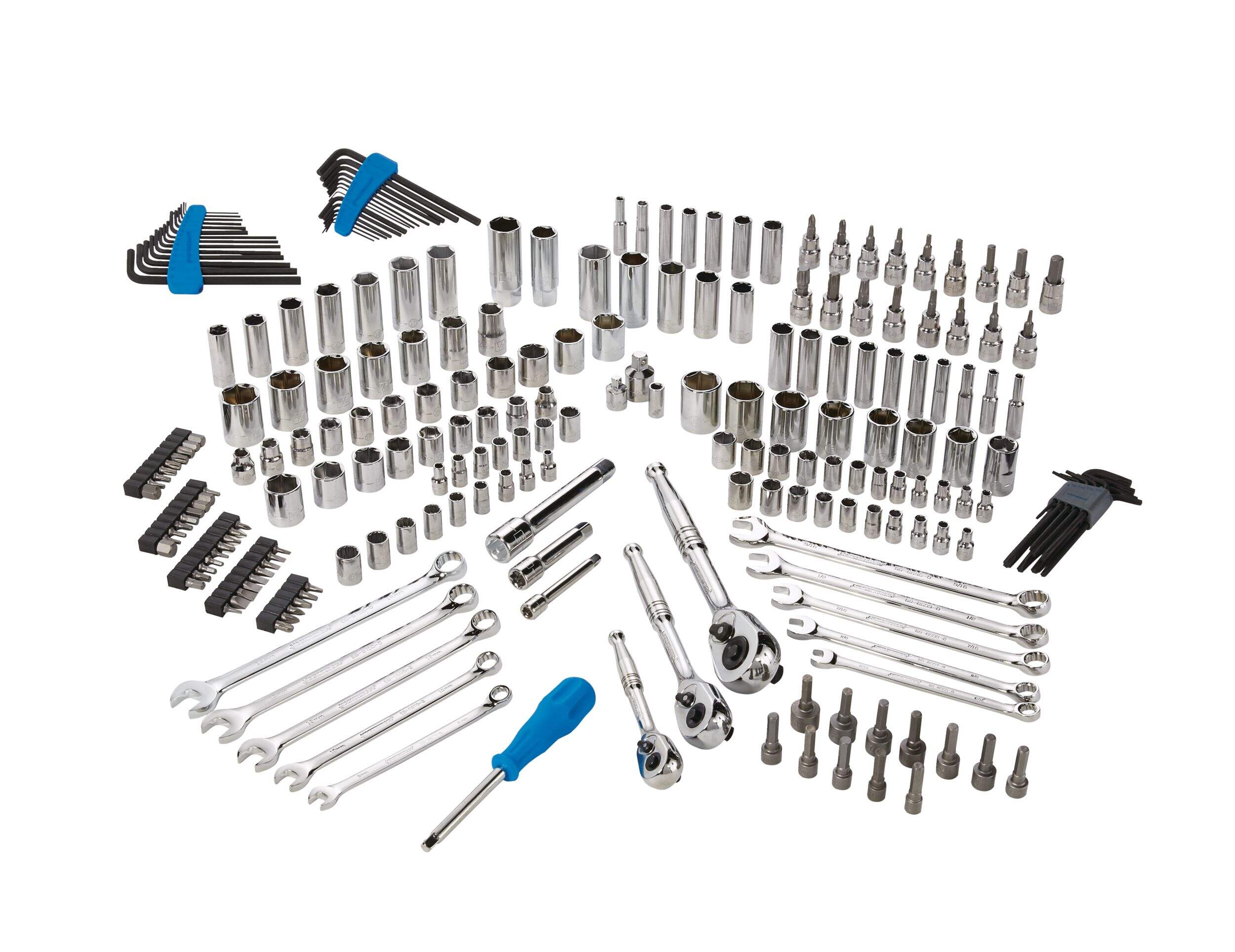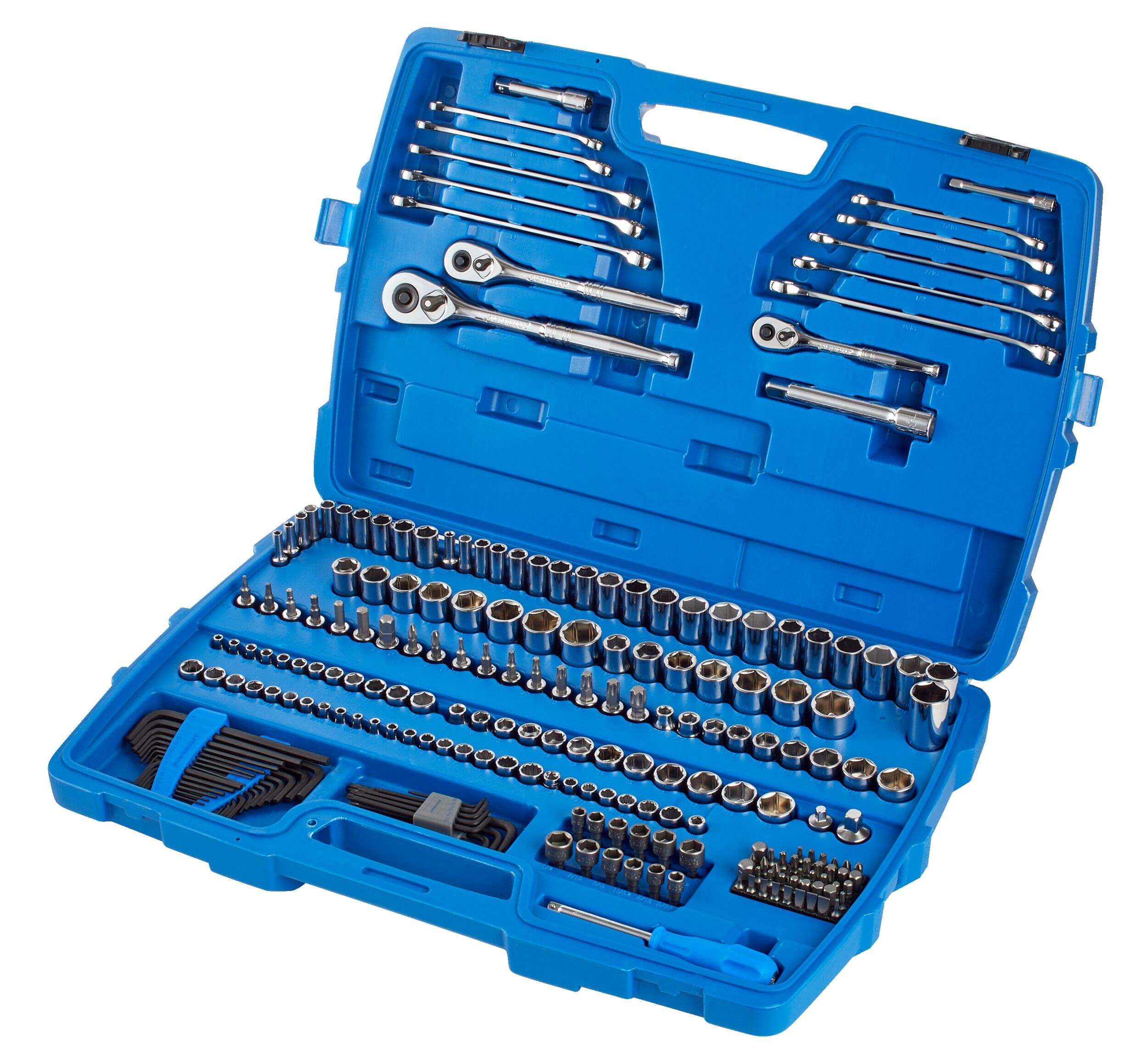 Expand your tool library with this 233-piece Mastercraft Socket Set. This mechanic’s tool set comes with screwdriver bits, combination wrenches, accessories, and plenty of sockets. The set includes SAE and metric wrench sizes and an assortment of standard, metric, shallow, and deep sockets. The wrenches in this set include a 60-tooth ratchet mechanism with a 6° swing arc. A quick-release button and reversing lever allow the ratchet to securely hold sockets and release them when needed. The sockets and accessories included in the set all feature fully polished chrome finishes for added rust resistance. A blow-moulded carrying case allows for convenient transport and storage.