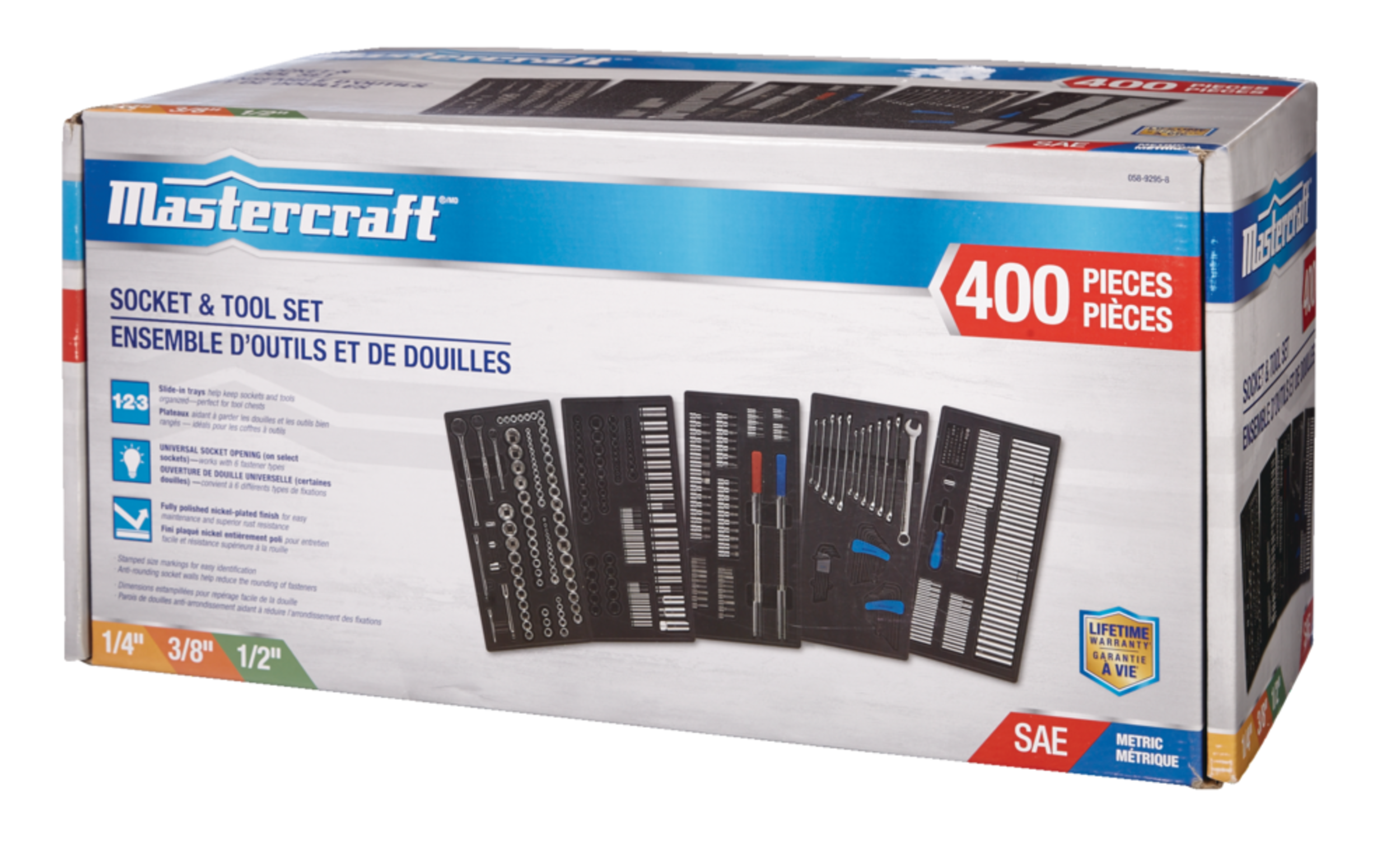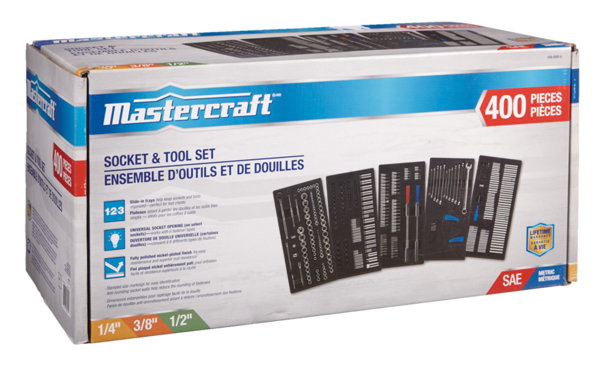 Mastercraft Socket Set features 1/4", 3/8" and 1/2" drive sizes
