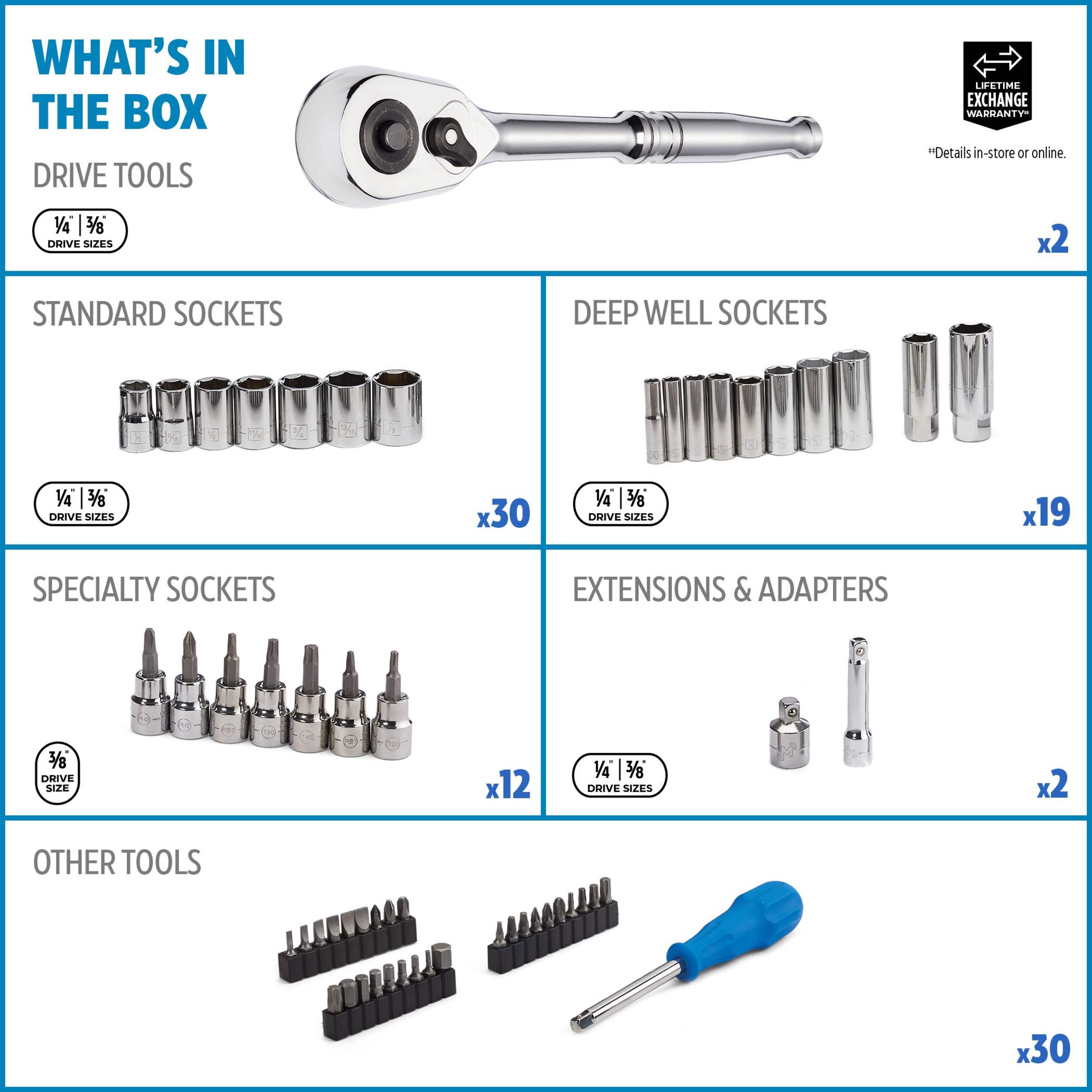 Contains an assortment of standard, metric, shallow, and deep sockets in the following drive sizes: 1/4" (30 pieces) and 3/8" (35 pieces)