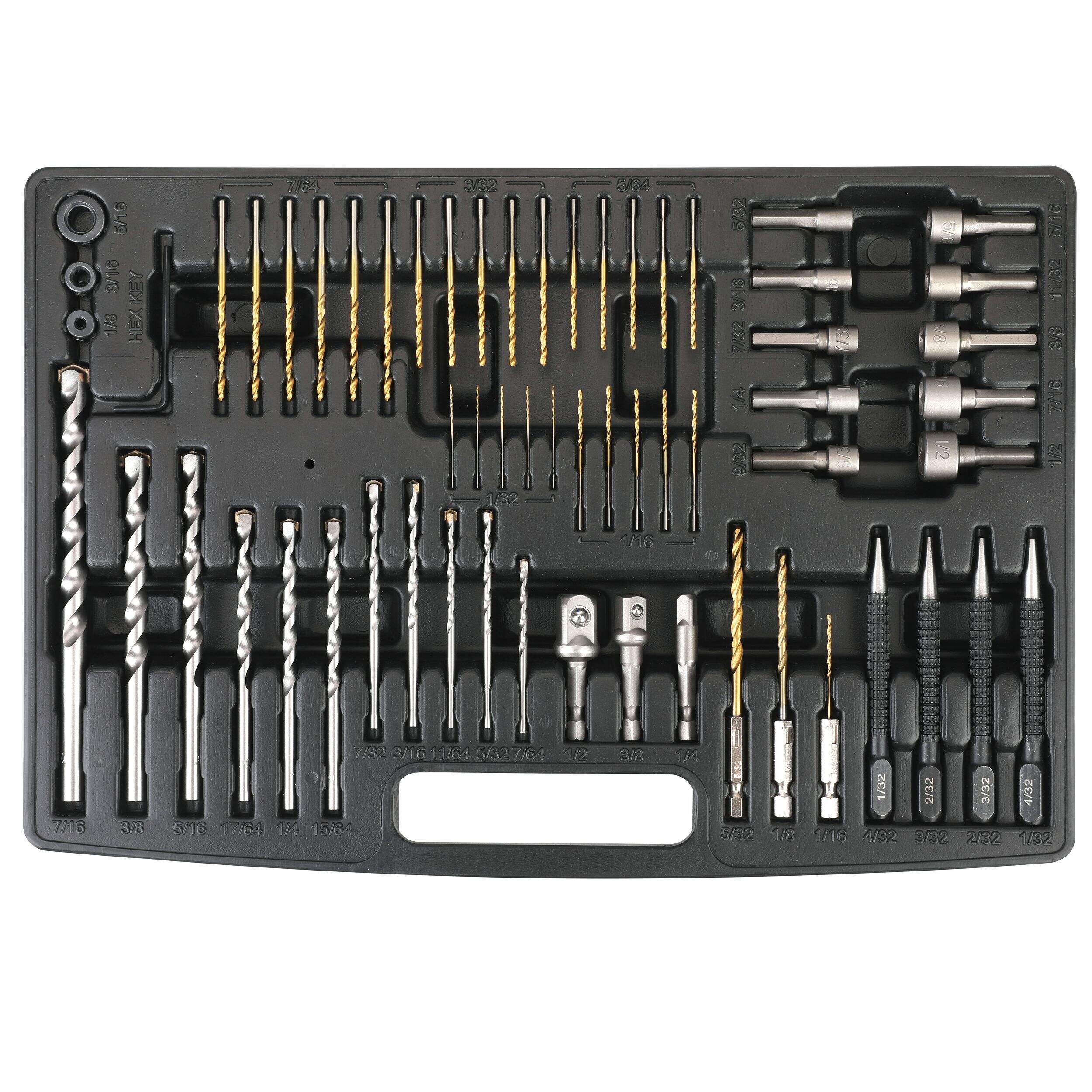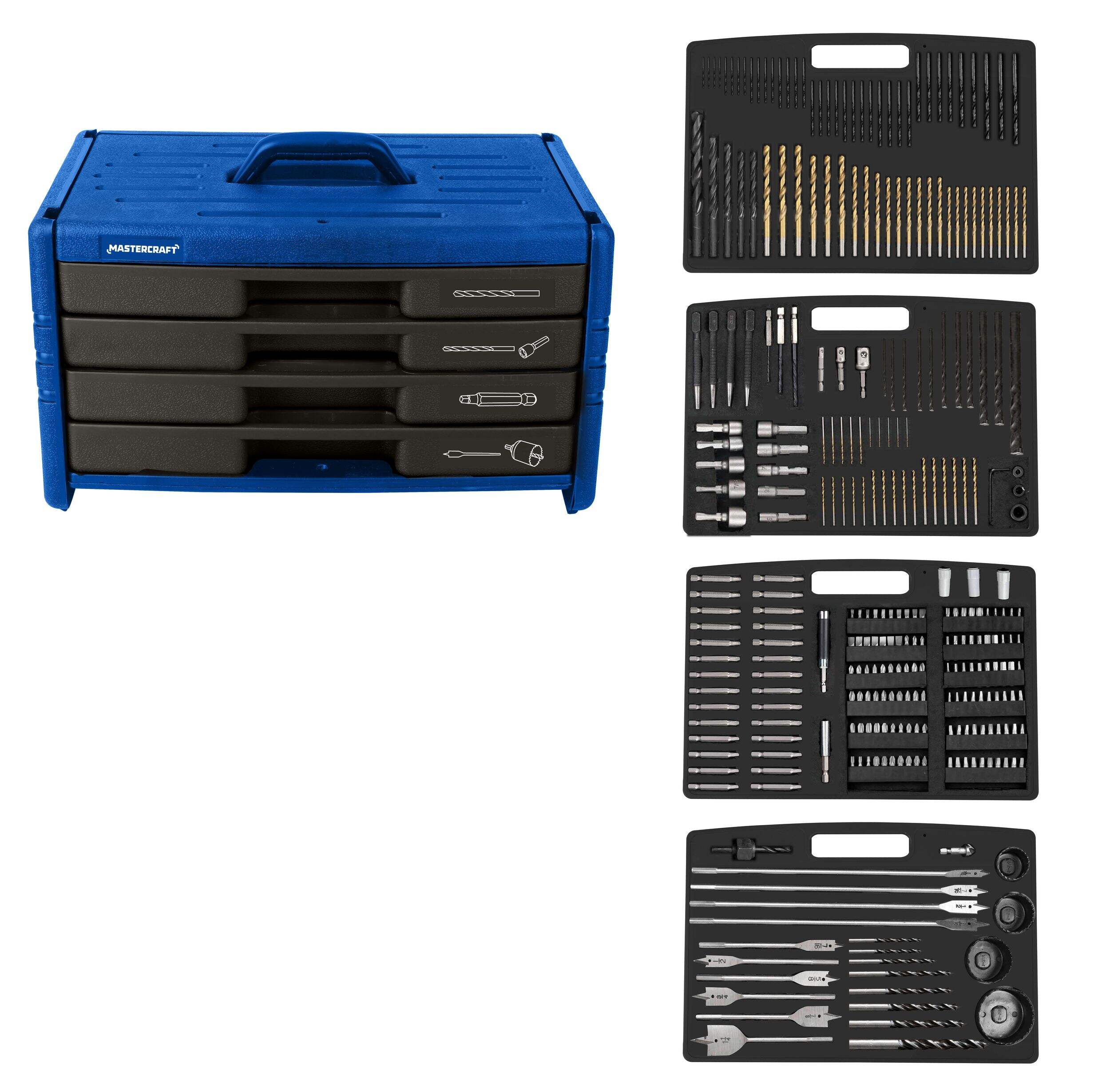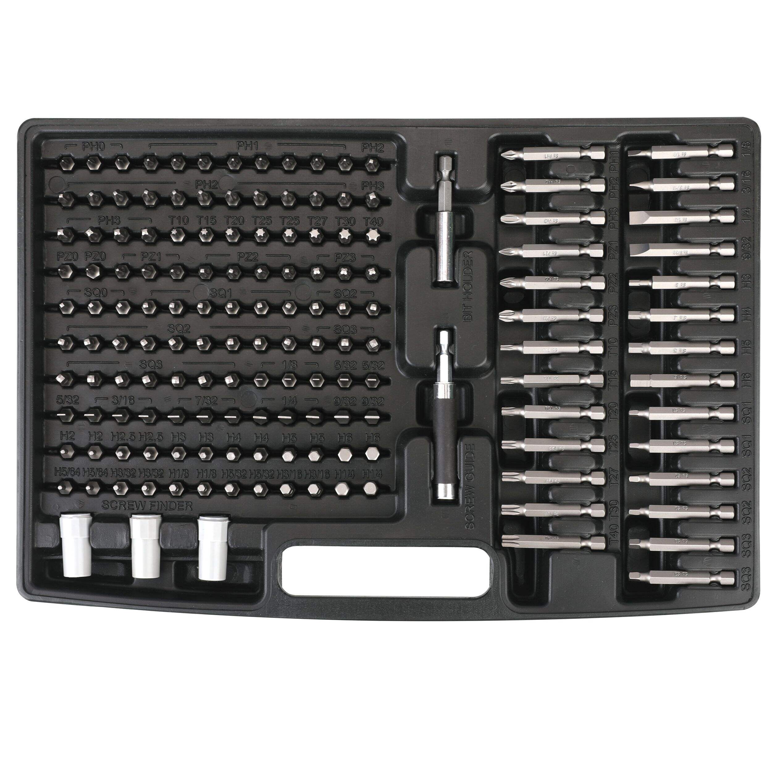 Includes: (51) titanium-coated drill bits, (42) black oxide drill bits, (11) masonry drill bits, (8) brad point drill bits, (6) 6" (15.2 cm) spade drill bits, (4) 12" (30.4 cm) spade drill bits, (3) hex shank titanium-coated drill bits, (120) 1" (2.5 cm) screwdriver bits, (27) 2" (5 cm) screwdriver bits, (10) nut drivers, (4) center punches, (4) hole saws, (1) hole saw adaptor, (3) socket adaptors, (3) drill stoppers, (3) screw finders, (1) countersink, (1) magnetic screw guide, (1) hex key, and (1) magnetic bit holder