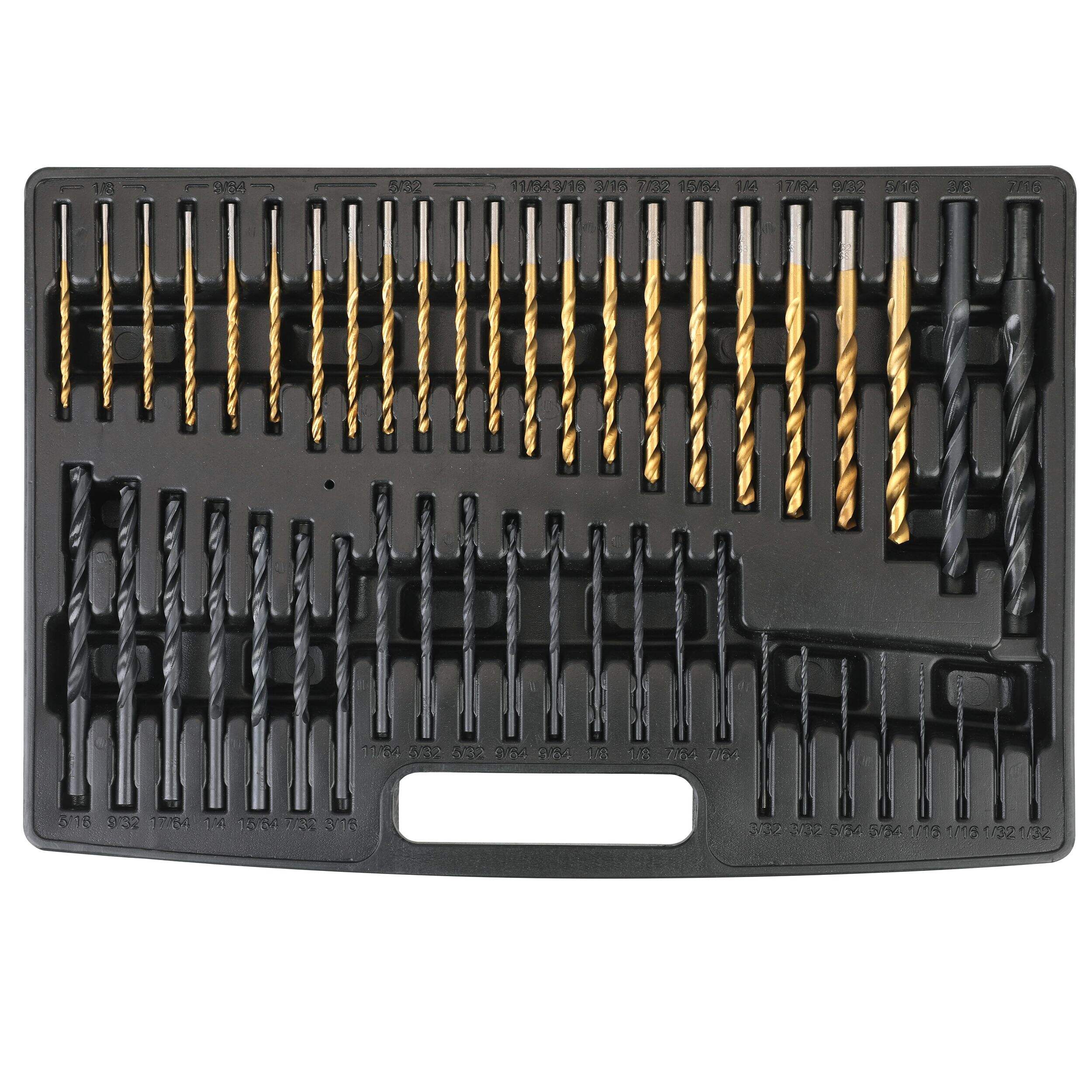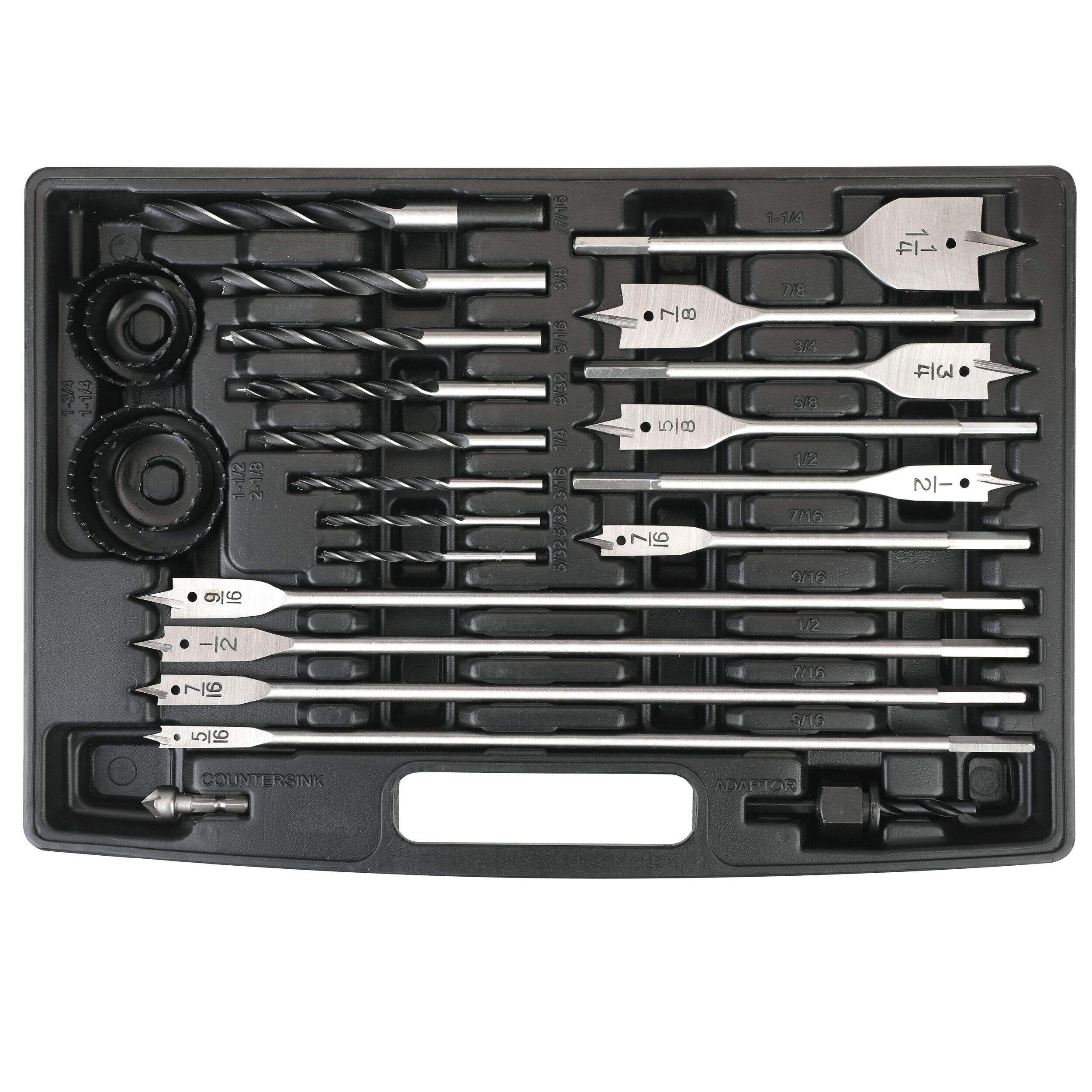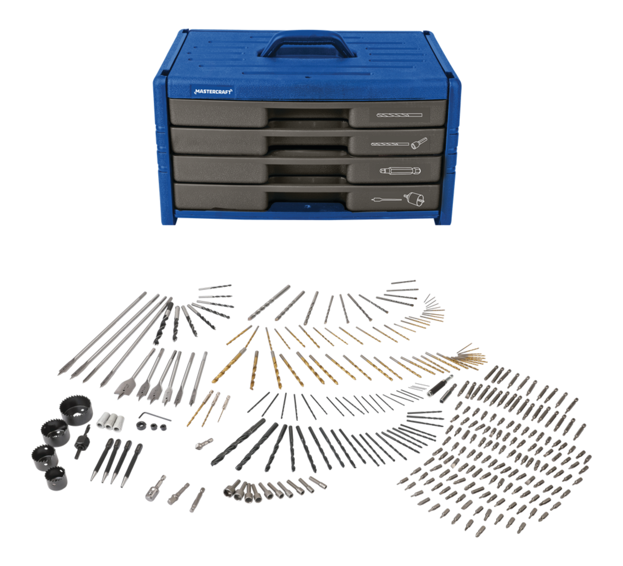 Includes: (51) titanium-coated drill bits, (42) black oxide drill bits, (11) masonry drill bits, (8) brad point drill bits, (6) 6" (15.2 cm) spade drill bits, (4) 12" (30.4 cm) spade drill bits, (3) hex shank titanium-coated drill bits, (120) 1" (2.5 cm) screwdriver bits, (27) 2" (5 cm) screwdriver bits, (10) nut drivers, (4) center punches, (4) hole saws, (1) hole saw adaptor, (3) socket adaptors, (3) drill stoppers, (3) screw finders, (1) countersink, (1) magnetic screw guide, (1) hex key, and (1) magnetic bit holder