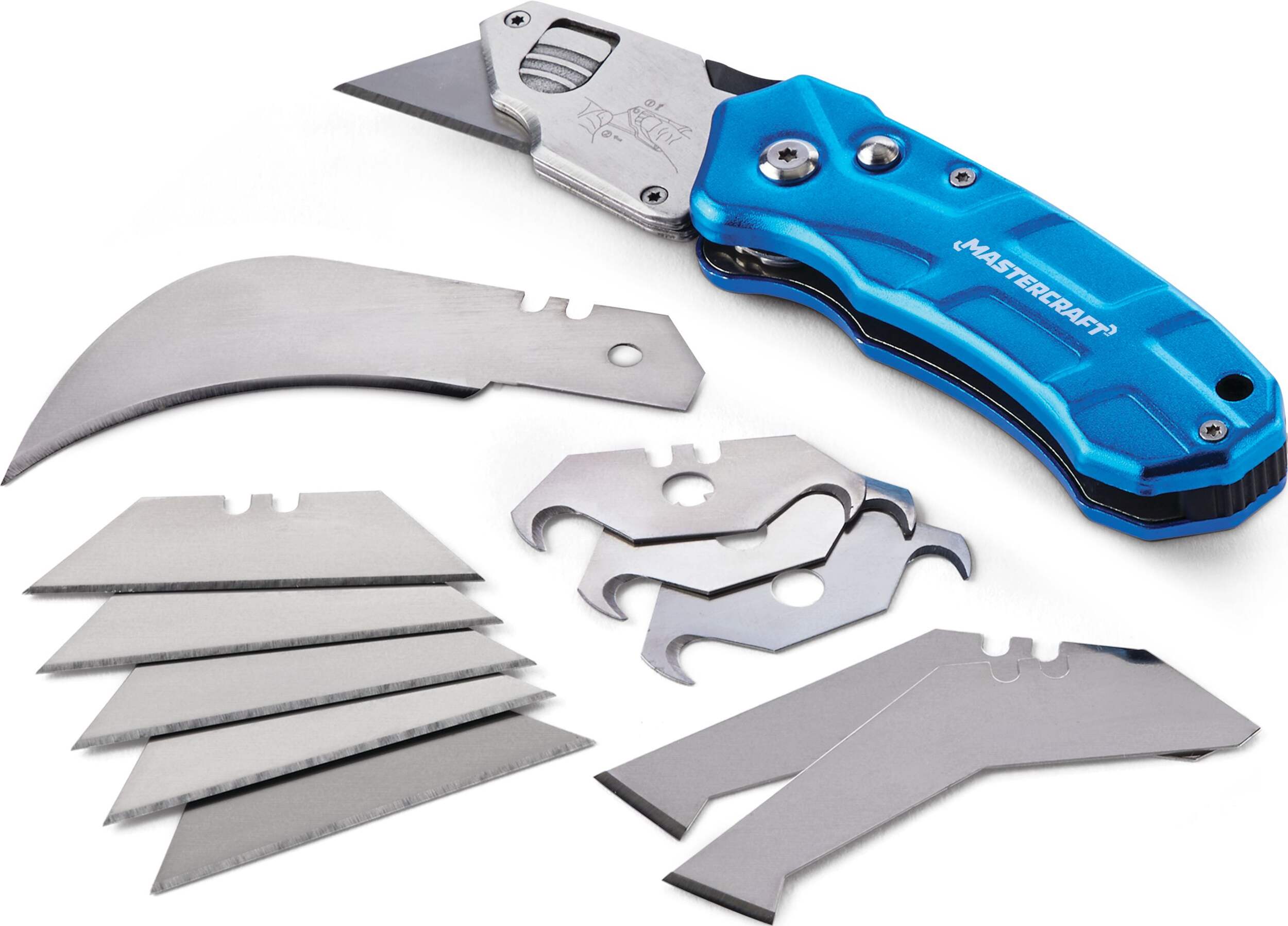 The Mastercraft Utility Knife Set offers an essential 13-piece knife set for cutting and scoring tasks. This multi-blade assortment includes standard, hook, scoring, and linoleum blades. These knives feature a quick change mechanism for swapping blades with ease, and have multiple handle lengths for improved comfort and control.