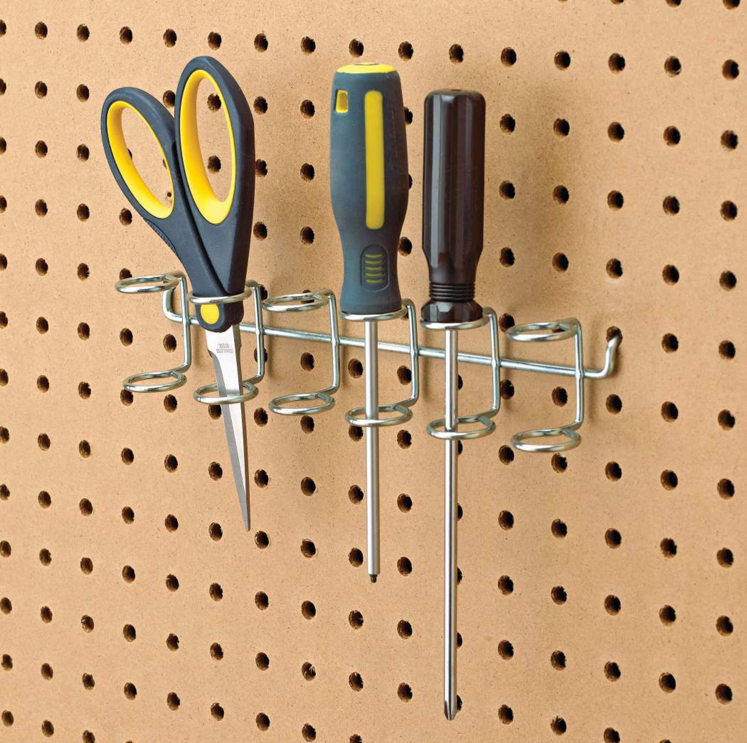 Store all your tools and accessories in one place with the Mastercraft Wall Mount Steel Tool Holder. This double-ring tool holder is ideal for use in garages, sheds, workshops, and basements. DIYers and professional handymen can maximize their storage space and quickly access their tools while working on a project. The pegboard tool holder stays firmly mounted on any sturdy surface. It easily fits any 1/8-inch (0.3 cm) and 1/4-inch (0.6 cm) pegboards. Constructed from high-quality steel, the holder resists corrosion and scratches in the long run. The multiple tool holder is available in a steel grey color and carries a one-year exchange warranty.