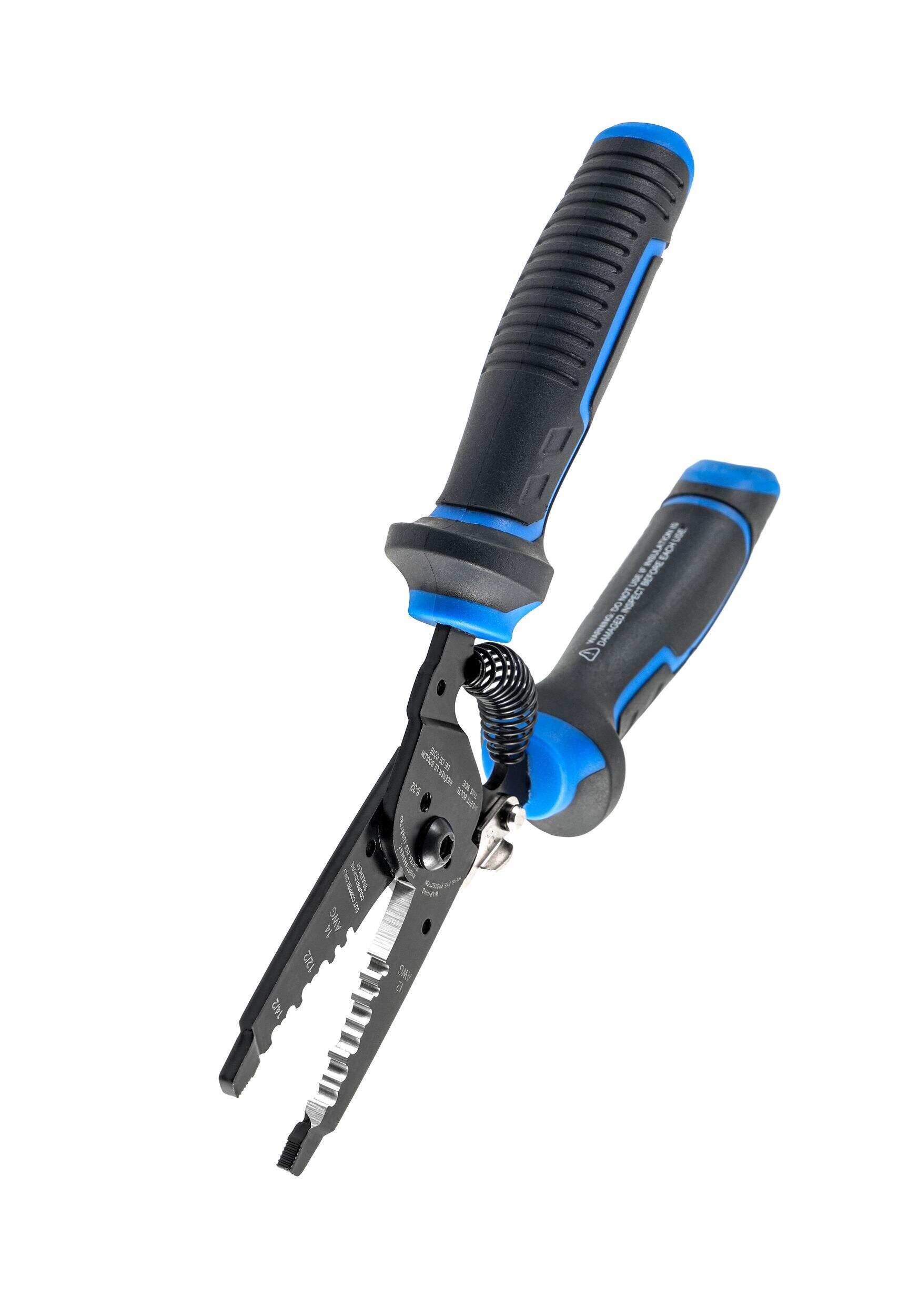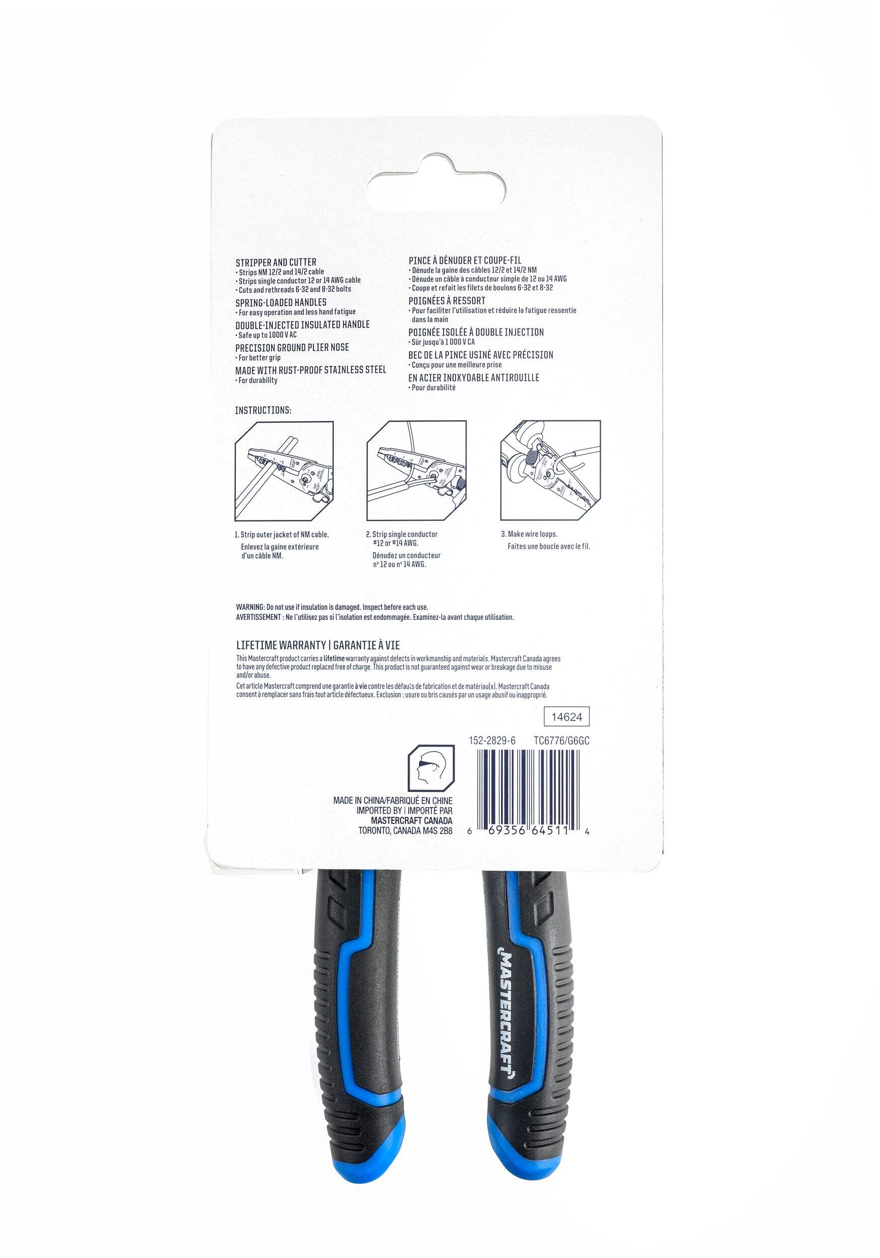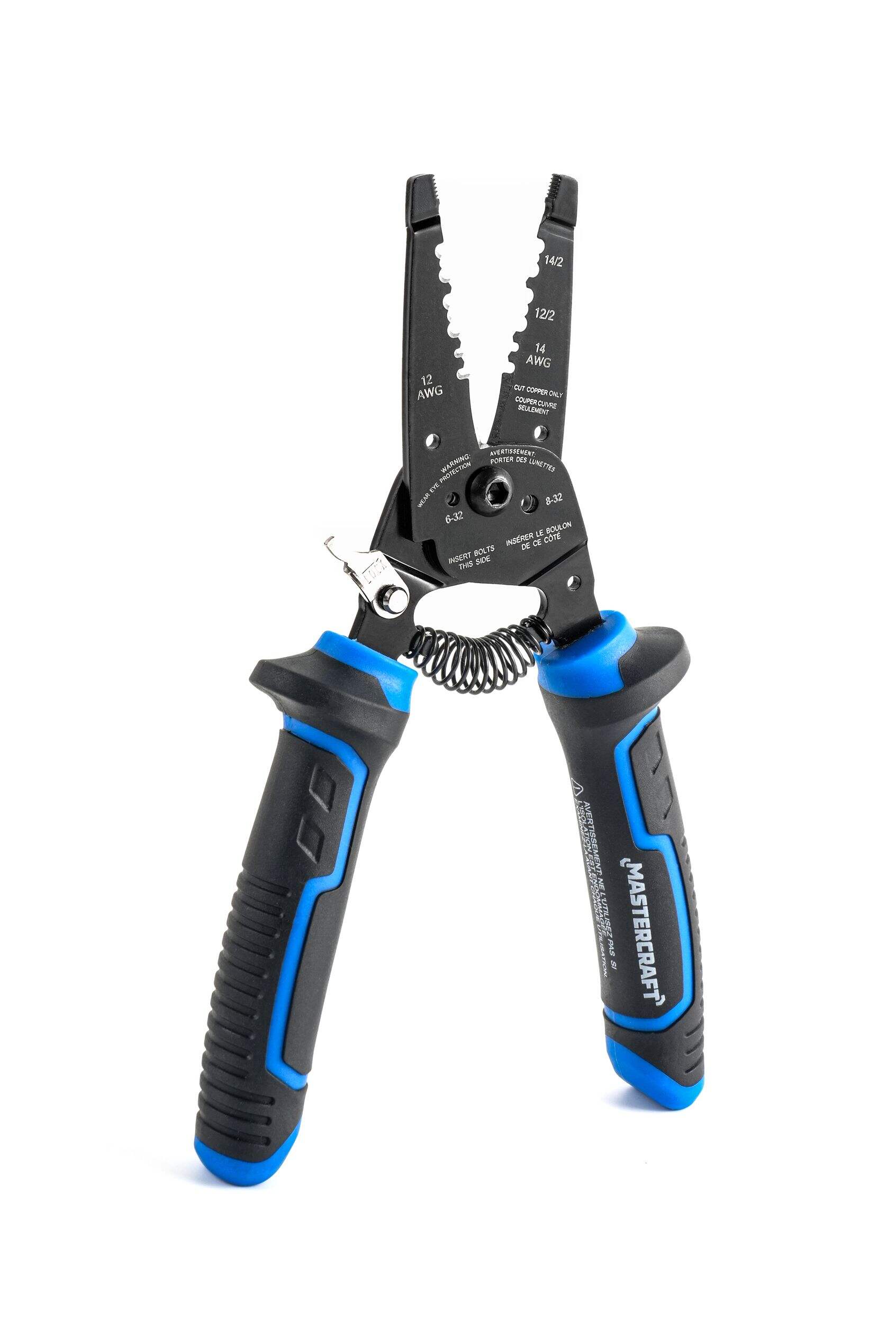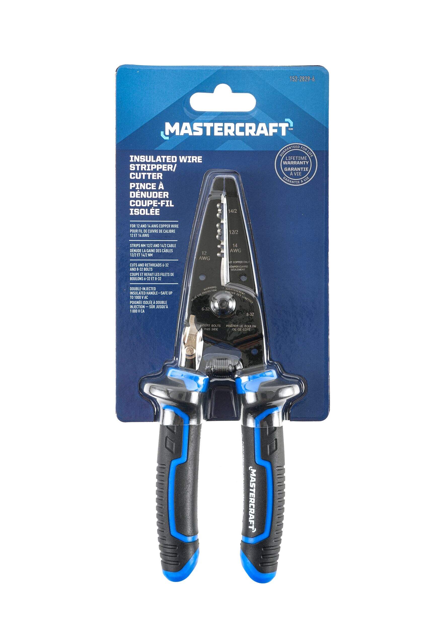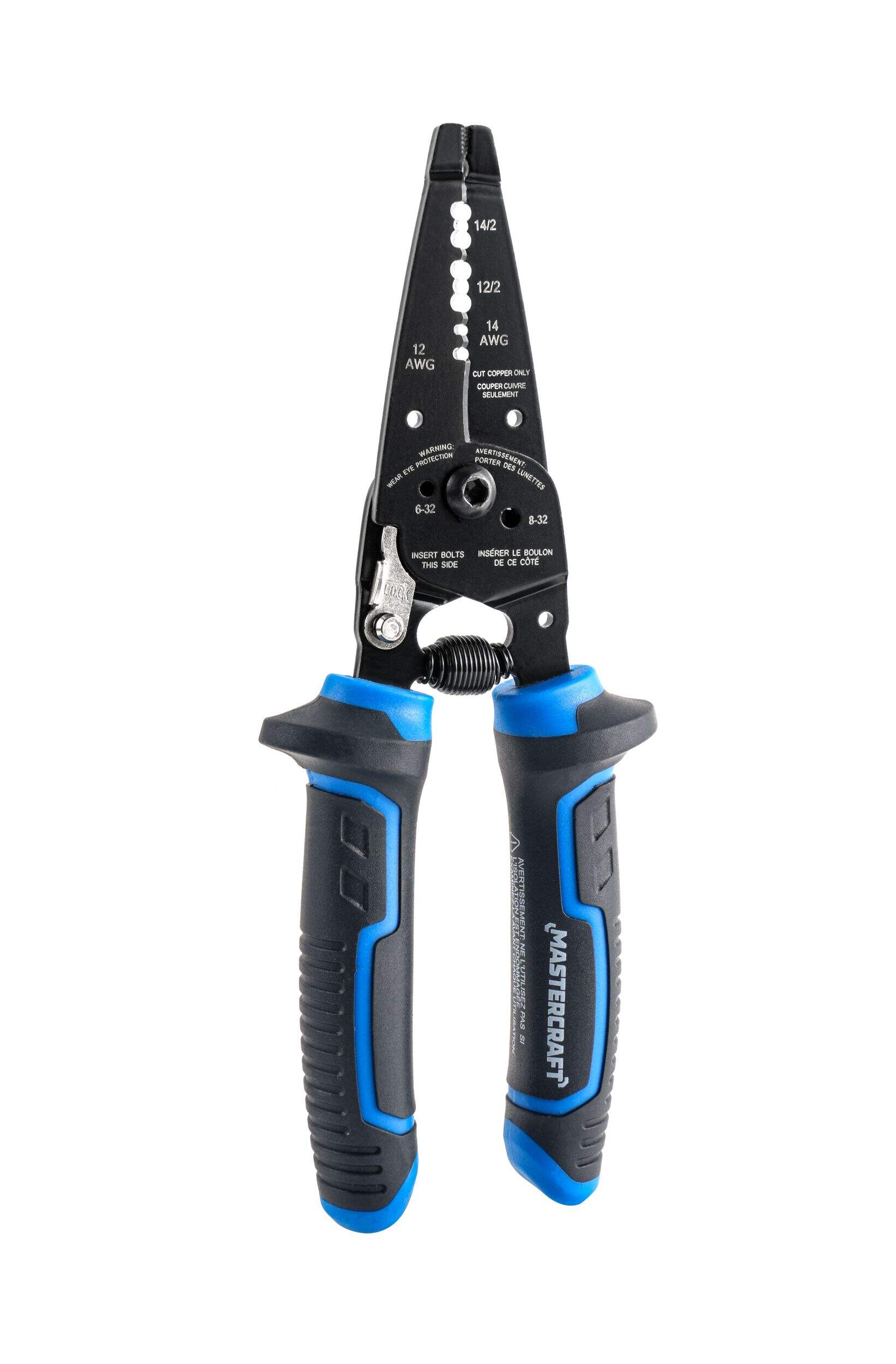 The Mastercraft Wire Stripper/Cutter is a versatile tool designed to assist with various tasks in electrical and general electrical work. It is perfect for homeowners who are involved in repairs and installations. This tool efficiently strips cables, cuts materials, and rethreads bolts. Featuring a comfortable soft grip for extended use and a sizing guide printed on the blade, this wire stripper/cutter is an essential addition to any well-equipped toolbox.