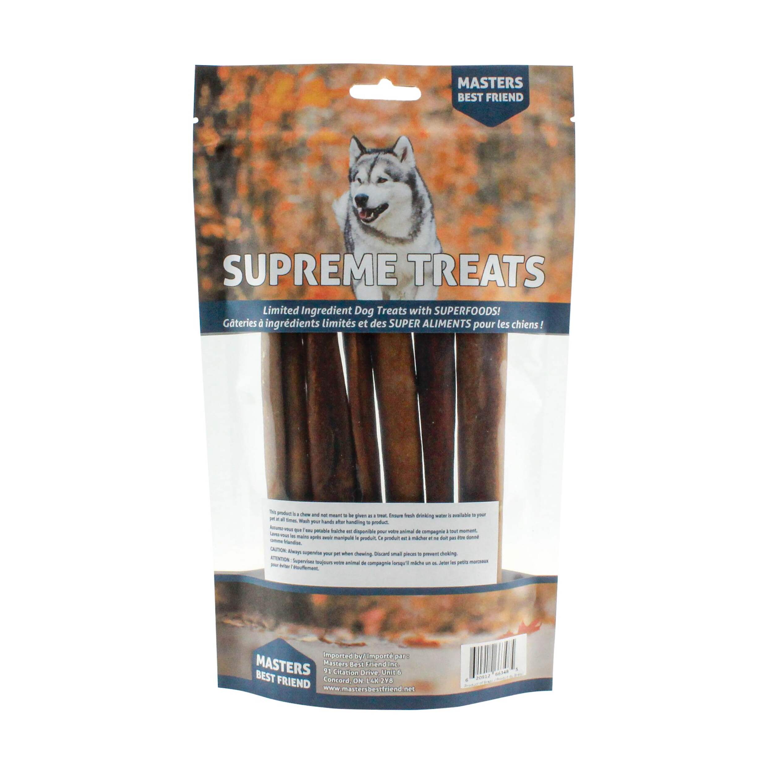 Treat your furry friend to a healthy snack with Masters Best Friend Supreme Treats Collagen Chew Dog Treats. These all-natural, high-protein treats are designed to support your dog's overall health. These 6-inch treats are made with a single ingredient, beef collagen, known to boost skin, coat, muscle, and bone health. Additionally, they promote healthy teeth and gums. Each pack contains six chew sticks, providing a wholesome treat for your dog to enjoy.