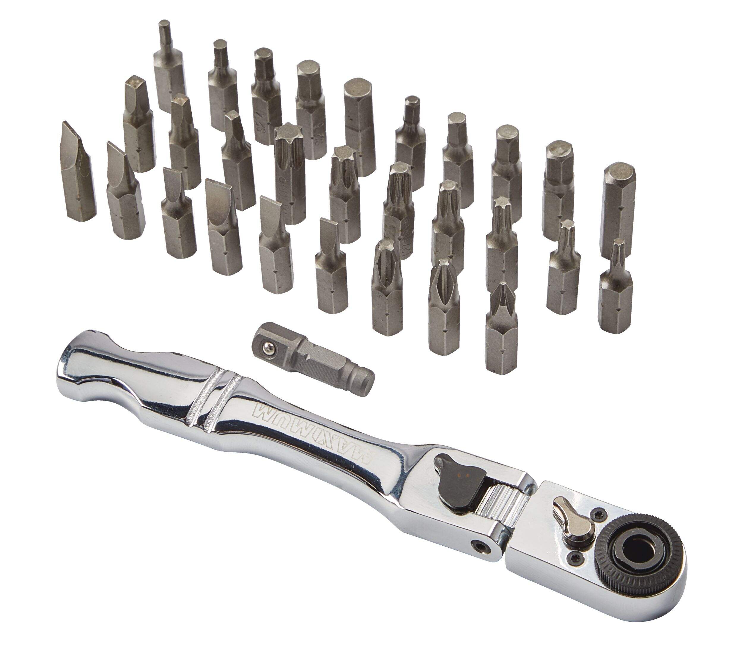 Contains 29 screwdriver bits, a 6” (15.24cm) 72-tooth flex-head ratchet, and a socket adaptor